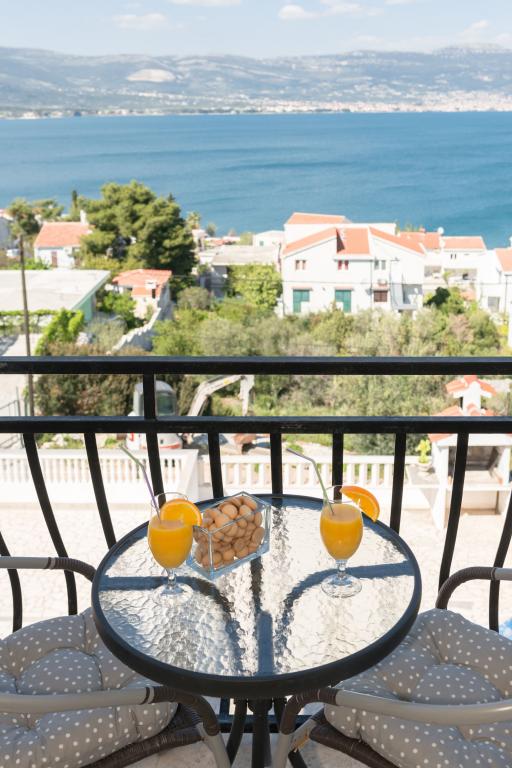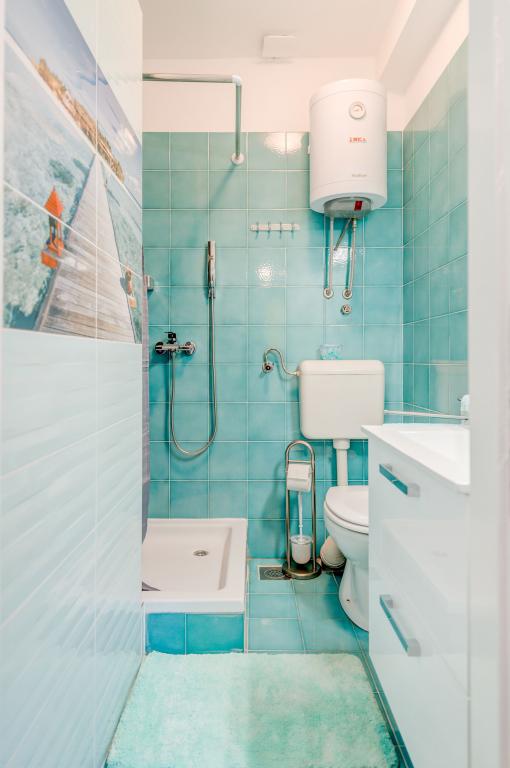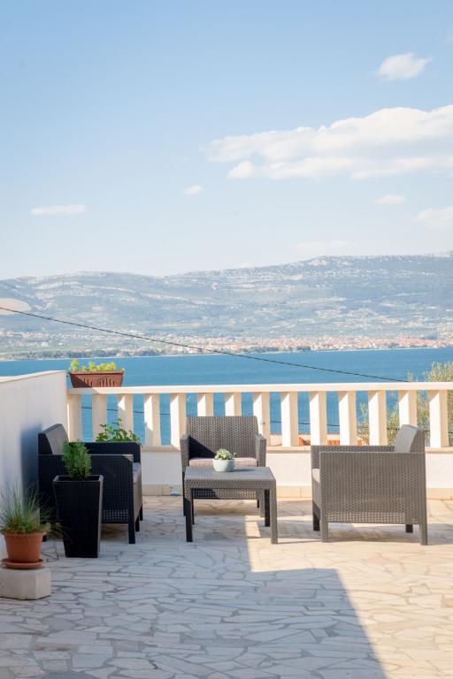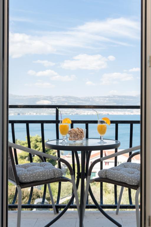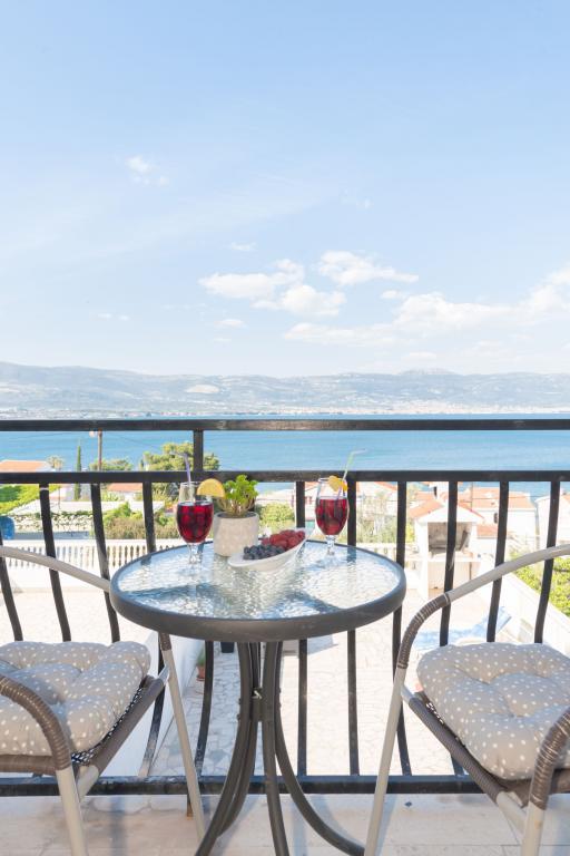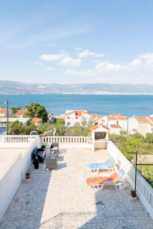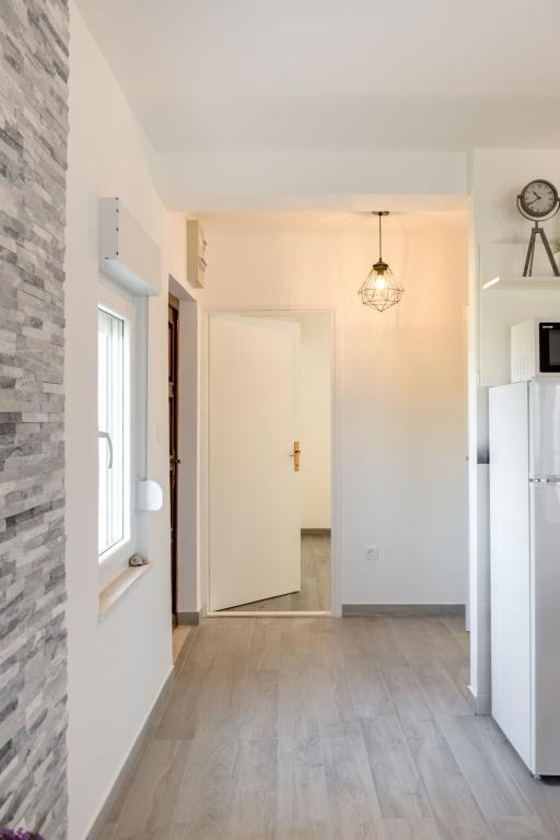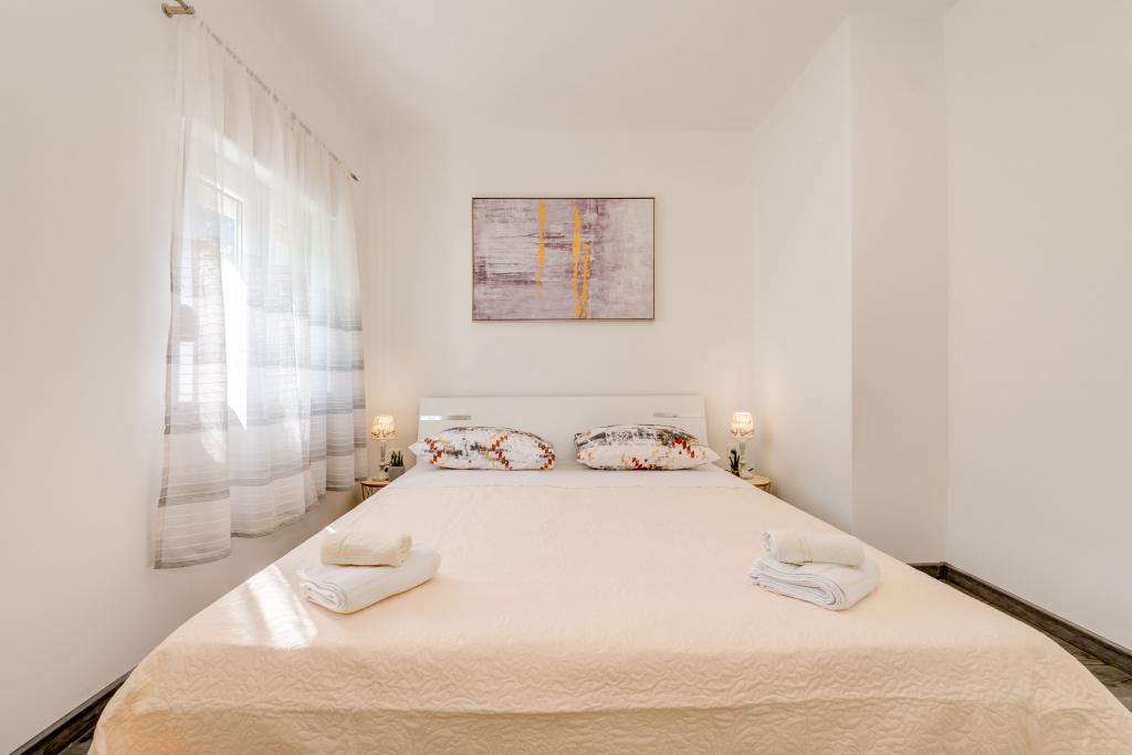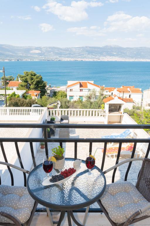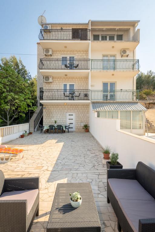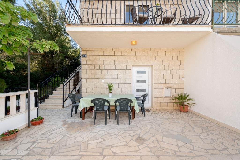 Kamnita hiša pritličje in tri nadstropja z veliko teraso in kaminom 70m od morja. Prvo in drugo nadstropje ali prvo in drugo stanovanje se oddajajo. Oba apartmaja sta enakovredno opremljena in vključujeta spalnico, dnevno sobo z raztegljivim kavčem, kuhinjo z vsem, kar je potrebno za pripravo hrane, vključno z mikrovalovno pečico, kopalnico in balkon s čudovitim pogledom na morje. Na zahtevo je na voljo dodatno ležišče in prenosna otroška posteljica. Neomejen internet, pametna satelitska TV. Klimatska naprava brez doplačila.