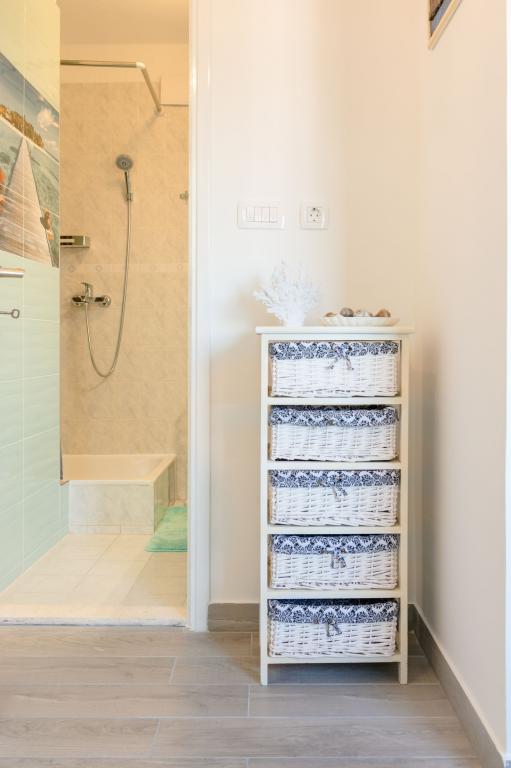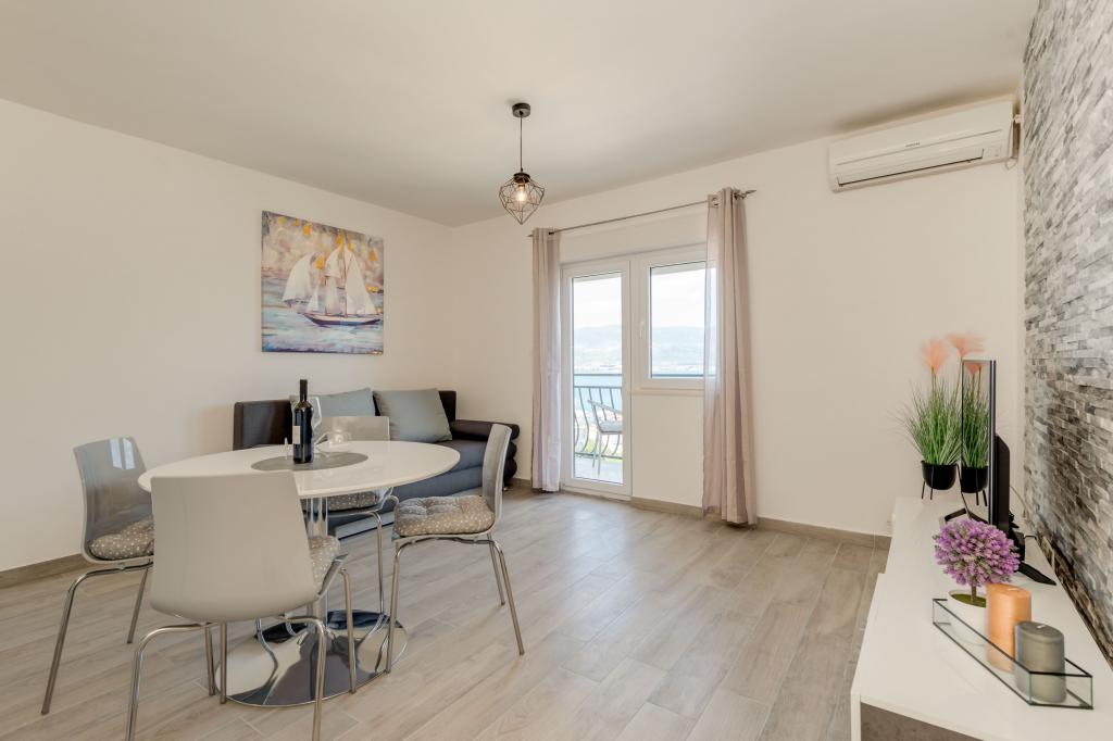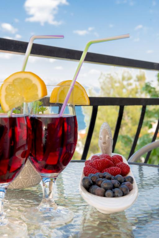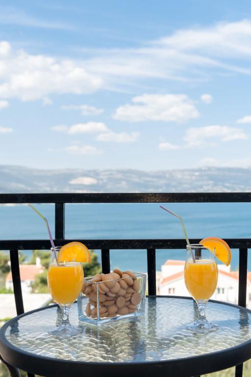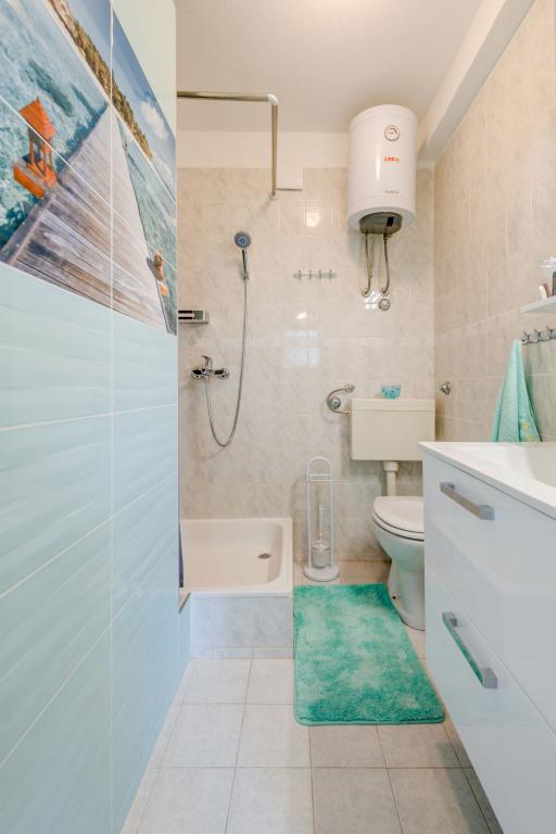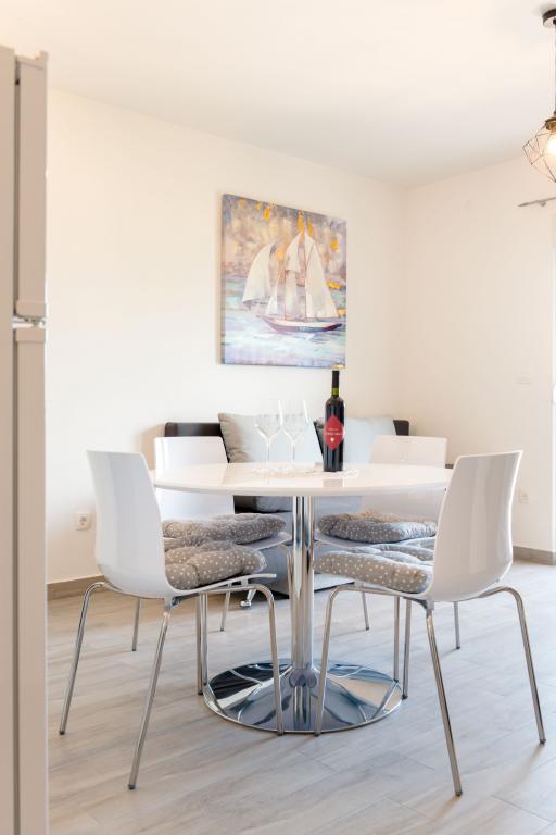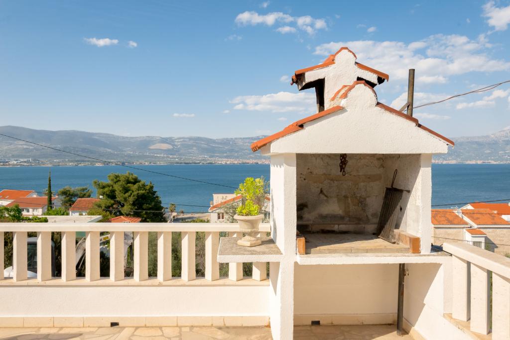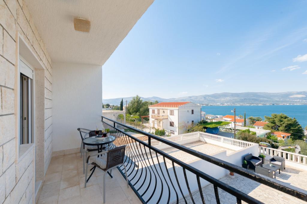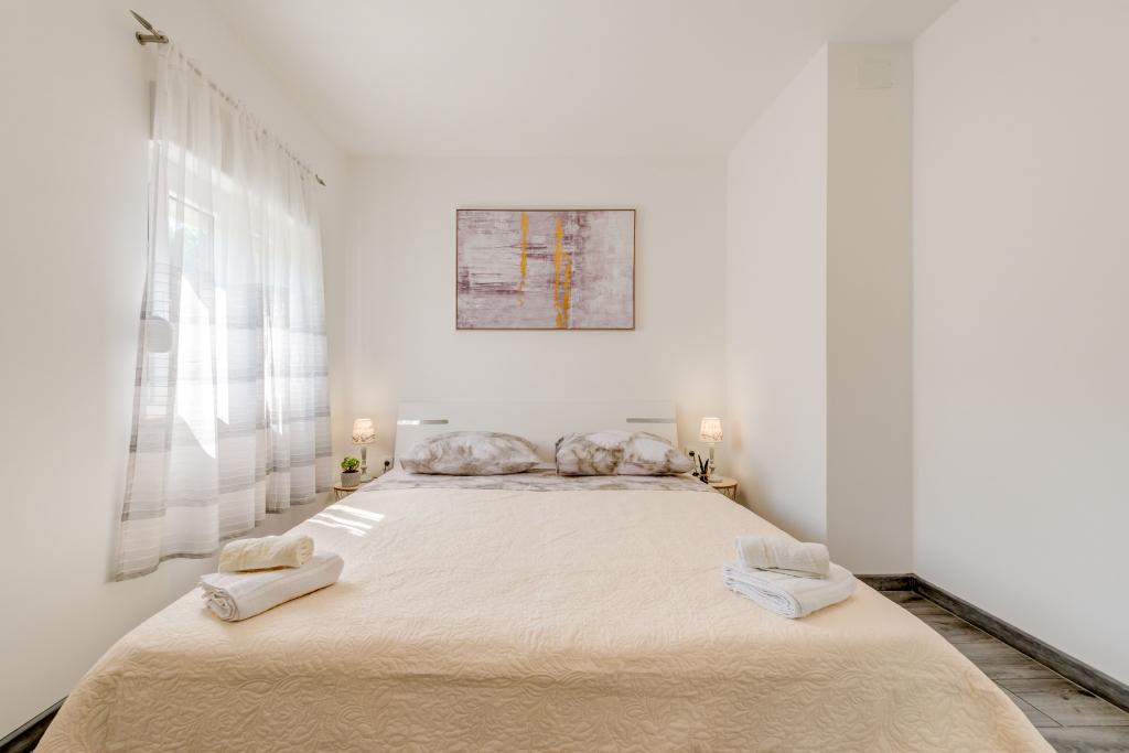 Kamnita hiša pritličje in tri nadstropja z veliko teraso in kaminom 70m od morja. Prvo in drugo nadstropje ali prvo in drugo stanovanje se oddajajo. Oba apartmaja sta enakovredno opremljena in vključujeta spalnico, dnevno sobo z raztegljivim kavčem, kuhinjo z vsem, kar je potrebno za pripravo hrane, vključno z mikrovalovno pečico, kopalnico in balkon s čudovitim pogledom na morje. Na zahtevo je na voljo dodatno ležišče in prenosna otroška posteljica. Neomejen internet, pametna satelitska TV. Klimatska naprava brez doplačila.