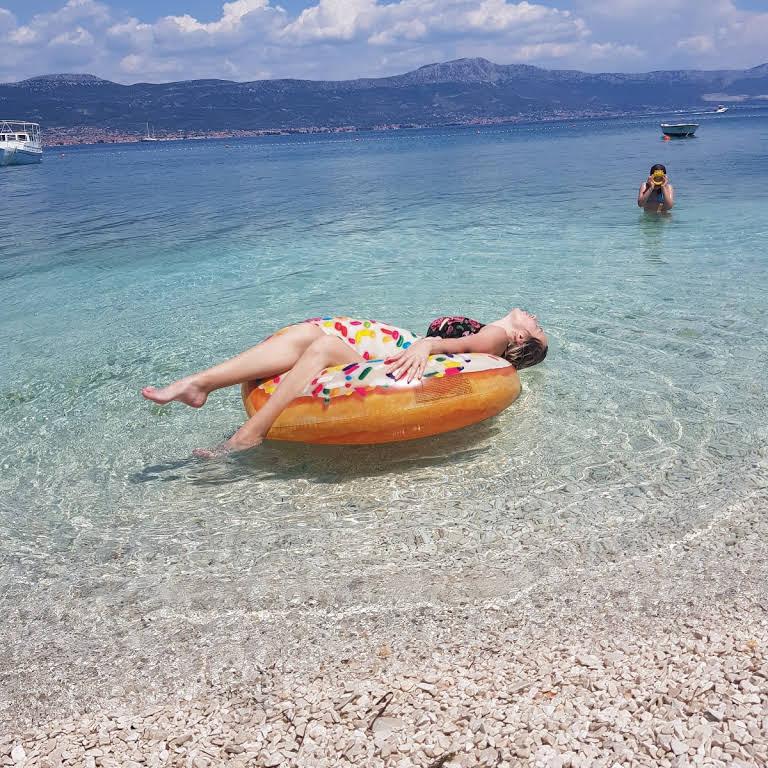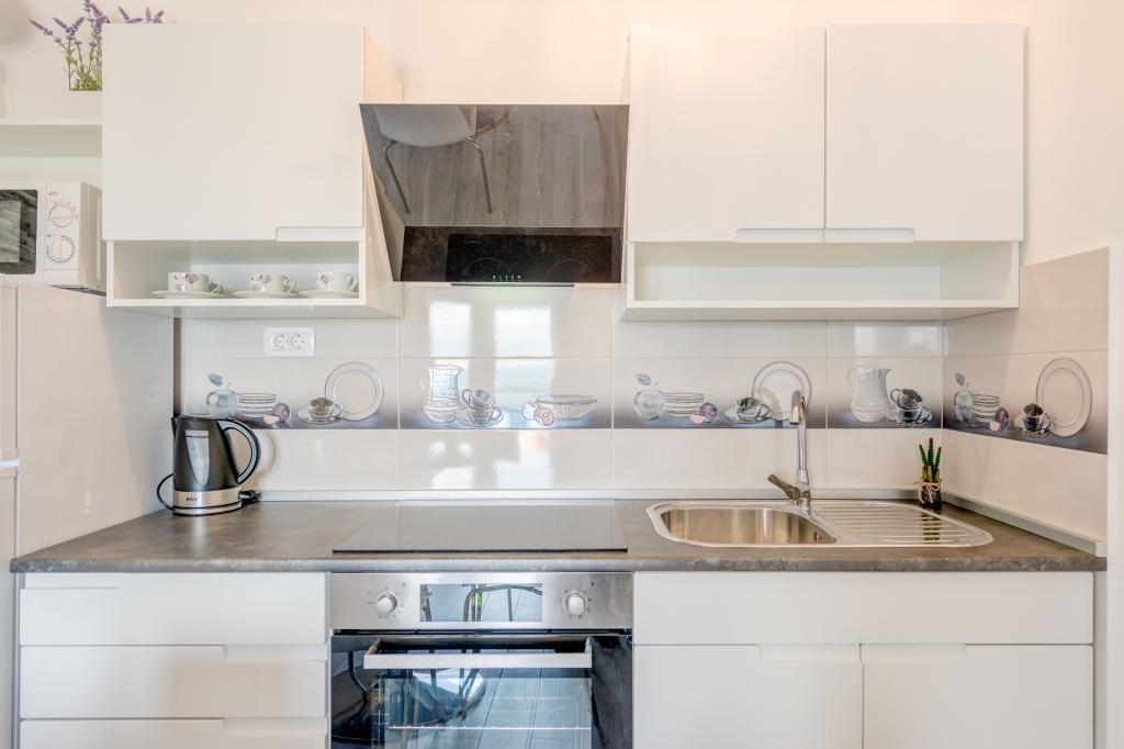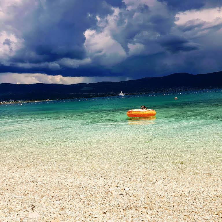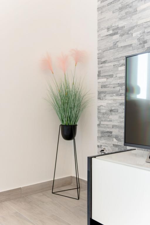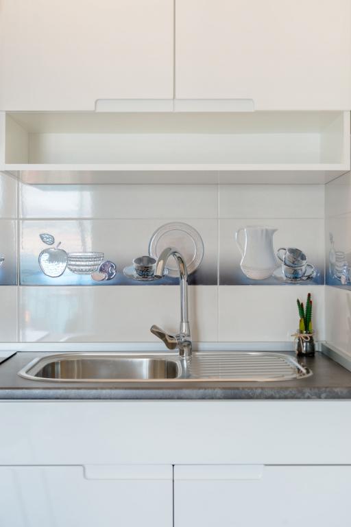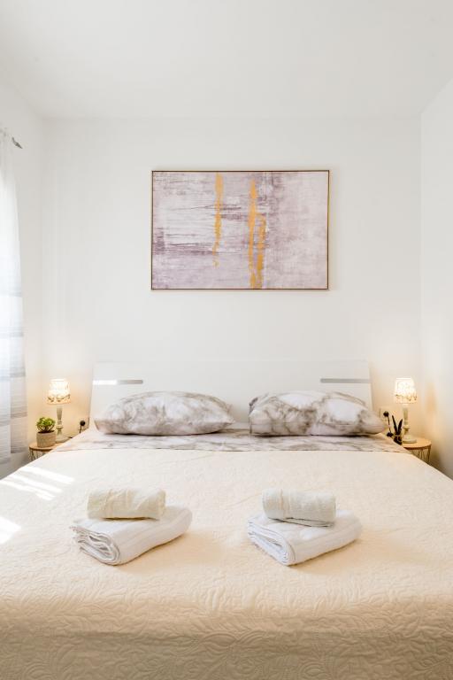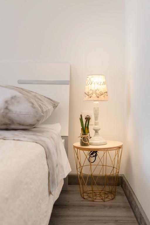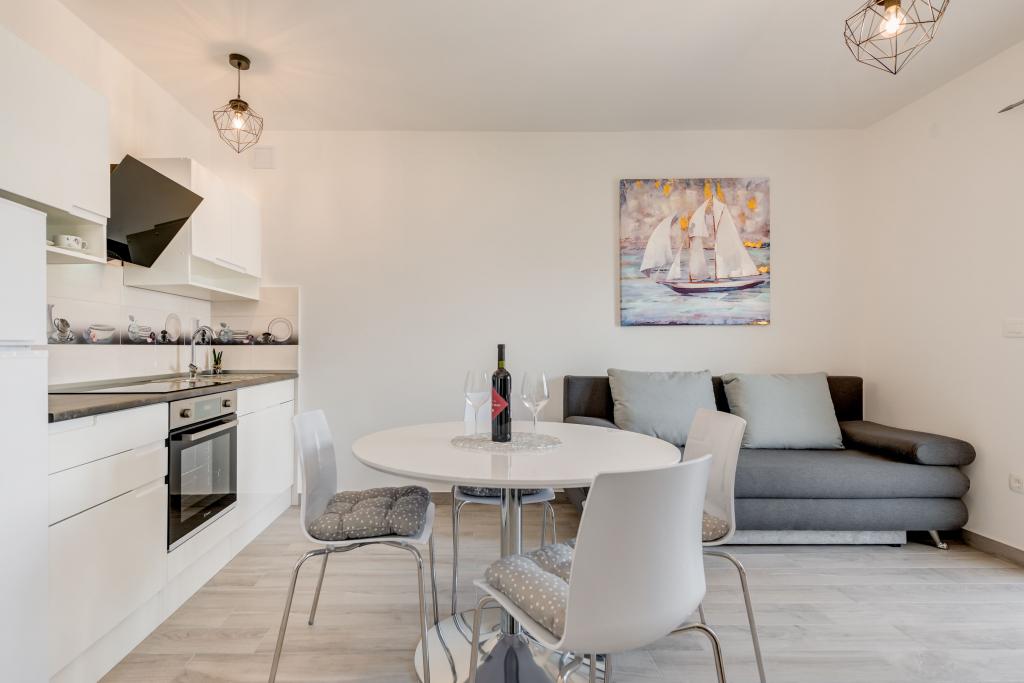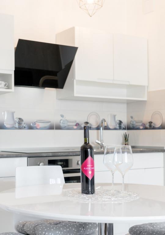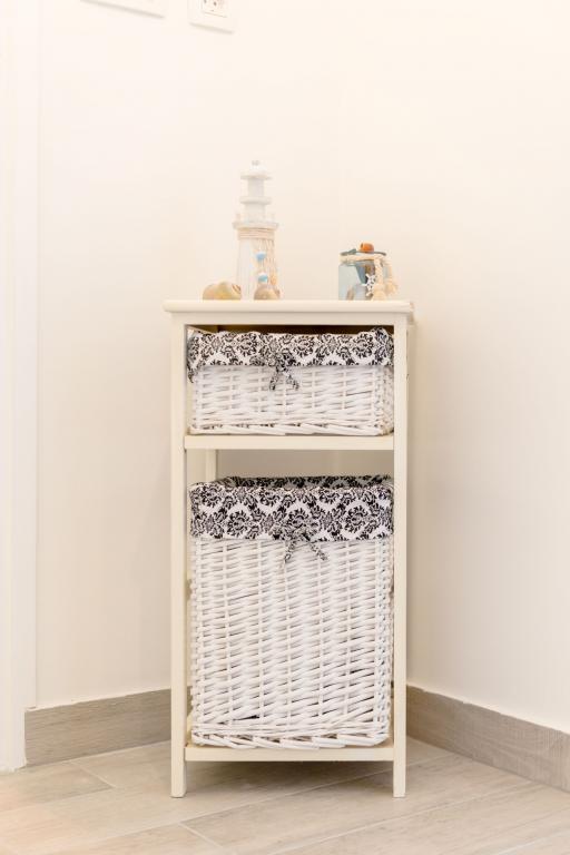 Kamnita hiša pritličje in tri nadstropja z veliko teraso in kaminom 70m od morja. Prvo in drugo nadstropje ali prvo in drugo stanovanje se oddajajo. Oba apartmaja sta enakovredno opremljena in vključujeta spalnico, dnevno sobo z raztegljivim kavčem, kuhinjo z vsem, kar je potrebno za pripravo hrane, vključno z mikrovalovno pečico, kopalnico in balkon s čudovitim pogledom na morje. Na zahtevo je na voljo dodatno ležišče in prenosna otroška posteljica. Neomejen internet, pametna satelitska TV. Klimatska naprava brez doplačila.