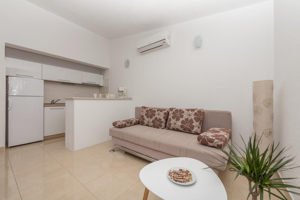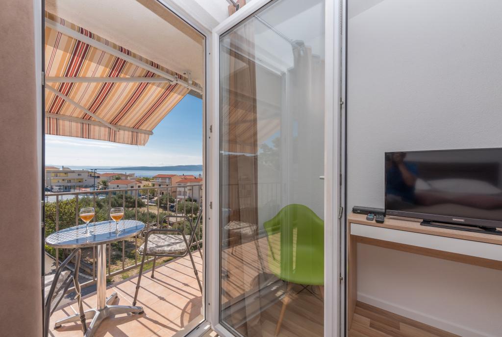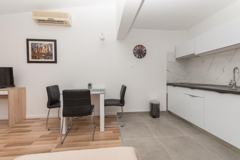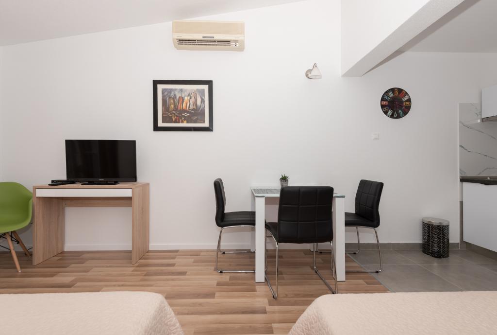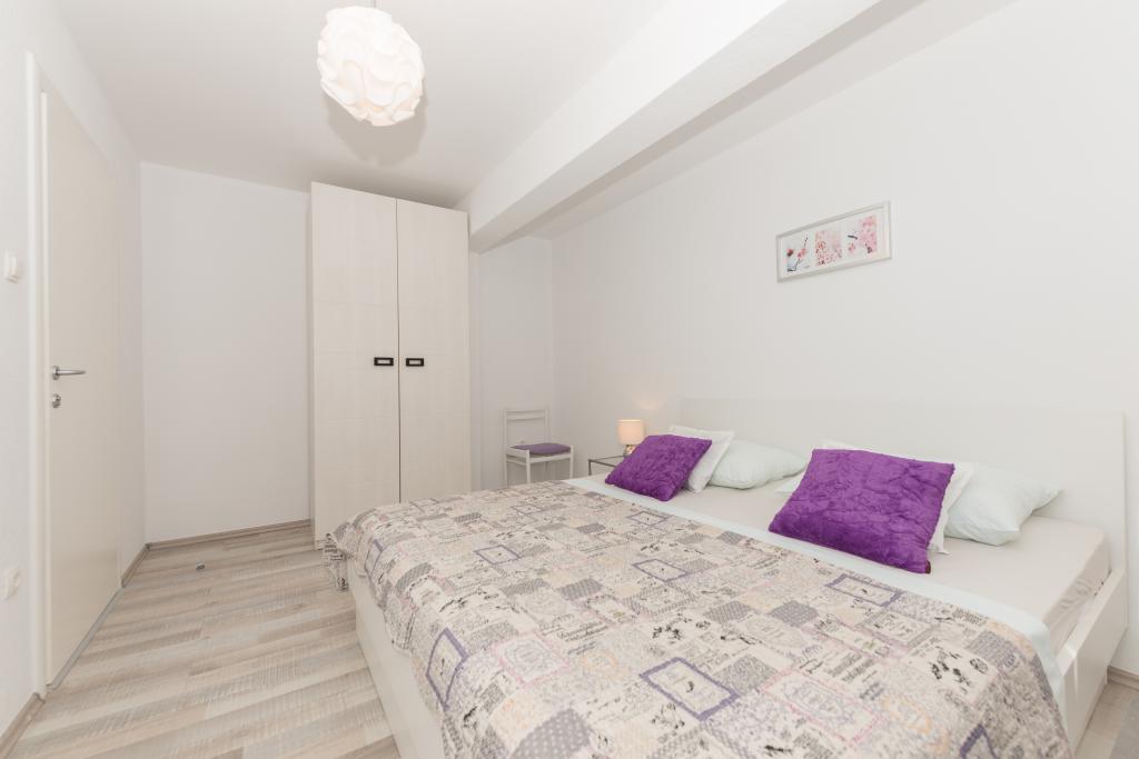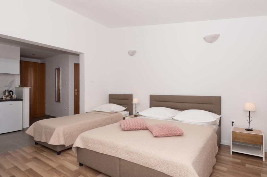 Klimatizirani apartmaji s pogledom na morje, le 200 m od glavne plaže, 4 minute hoje. APARTMA 2+2 -, udoben. Moderno opremljen apartma - 50 m2, ločena spalnica z zakonsko posteljo velikosti king size in raztegljivo posteljo za 2 osebi v dnevni sobi. APARTMA 4+ 1 z 2 spalnicama, velika dnevna soba z raztegljivo posteljo za 1 osebo-otroka. Primerno za družine in pare. Popolnoma klimatiziran, 3 klimatske naprave. APARTMA 3 udoben apartma za 2-3 osebe z balkonom - spektakularen pogled na morje in otoke. V okolici so restavracije, parkirišče ob hiši.