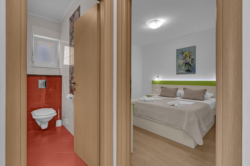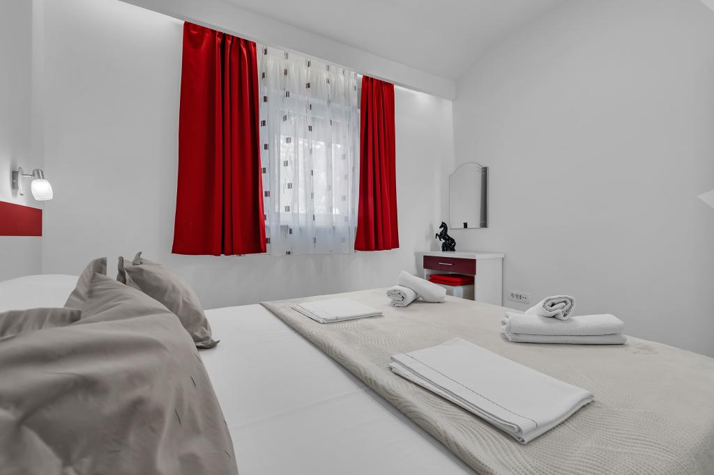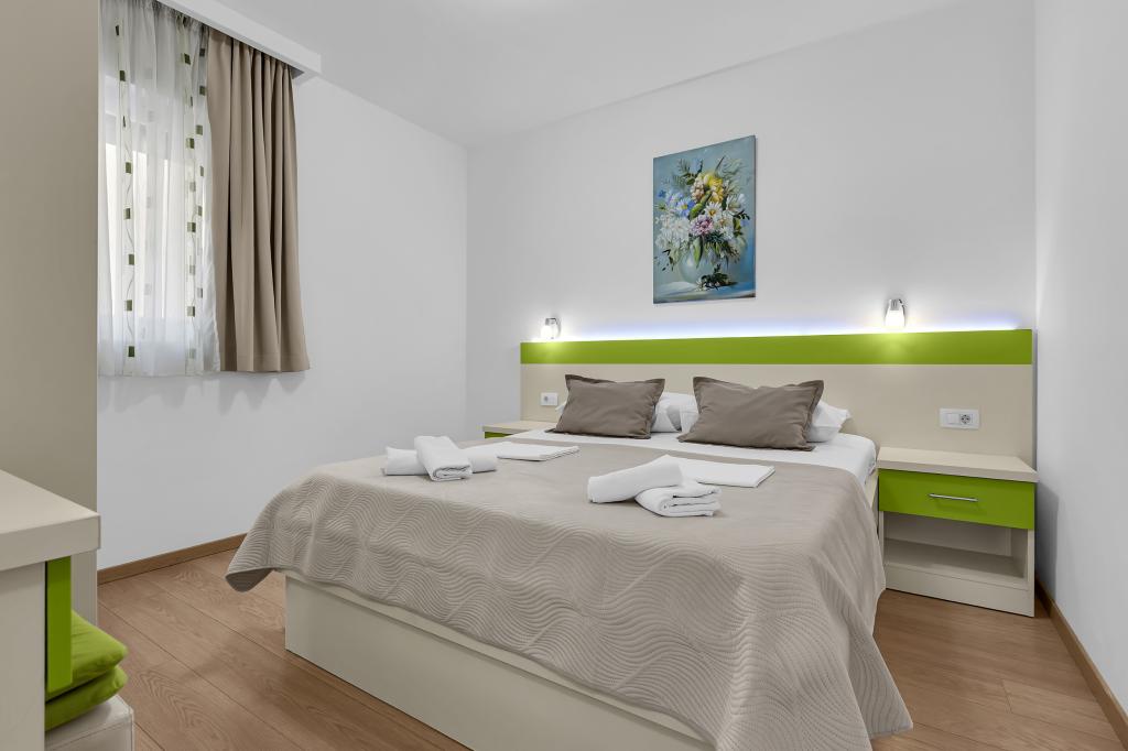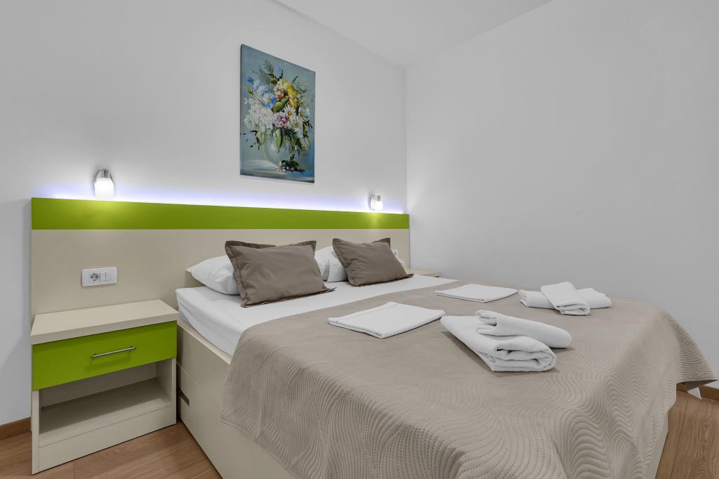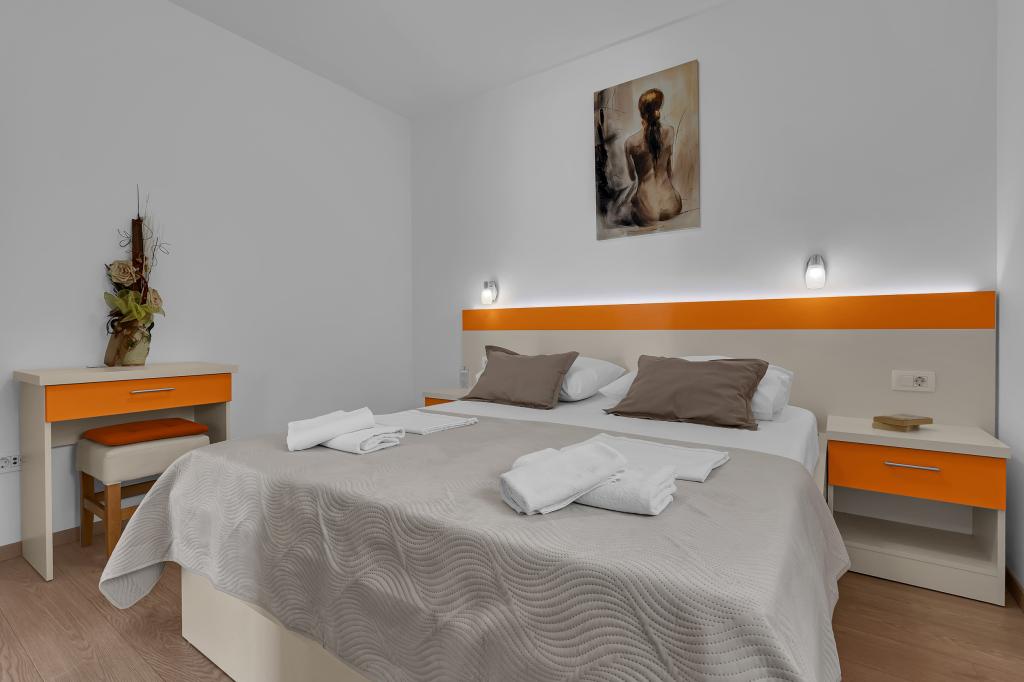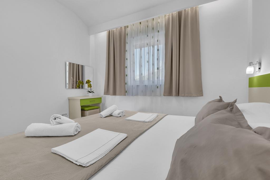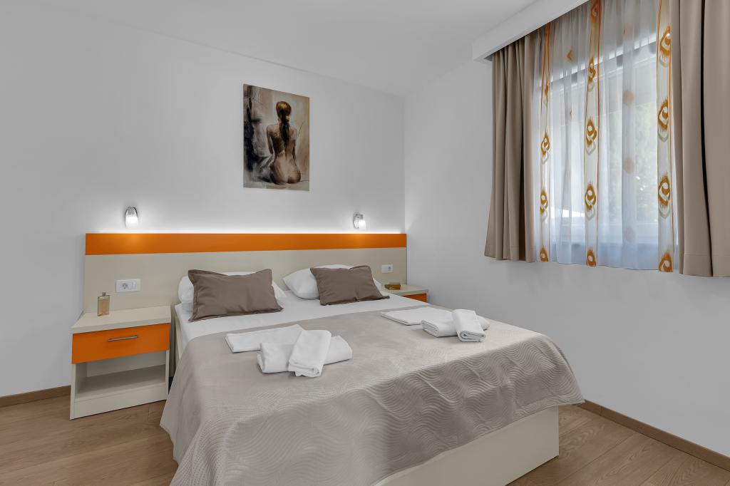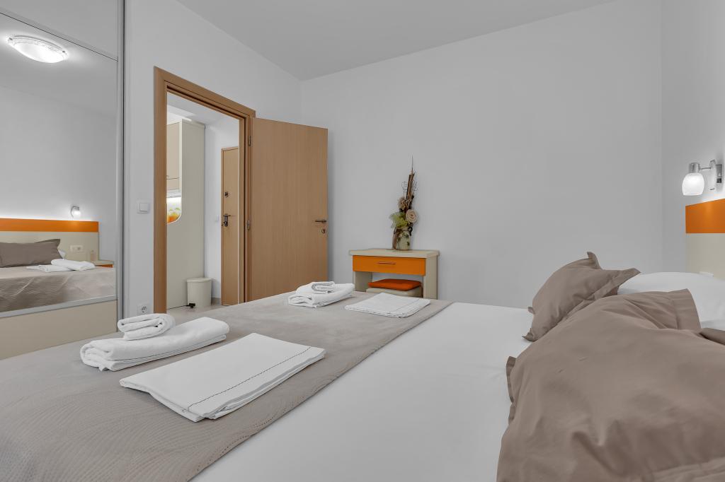 NOVA STANOVANJA! Vsi naši apartmaji so moderno opremljeni. Skupaj imamo v ponudbi šest (6) apartmajev, od katerih je pet (5) enosobnih in en dupleks - dvosoben. Na dvorišču je majhen bazen za goste, a) Enosobni apartmaji (2 odrasla in 2 otroka) imajo: sobo z zakonsko posteljo, veliko kopalnico z veliko tuš kabino, popolnoma opremljeno moderno kuhinjo z jedilnico in dnevno sobo s klimatsko napravo in udobnim raztegljivim kavčem za dva odrasla otroka ter brezžični internet. Vsako od teh stanovanj ima velik 9 m2 velik balkon iz dnevne sobe. b) Dvosobno, dvonadstropno stanovanje 4 (4 odrasli in 2 otroka) ima v prvem nadstropju moderno sobo z zakonsko posteljo in eno kopalnico s tušem in straniščem, popolnoma opremljeno kuhinjo z jedilnico in dnevno sobo z udobnim raztegljivim kavčem za dva odrasla otroka. V drugo nadstropje se pride po zavitem stopnišču, kjer se nahaja velika soba, kopalnica in ločen WC. . Obe nadstropji sta klimatizirani.