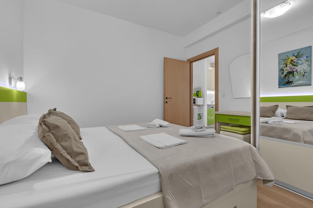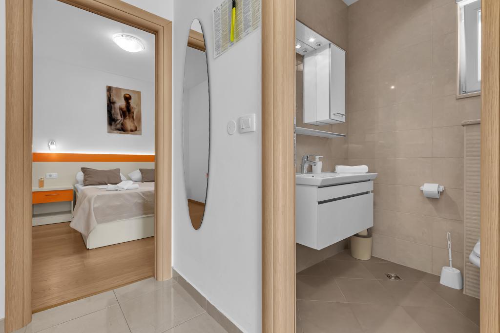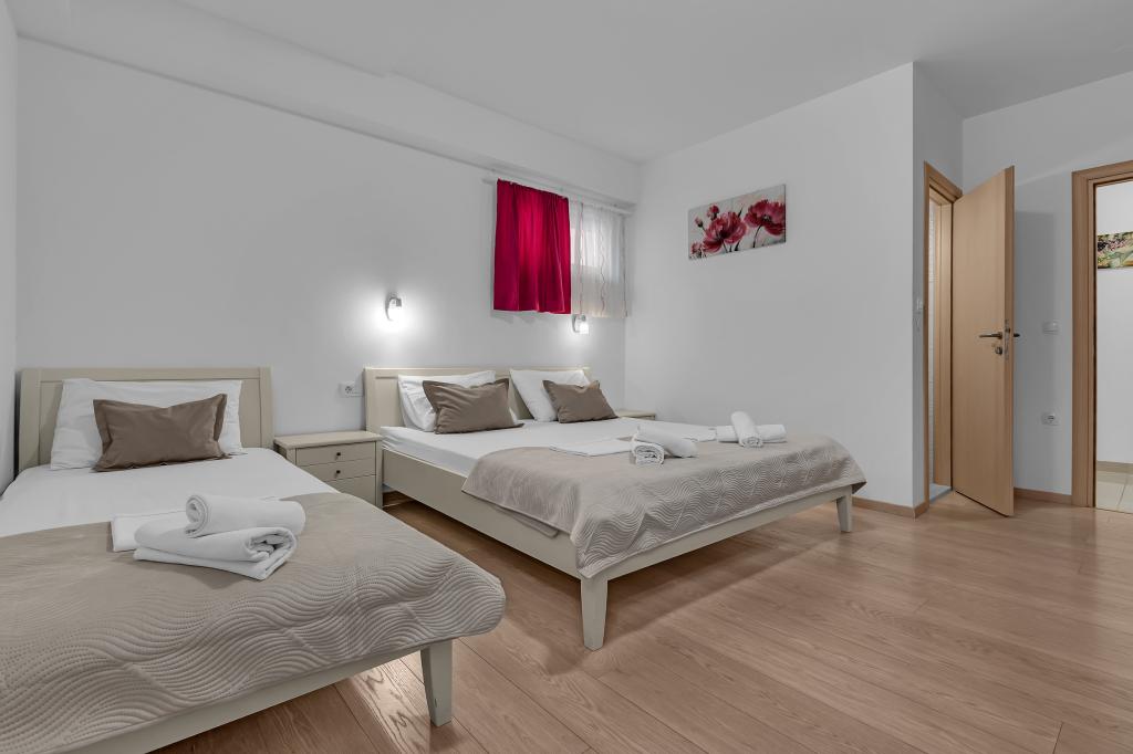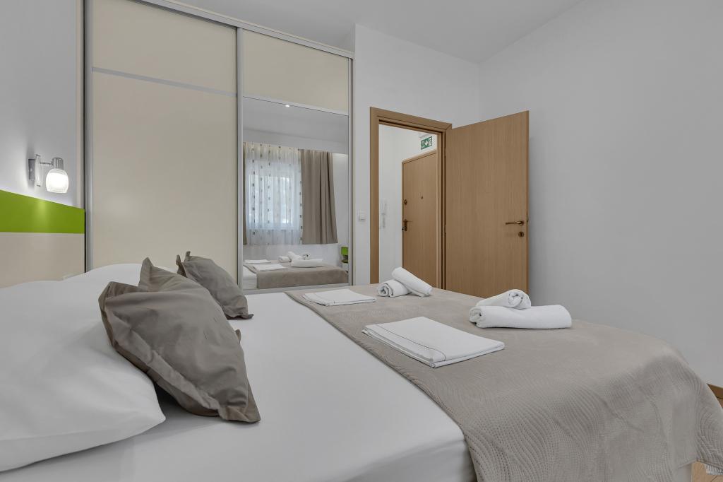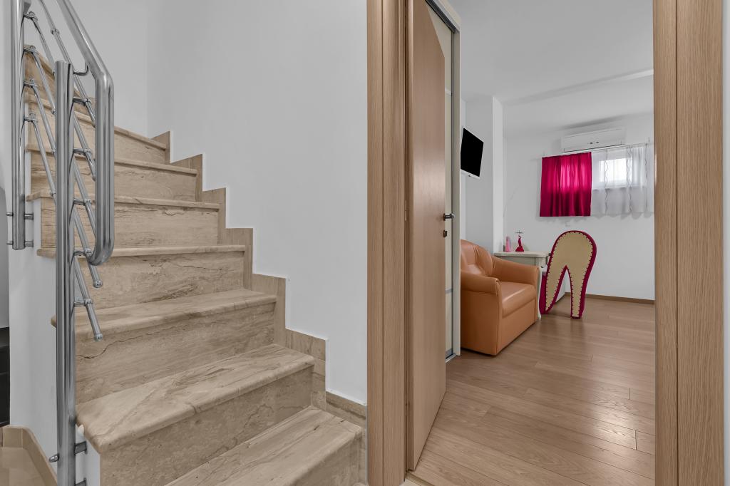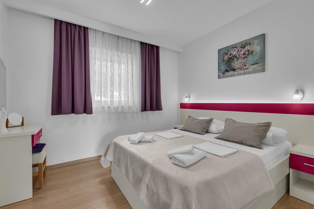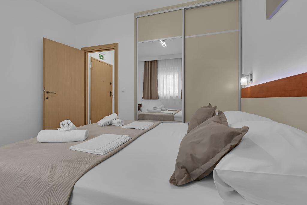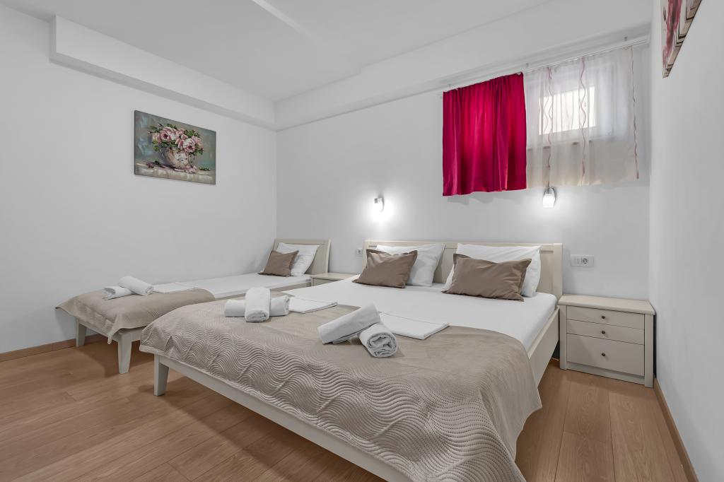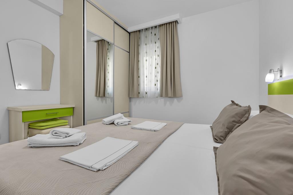 NOVA STANOVANJA! Vsi naši apartmaji so moderno opremljeni. Skupaj imamo v ponudbi šest (6) apartmajev, od katerih je pet (5) enosobnih in en dupleks - dvosoben. Na dvorišču je majhen bazen za goste, a) Enosobni apartmaji (2 odrasla in 2 otroka) imajo: sobo z zakonsko posteljo, veliko kopalnico z veliko tuš kabino, popolnoma opremljeno moderno kuhinjo z jedilnico in dnevno sobo s klimatsko napravo in udobnim raztegljivim kavčem za dva odrasla otroka ter brezžični internet. Vsako od teh stanovanj ima velik 9 m2 velik balkon iz dnevne sobe. b) Dvosobno, dvonadstropno stanovanje 4 (4 odrasli in 2 otroka) ima v prvem nadstropju moderno sobo z zakonsko posteljo in eno kopalnico s tušem in straniščem, popolnoma opremljeno kuhinjo z jedilnico in dnevno sobo z udobnim raztegljivim kavčem za dva odrasla otroka. V drugo nadstropje se pride po zavitem stopnišču, kjer se nahaja velika soba, kopalnica in ločen WC. . Obe nadstropji sta klimatizirani.