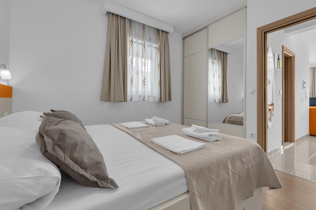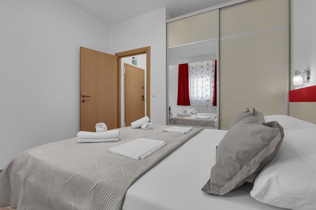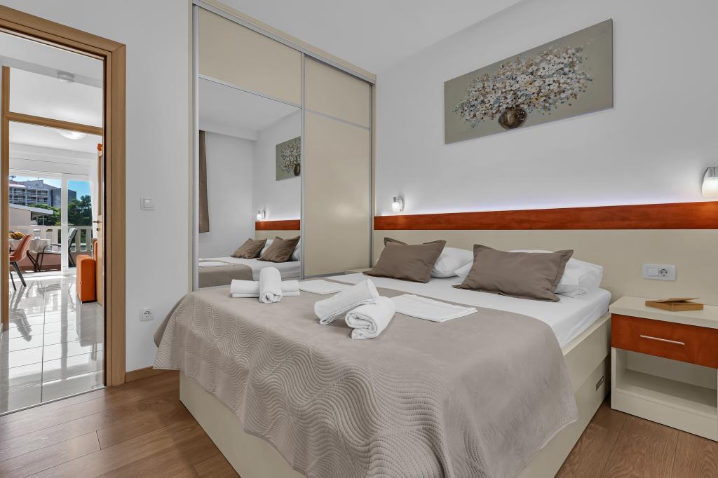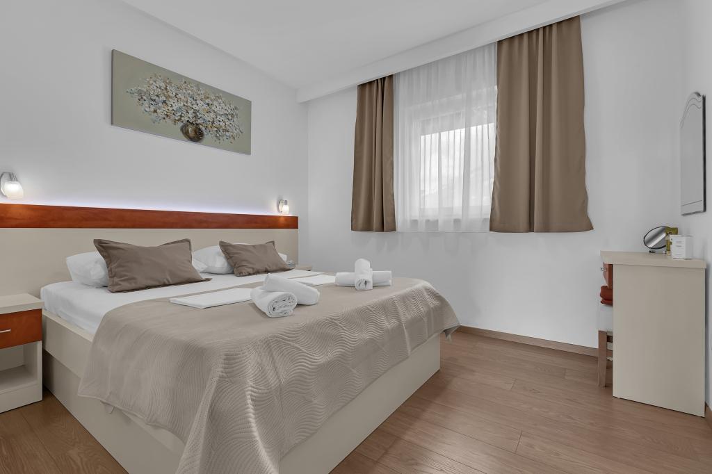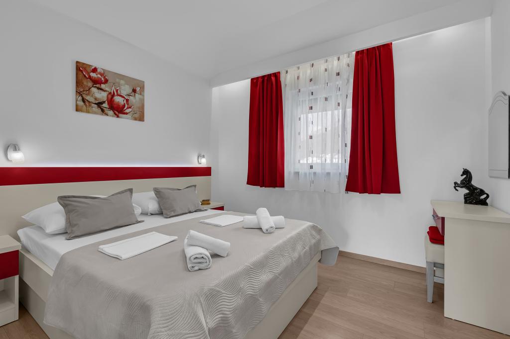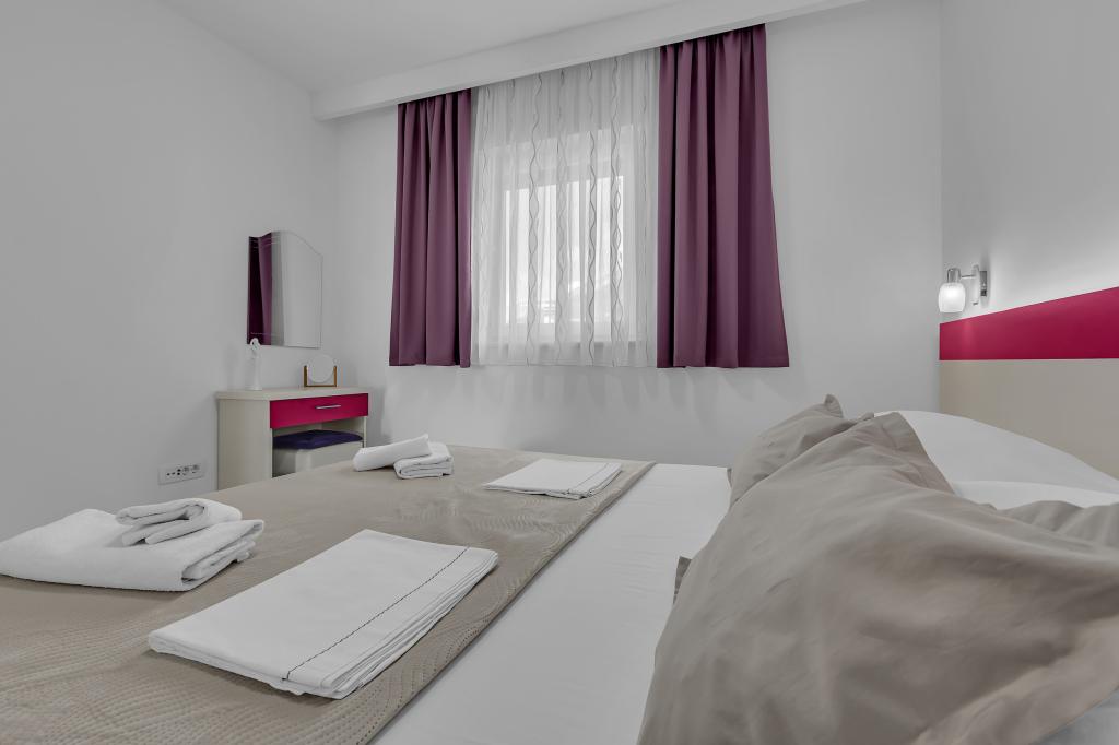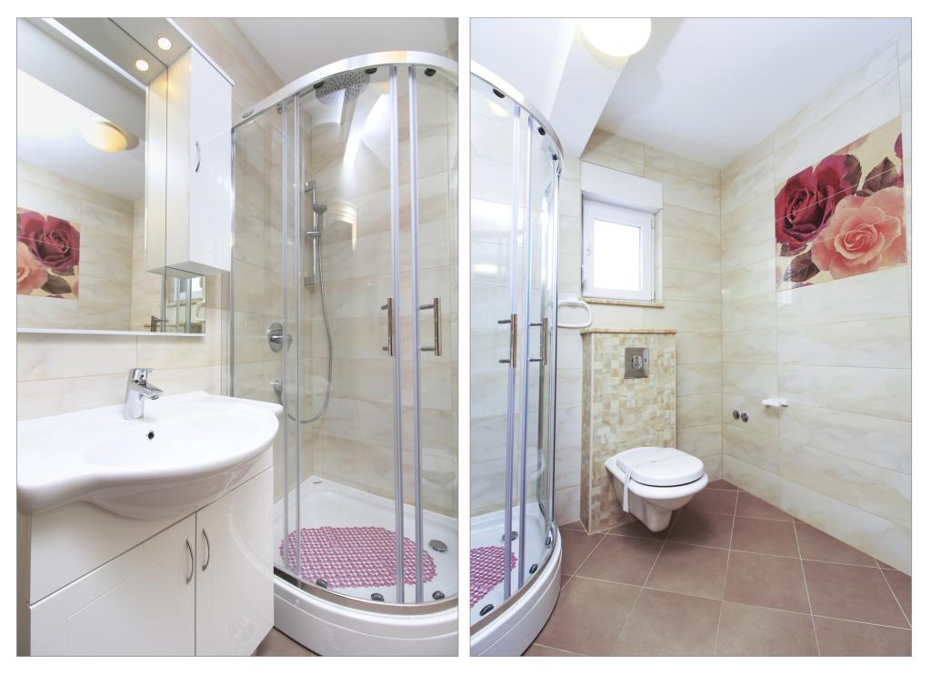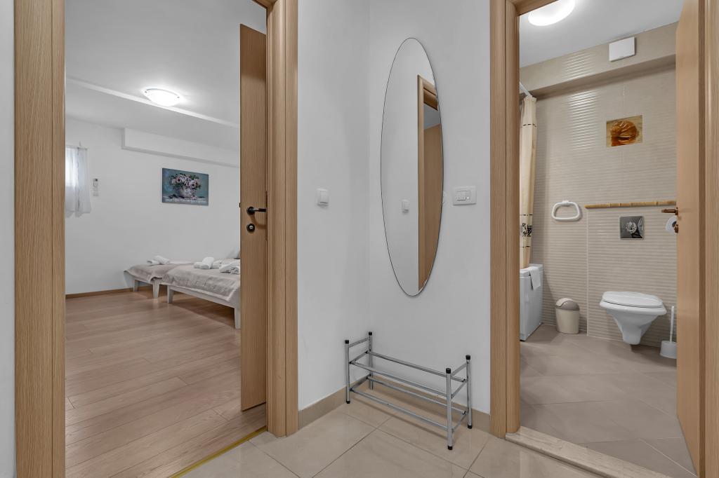 NOVA STANOVANJA! Vsi naši apartmaji so moderno opremljeni. Skupaj imamo v ponudbi šest (6) apartmajev, od katerih je pet (5) enosobnih in en dupleks - dvosoben. Na dvorišču je majhen bazen za goste, a) Enosobni apartmaji (2 odrasla in 2 otroka) imajo: sobo z zakonsko posteljo, veliko kopalnico z veliko tuš kabino, popolnoma opremljeno moderno kuhinjo z jedilnico in dnevno sobo s klimatsko napravo in udobnim raztegljivim kavčem za dva odrasla otroka ter brezžični internet. Vsako od teh stanovanj ima velik 9 m2 velik balkon iz dnevne sobe. b) Dvosobno, dvonadstropno stanovanje 4 (4 odrasli in 2 otroka) ima v prvem nadstropju moderno sobo z zakonsko posteljo in eno kopalnico s tušem in straniščem, popolnoma opremljeno kuhinjo z jedilnico in dnevno sobo z udobnim raztegljivim kavčem za dva odrasla otroka. V drugo nadstropje se pride po zavitem stopnišču, kjer se nahaja velika soba, kopalnica in ločen WC. . Obe nadstropji sta klimatizirani.