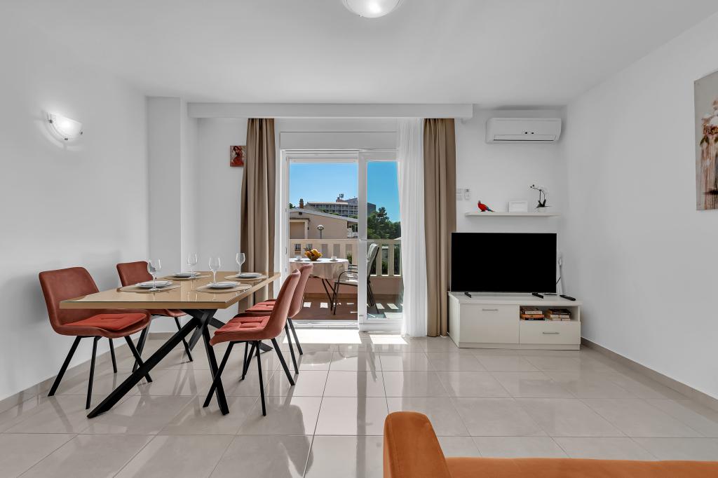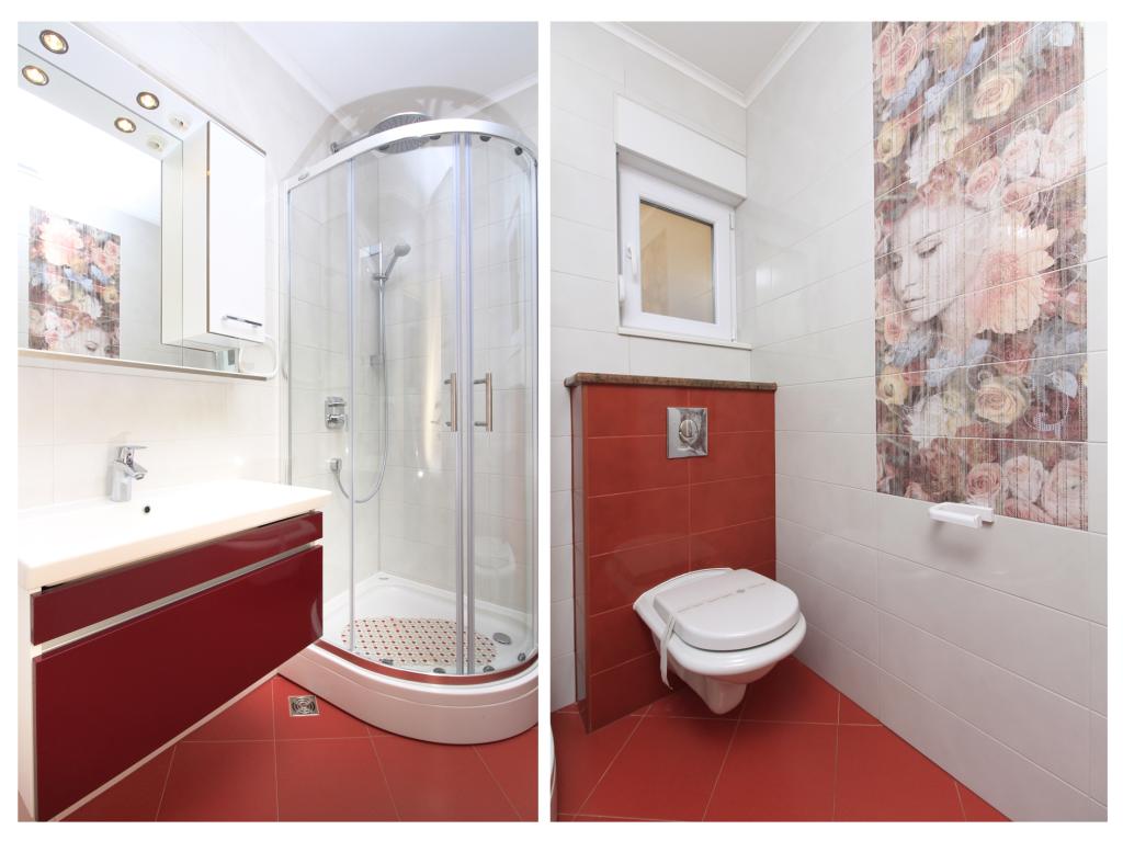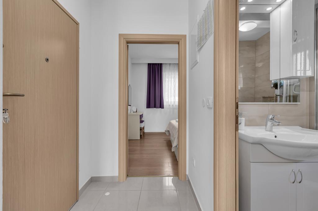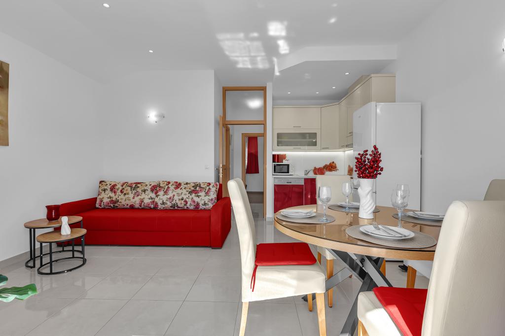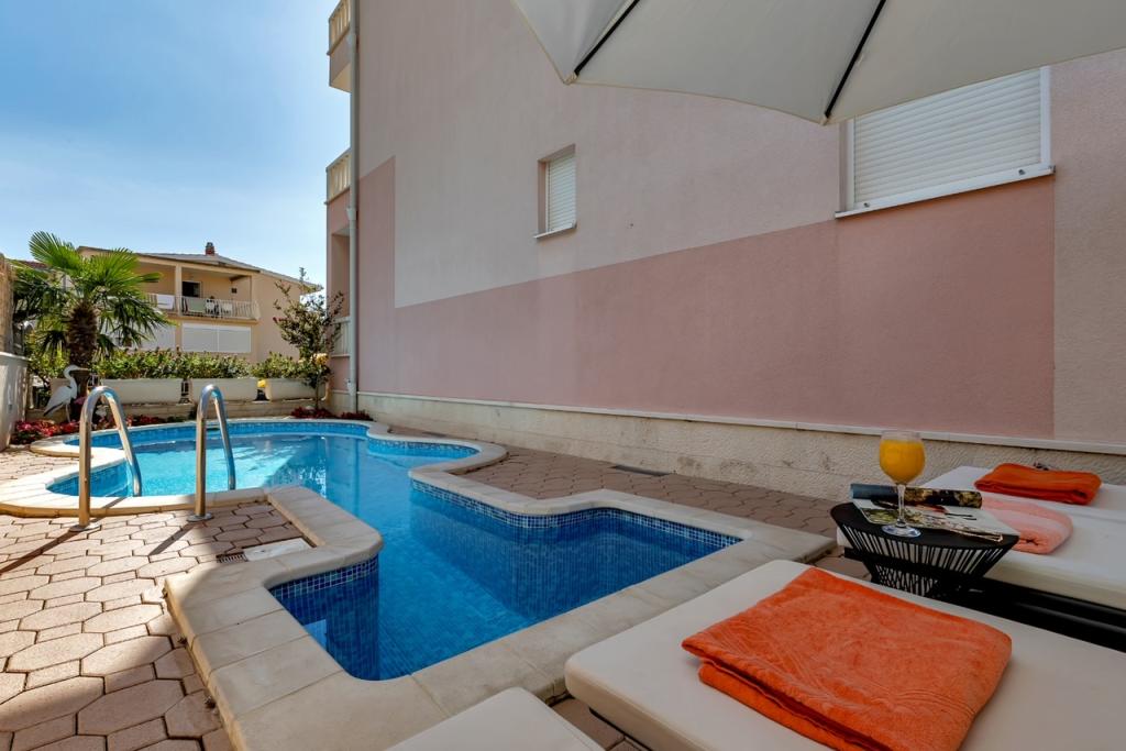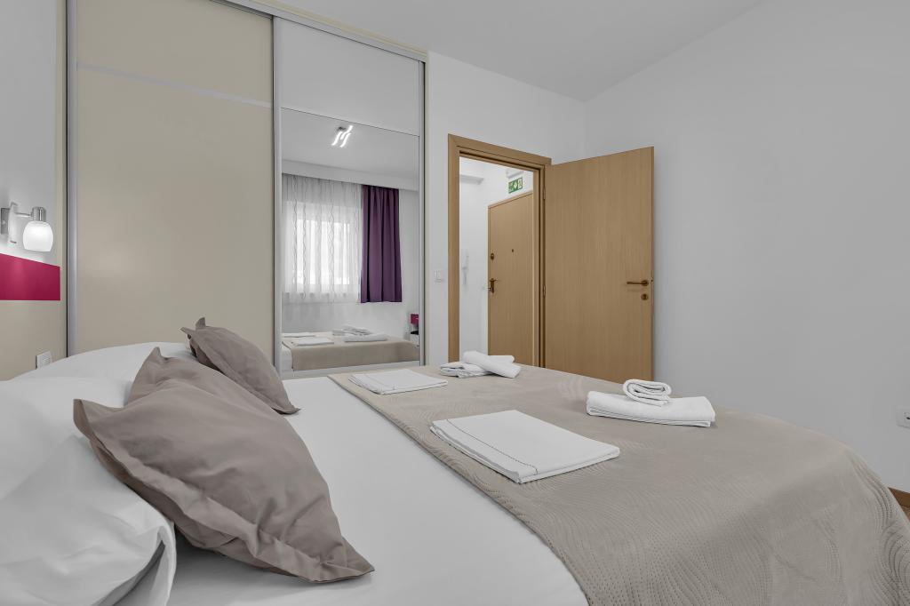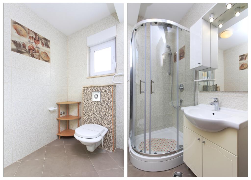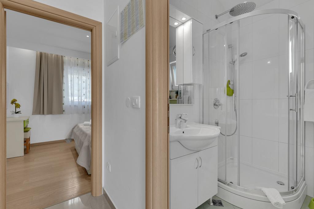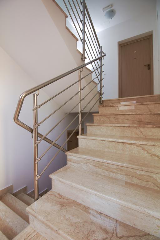 NOVA STANOVANJA! Vsi naši apartmaji so moderno opremljeni. Skupaj imamo v ponudbi šest (6) apartmajev, od katerih je pet (5) enosobnih in en dupleks - dvosoben. Na dvorišču je majhen bazen za goste, a) Enosobni apartmaji (2 odrasla in 2 otroka) imajo: sobo z zakonsko posteljo, veliko kopalnico z veliko tuš kabino, popolnoma opremljeno moderno kuhinjo z jedilnico in dnevno sobo s klimatsko napravo in udobnim raztegljivim kavčem za dva odrasla otroka ter brezžični internet. Vsako od teh stanovanj ima velik 9 m2 velik balkon iz dnevne sobe. b) Dvosobno, dvonadstropno stanovanje 4 (4 odrasli in 2 otroka) ima v prvem nadstropju moderno sobo z zakonsko posteljo in eno kopalnico s tušem in straniščem, popolnoma opremljeno kuhinjo z jedilnico in dnevno sobo z udobnim raztegljivim kavčem za dva odrasla otroka. V drugo nadstropje se pride po zavitem stopnišču, kjer se nahaja velika soba, kopalnica in ločen WC. . Obe nadstropji sta klimatizirani.