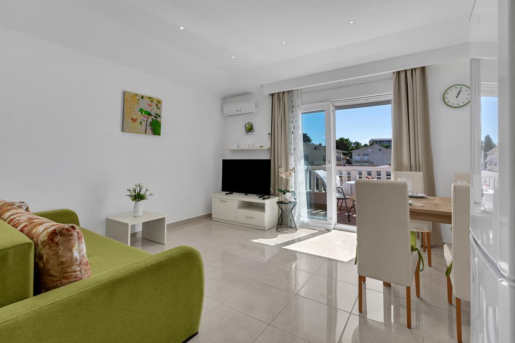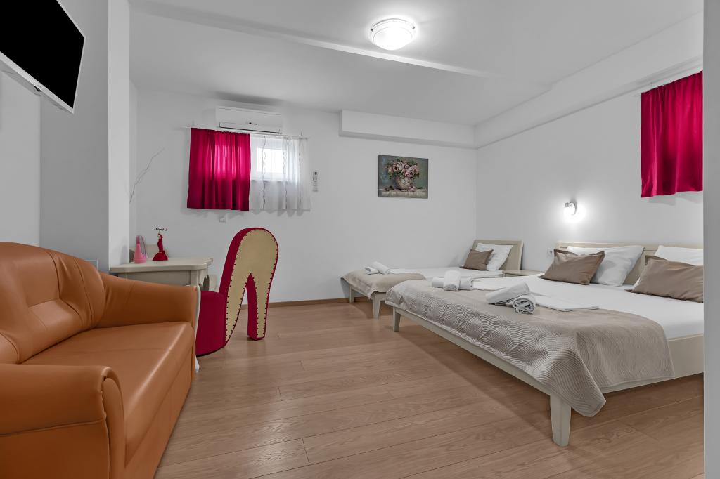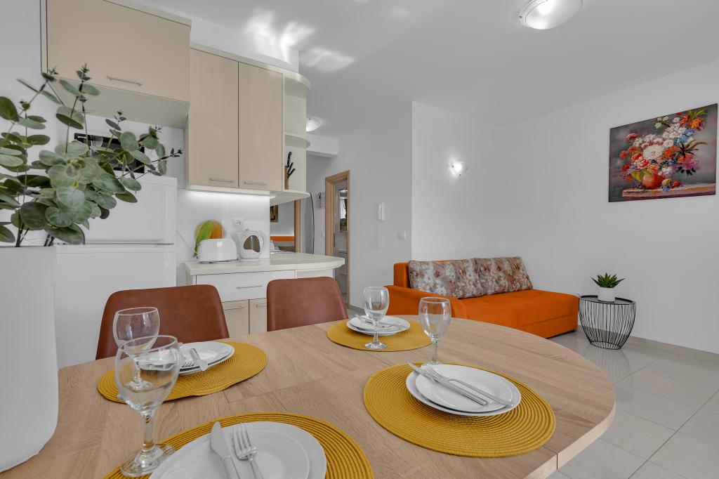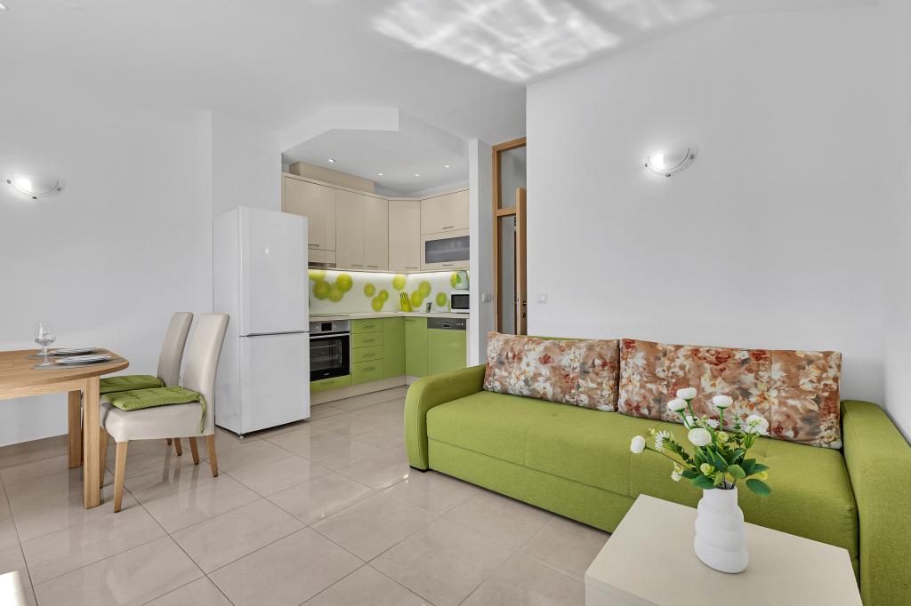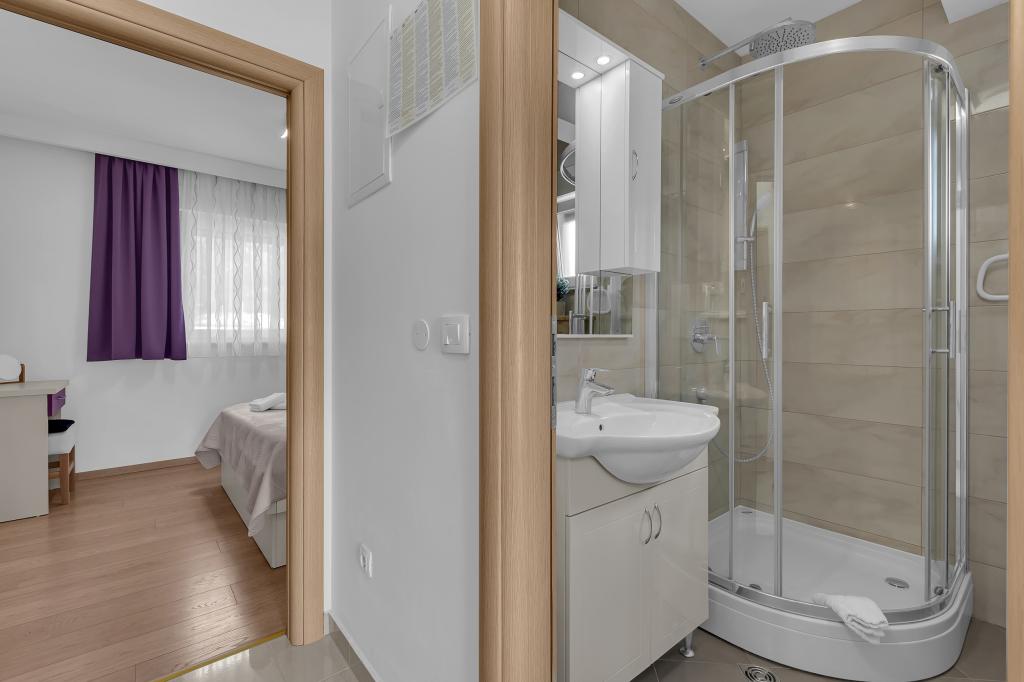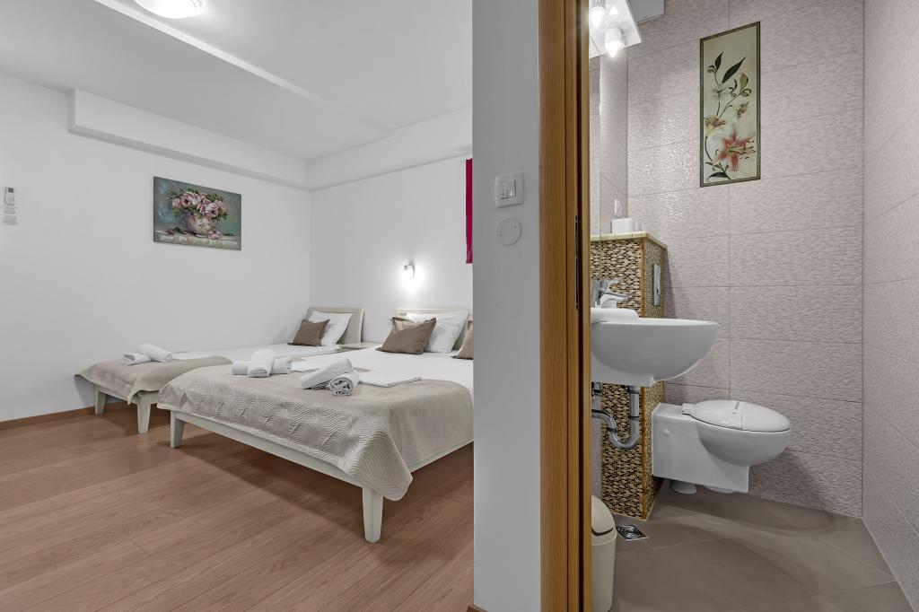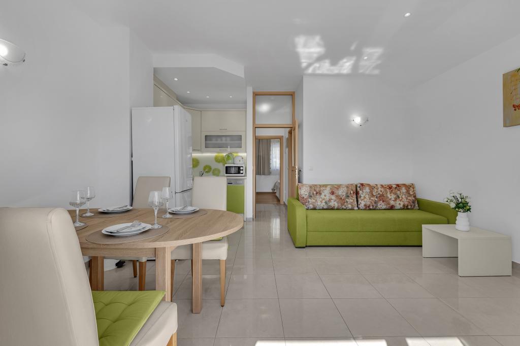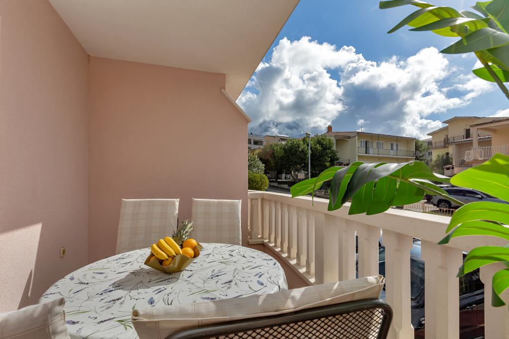 NOVA STANOVANJA! Vsi naši apartmaji so moderno opremljeni. Skupaj imamo v ponudbi šest (6) apartmajev, od katerih je pet (5) enosobnih in en dupleks - dvosoben. Na dvorišču je majhen bazen za goste, a) Enosobni apartmaji (2 odrasla in 2 otroka) imajo: sobo z zakonsko posteljo, veliko kopalnico z veliko tuš kabino, popolnoma opremljeno moderno kuhinjo z jedilnico in dnevno sobo s klimatsko napravo in udobnim raztegljivim kavčem za dva odrasla otroka ter brezžični internet. Vsako od teh stanovanj ima velik 9 m2 velik balkon iz dnevne sobe. b) Dvosobno, dvonadstropno stanovanje 4 (4 odrasli in 2 otroka) ima v prvem nadstropju moderno sobo z zakonsko posteljo in eno kopalnico s tušem in straniščem, popolnoma opremljeno kuhinjo z jedilnico in dnevno sobo z udobnim raztegljivim kavčem za dva odrasla otroka. V drugo nadstropje se pride po zavitem stopnišču, kjer se nahaja velika soba, kopalnica in ločen WC. . Obe nadstropji sta klimatizirani.