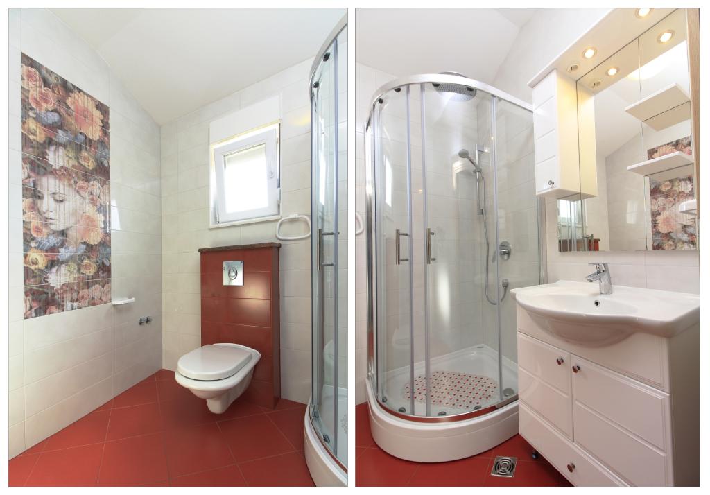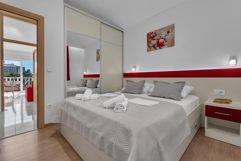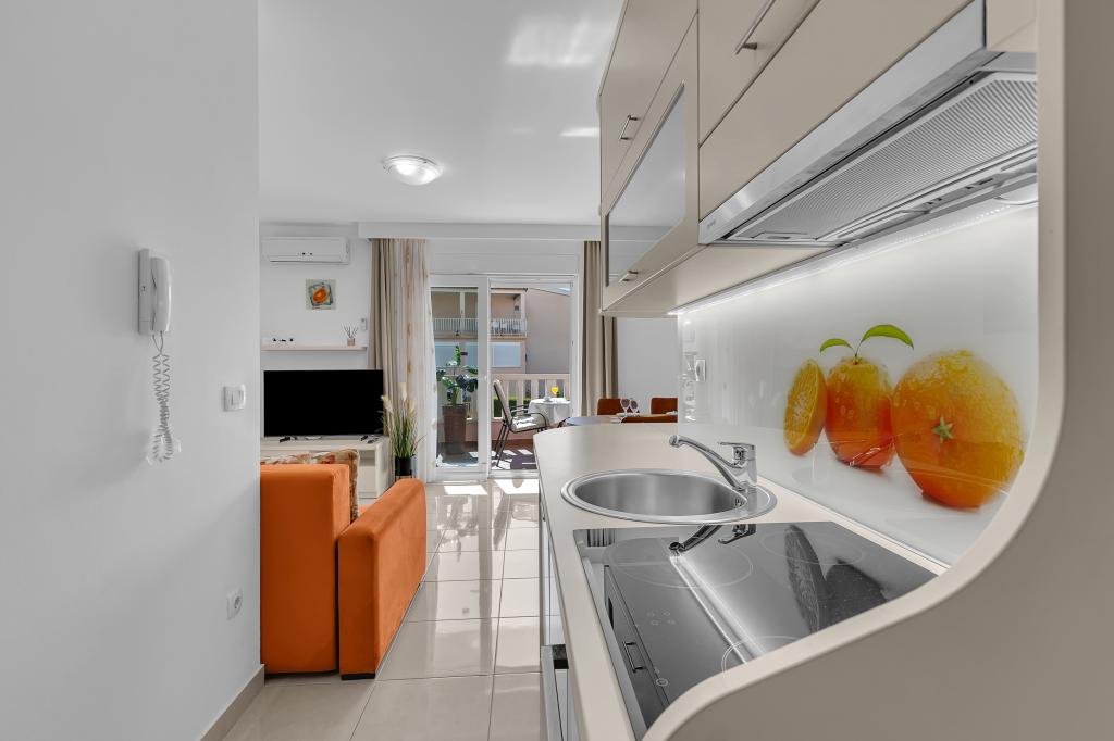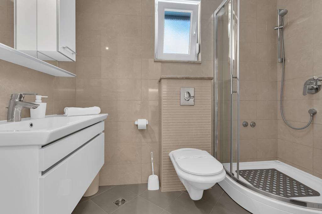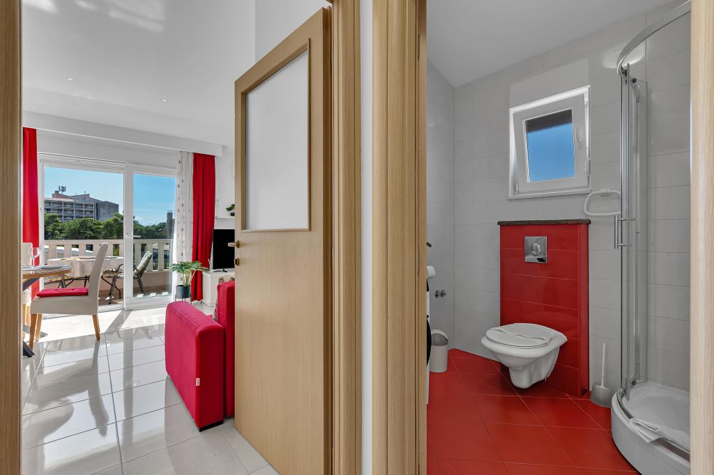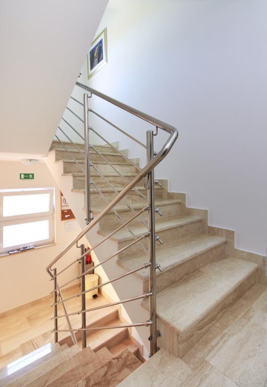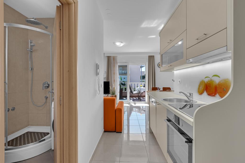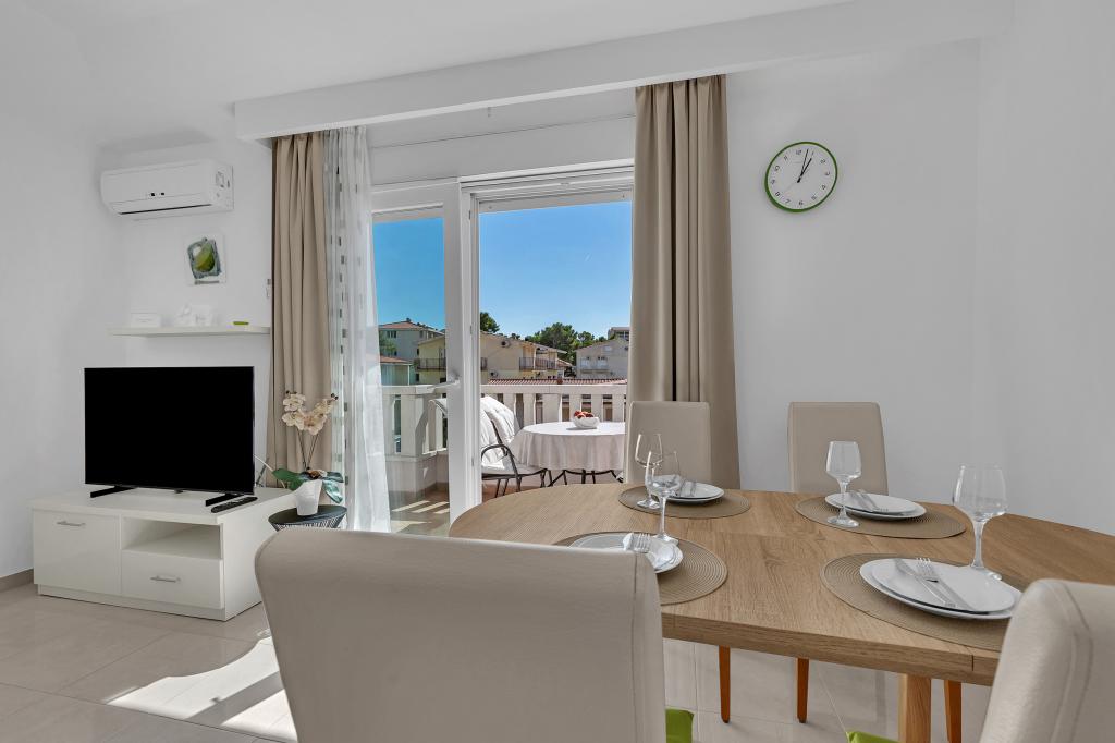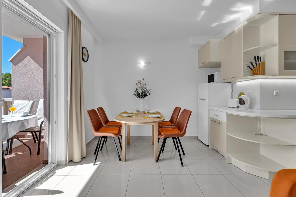 NOVA STANOVANJA! Vsi naši apartmaji so moderno opremljeni. Skupaj imamo v ponudbi šest (6) apartmajev, od katerih je pet (5) enosobnih in en dupleks - dvosoben. Na dvorišču je majhen bazen za goste, a) Enosobni apartmaji (2 odrasla in 2 otroka) imajo: sobo z zakonsko posteljo, veliko kopalnico z veliko tuš kabino, popolnoma opremljeno moderno kuhinjo z jedilnico in dnevno sobo s klimatsko napravo in udobnim raztegljivim kavčem za dva odrasla otroka ter brezžični internet. Vsako od teh stanovanj ima velik 9 m2 velik balkon iz dnevne sobe. b) Dvosobno, dvonadstropno stanovanje 4 (4 odrasli in 2 otroka) ima v prvem nadstropju moderno sobo z zakonsko posteljo in eno kopalnico s tušem in straniščem, popolnoma opremljeno kuhinjo z jedilnico in dnevno sobo z udobnim raztegljivim kavčem za dva odrasla otroka. V drugo nadstropje se pride po zavitem stopnišču, kjer se nahaja velika soba, kopalnica in ločen WC. . Obe nadstropji sta klimatizirani.