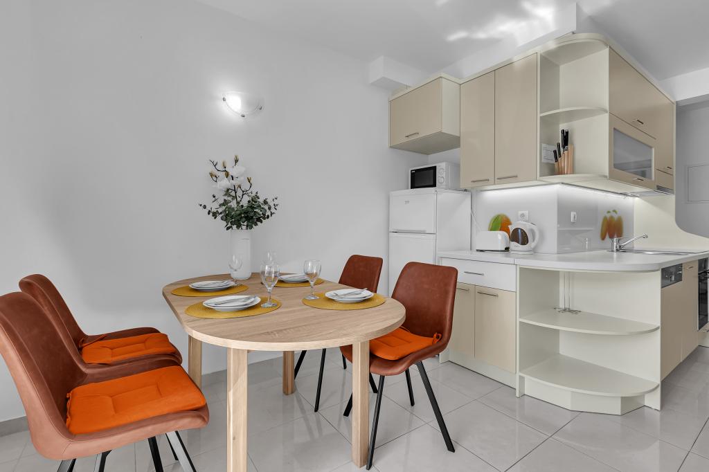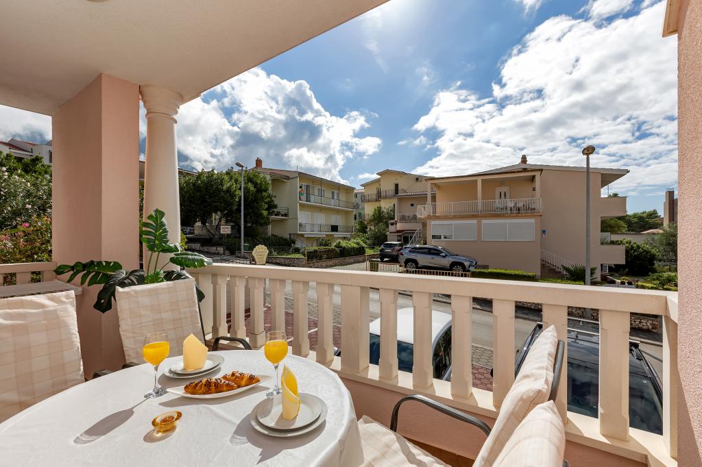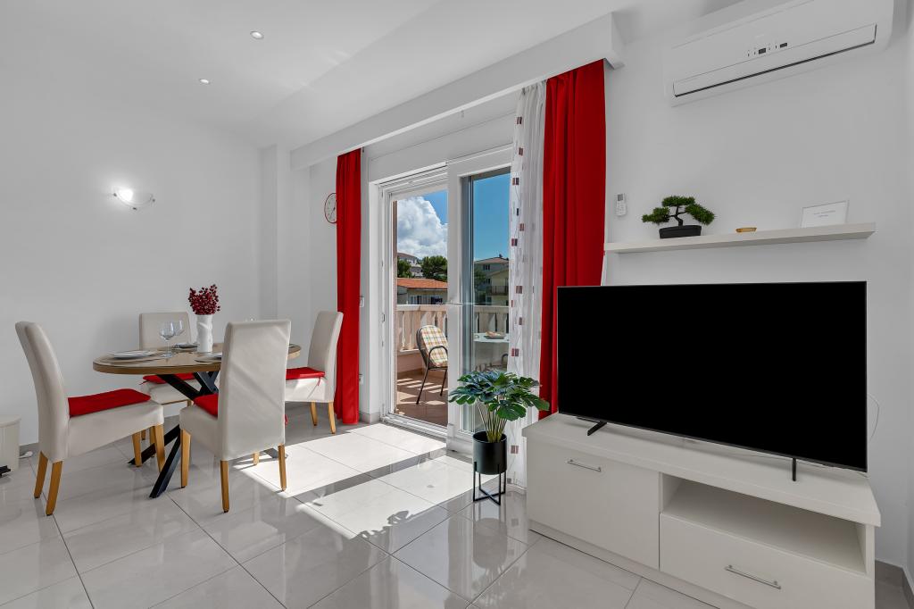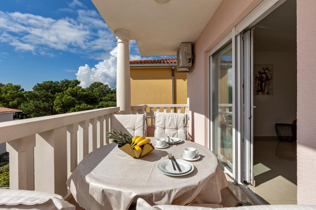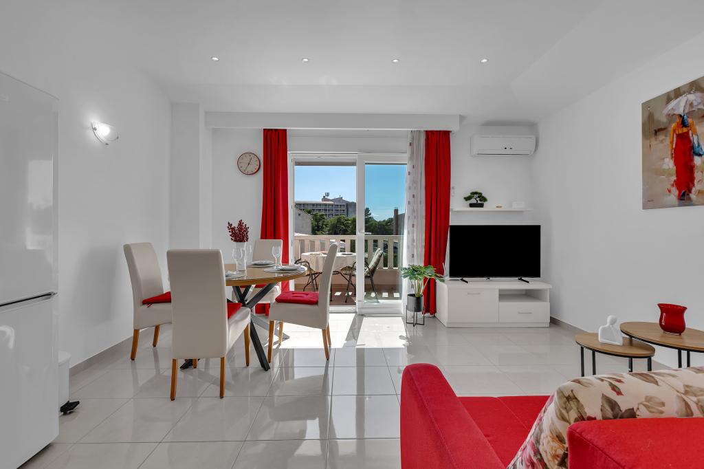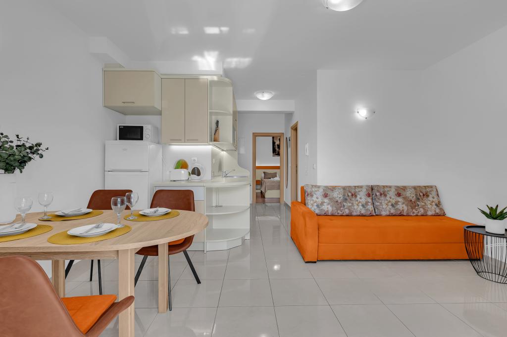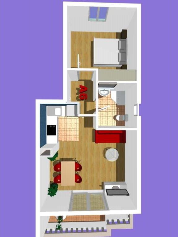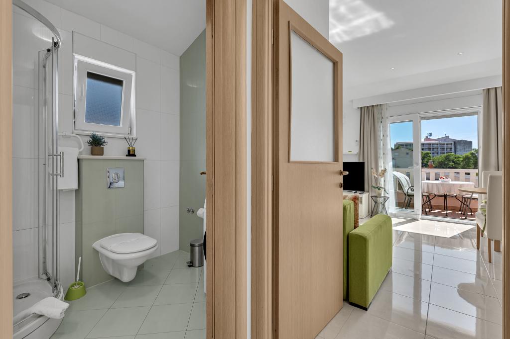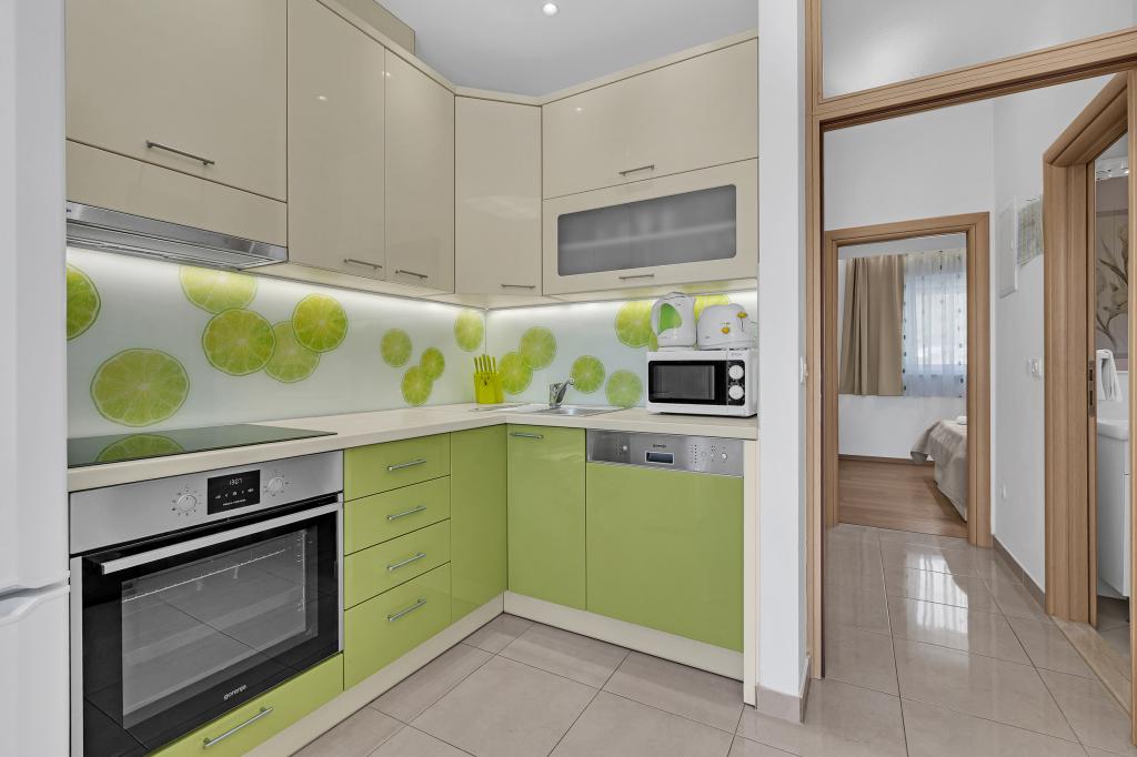 NOVA STANOVANJA! Vsi naši apartmaji so moderno opremljeni. Skupaj imamo v ponudbi šest (6) apartmajev, od katerih je pet (5) enosobnih in en dupleks - dvosoben. Na dvorišču je majhen bazen za goste, a) Enosobni apartmaji (2 odrasla in 2 otroka) imajo: sobo z zakonsko posteljo, veliko kopalnico z veliko tuš kabino, popolnoma opremljeno moderno kuhinjo z jedilnico in dnevno sobo s klimatsko napravo in udobnim raztegljivim kavčem za dva odrasla otroka ter brezžični internet. Vsako od teh stanovanj ima velik 9 m2 velik balkon iz dnevne sobe. b) Dvosobno, dvonadstropno stanovanje 4 (4 odrasli in 2 otroka) ima v prvem nadstropju moderno sobo z zakonsko posteljo in eno kopalnico s tušem in straniščem, popolnoma opremljeno kuhinjo z jedilnico in dnevno sobo z udobnim raztegljivim kavčem za dva odrasla otroka. V drugo nadstropje se pride po zavitem stopnišču, kjer se nahaja velika soba, kopalnica in ločen WC. . Obe nadstropji sta klimatizirani.
