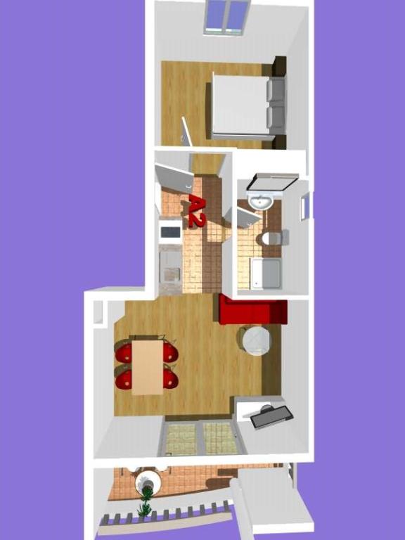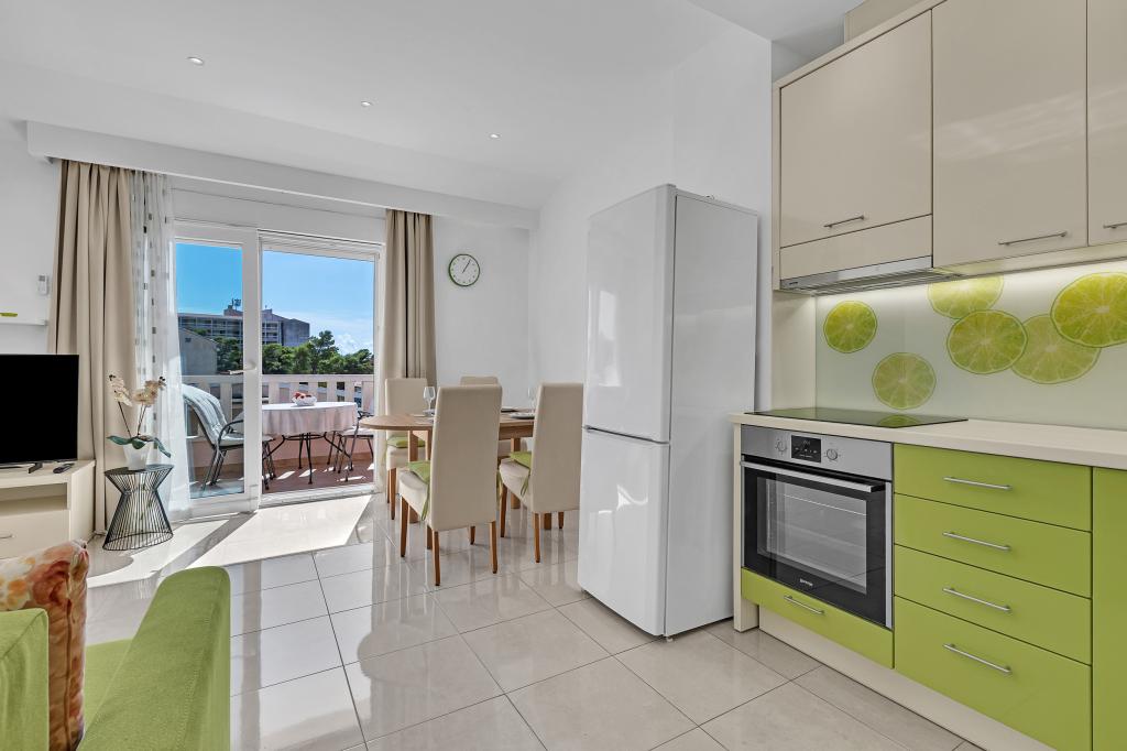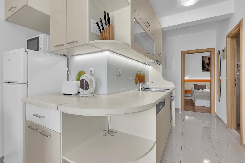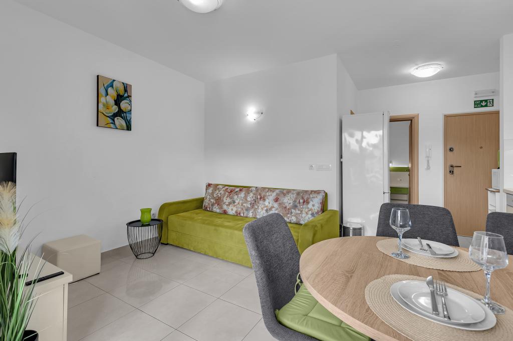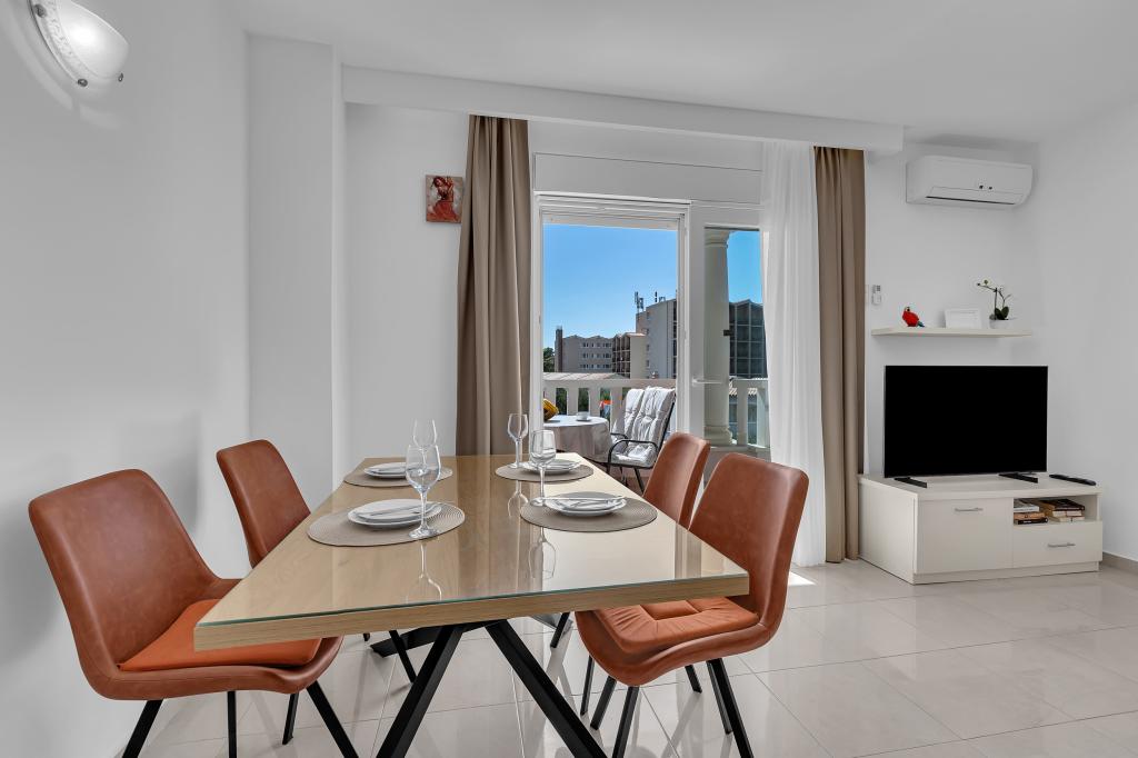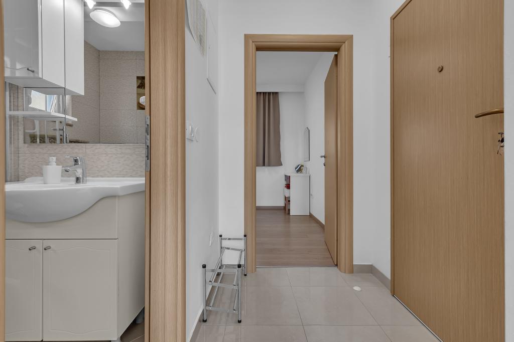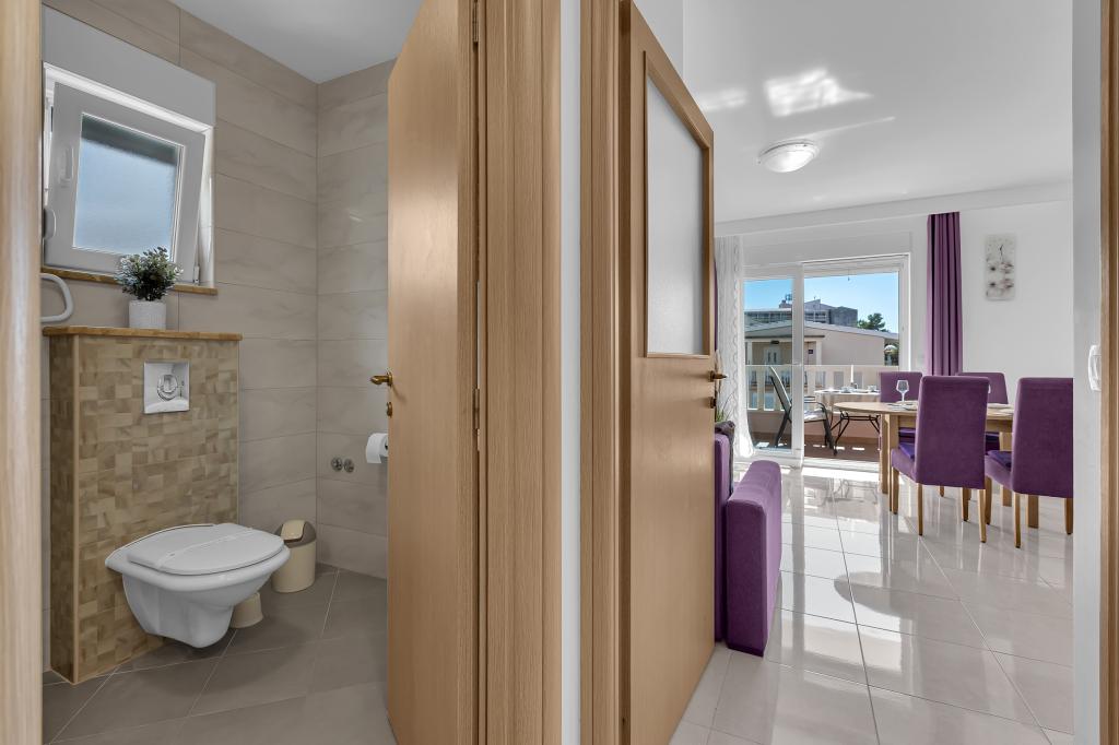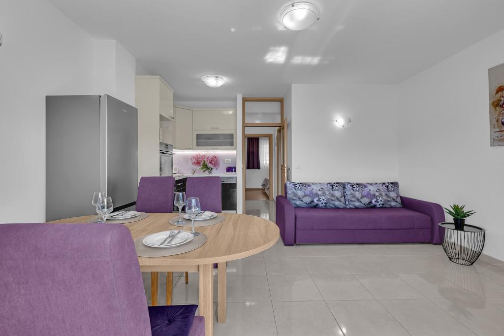 NOVA STANOVANJA! Vsi naši apartmaji so moderno opremljeni. Skupaj imamo v ponudbi šest (6) apartmajev, od katerih je pet (5) enosobnih in en dupleks - dvosoben. Na dvorišču je majhen bazen za goste, a) Enosobni apartmaji (2 odrasla in 2 otroka) imajo: sobo z zakonsko posteljo, veliko kopalnico z veliko tuš kabino, popolnoma opremljeno moderno kuhinjo z jedilnico in dnevno sobo s klimatsko napravo in udobnim raztegljivim kavčem za dva odrasla otroka ter brezžični internet. Vsako od teh stanovanj ima velik 9 m2 velik balkon iz dnevne sobe. b) Dvosobno, dvonadstropno stanovanje 4 (4 odrasli in 2 otroka) ima v prvem nadstropju moderno sobo z zakonsko posteljo in eno kopalnico s tušem in straniščem, popolnoma opremljeno kuhinjo z jedilnico in dnevno sobo z udobnim raztegljivim kavčem za dva odrasla otroka. V drugo nadstropje se pride po zavitem stopnišču, kjer se nahaja velika soba, kopalnica in ločen WC. . Obe nadstropji sta klimatizirani.