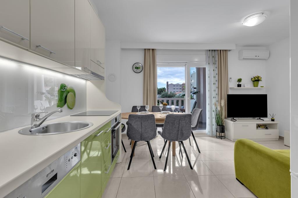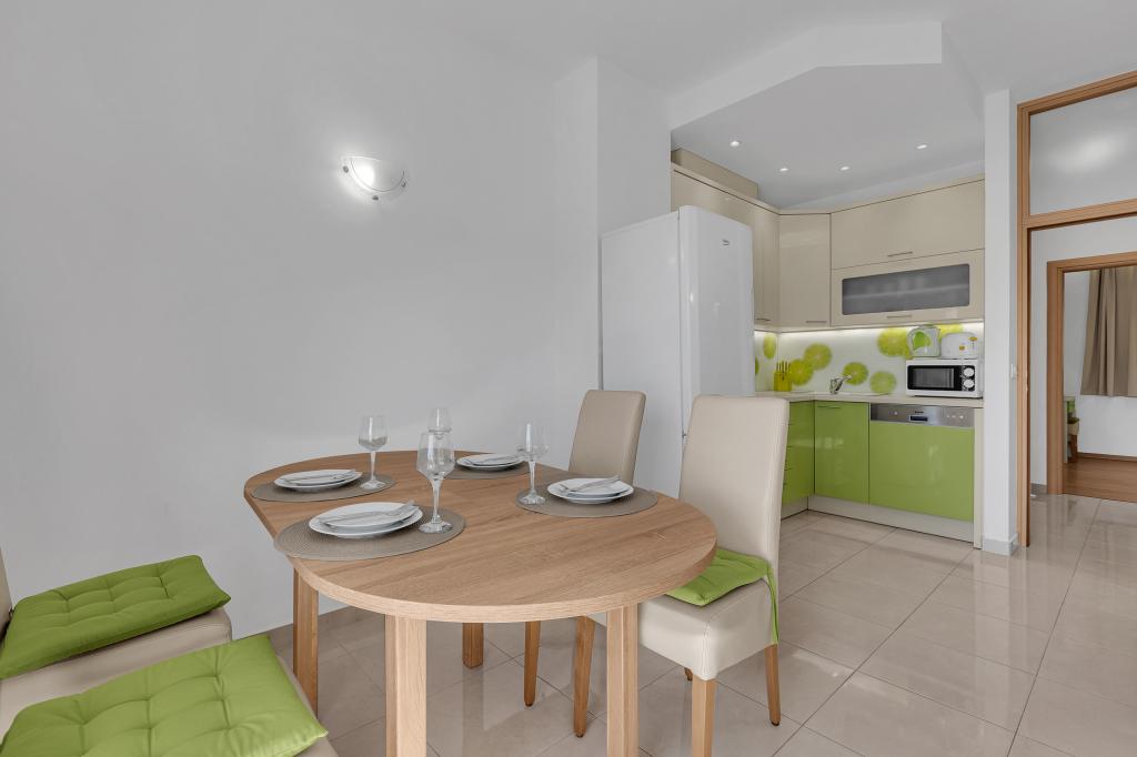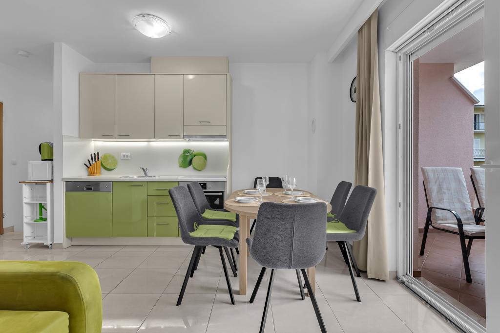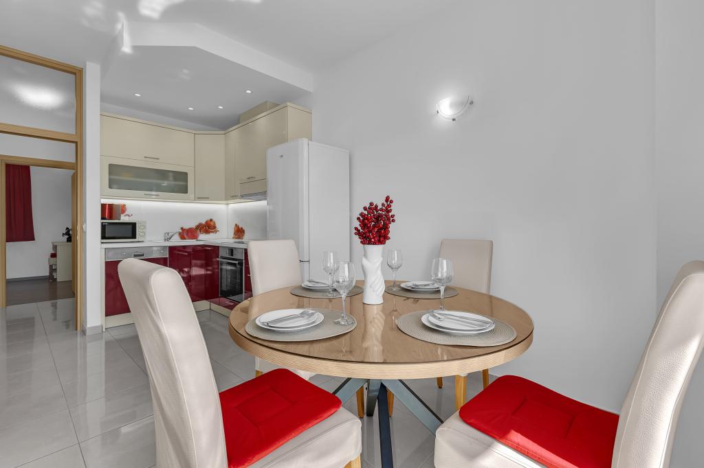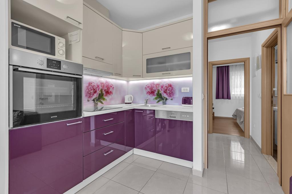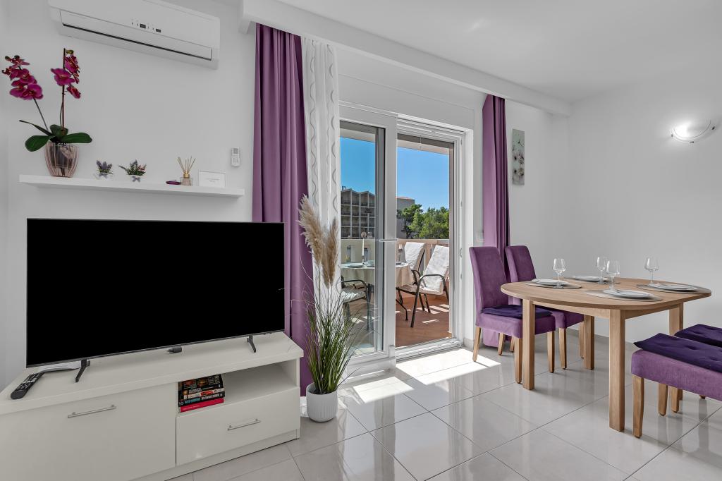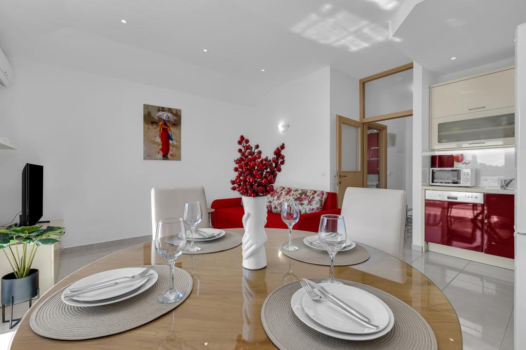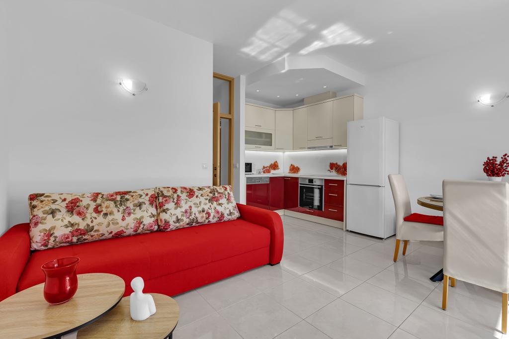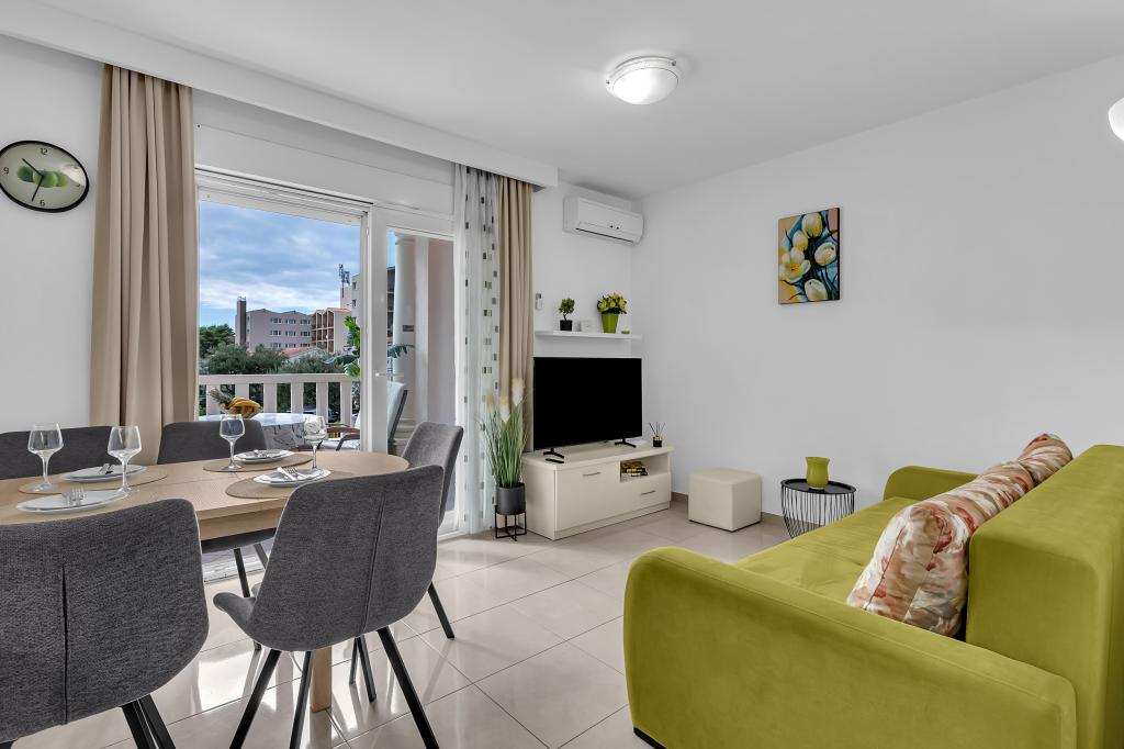 NOVA STANOVANJA! Vsi naši apartmaji so moderno opremljeni. Skupaj imamo v ponudbi šest (6) apartmajev, od katerih je pet (5) enosobnih in en dupleks - dvosoben. Na dvorišču je majhen bazen za goste, a) Enosobni apartmaji (2 odrasla in 2 otroka) imajo: sobo z zakonsko posteljo, veliko kopalnico z veliko tuš kabino, popolnoma opremljeno moderno kuhinjo z jedilnico in dnevno sobo s klimatsko napravo in udobnim raztegljivim kavčem za dva odrasla otroka ter brezžični internet. Vsako od teh stanovanj ima velik 9 m2 velik balkon iz dnevne sobe. b) Dvosobno, dvonadstropno stanovanje 4 (4 odrasli in 2 otroka) ima v prvem nadstropju moderno sobo z zakonsko posteljo in eno kopalnico s tušem in straniščem, popolnoma opremljeno kuhinjo z jedilnico in dnevno sobo z udobnim raztegljivim kavčem za dva odrasla otroka. V drugo nadstropje se pride po zavitem stopnišču, kjer se nahaja velika soba, kopalnica in ločen WC. . Obe nadstropji sta klimatizirani.