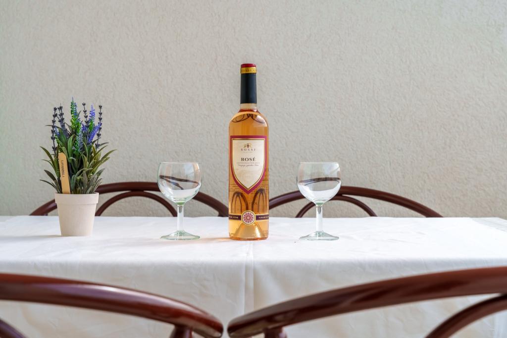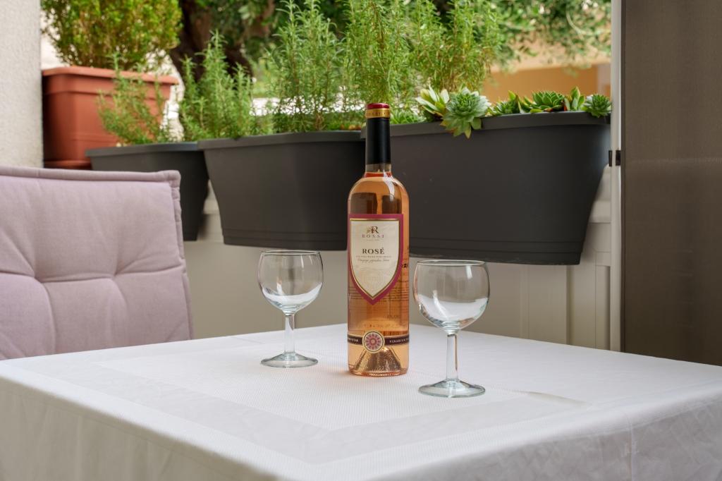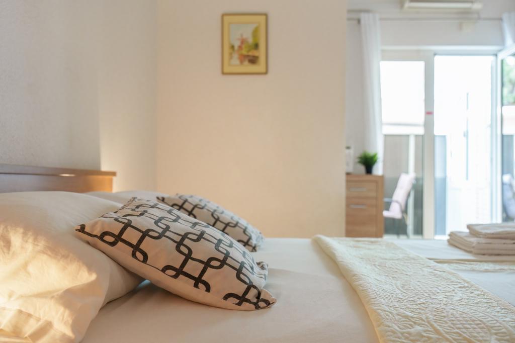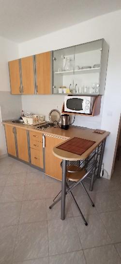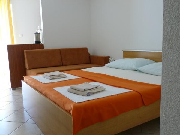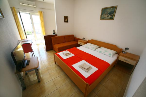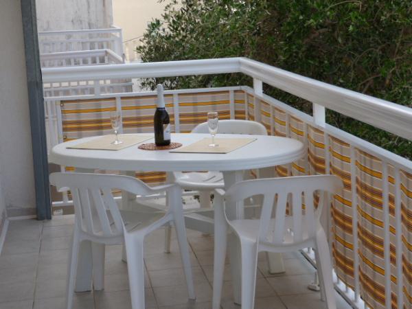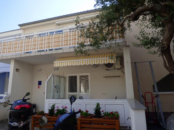 Hiša v mirnem delu mesta v slepi ulici z malo prometa. Oddaljenost od plaže je približno 500m (približno 5-10 minut hoje). Hiša ima več apartmajev, ki so opremljeni za 2, 3 ali 4 osebe. Vsi apartmaji so klimatizirani in sodobno opremljeni z vsem, kar potrebujete za udobno bivanje. Leto izgradnje je 2008. Večina apartmajev ima pogled na morje. Za vse goste so zagotovljena parkirna mesta. Turistična taksa 1 € na osebo na dan Vsi ostali stroški so vključeni v ceno