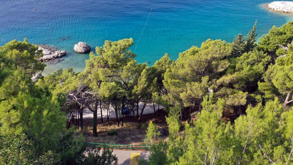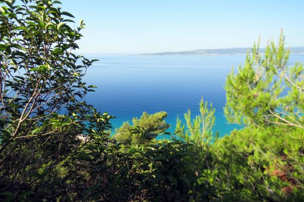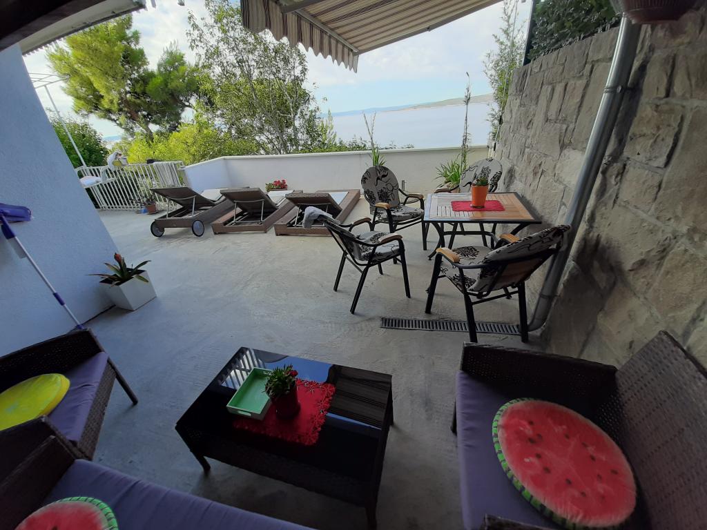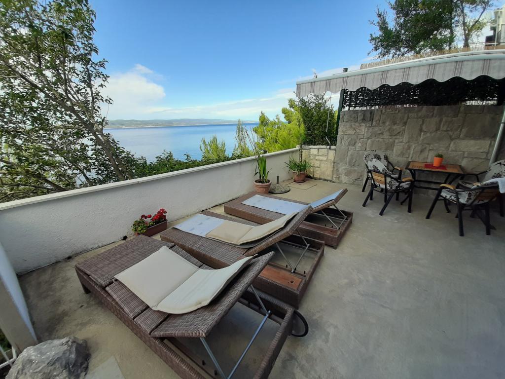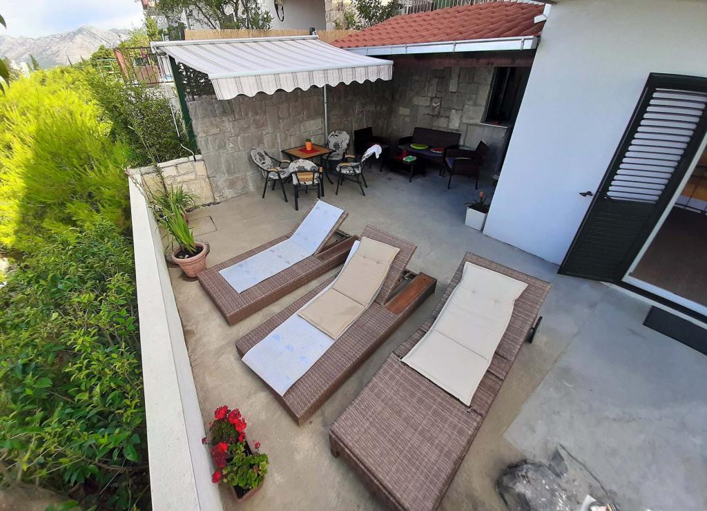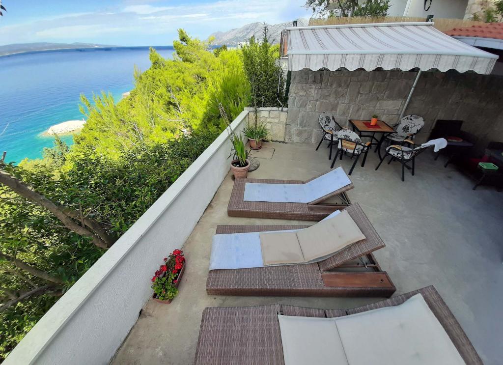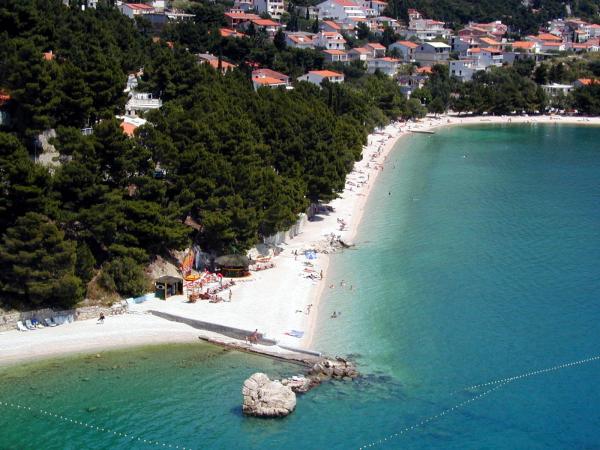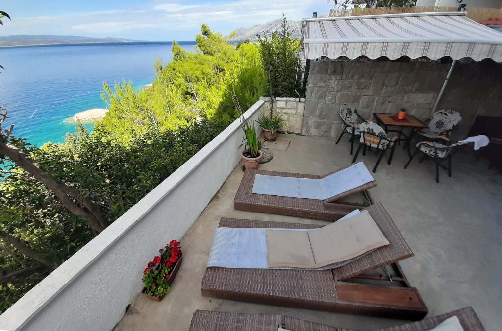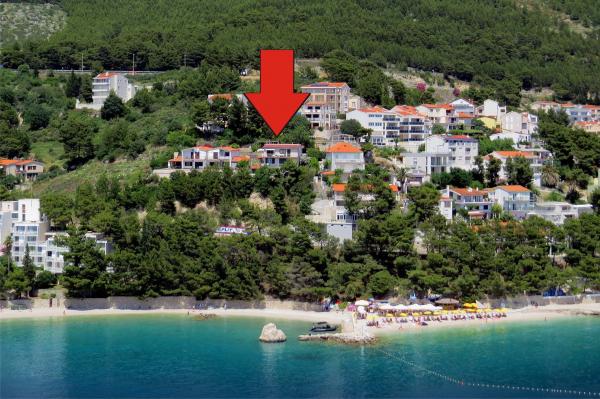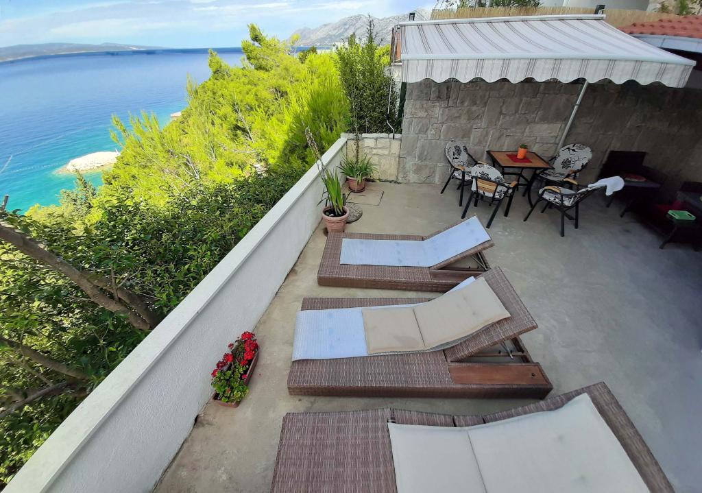 Na novo obnovljen in popolnoma opremljen apartma v mirnem predelu med Baško Vodo in Brela, ki se nahaja v prvi vrsti do morja, nad čudovito plažo. Objekt je od središča obeh krajev oddaljen 10 minut hoje (približno 500 m). Velika terasa s baldahinom in pogledom na morje, 2 dvoposteljni sobi, dve kopalnici in kuhinja z dostopom na teraso. Vse novo. Stanovanje se nahaja v ločenem nadstropju z ločenim vhodom, velik vrt ločen od vseh sosedov. Zasebno parkirišče v senci tik nad hišo.