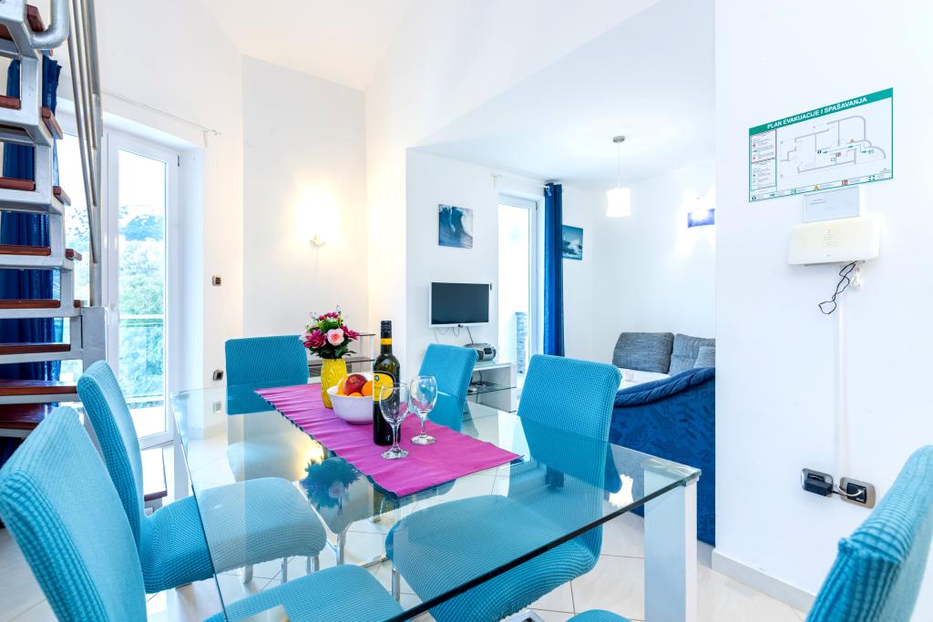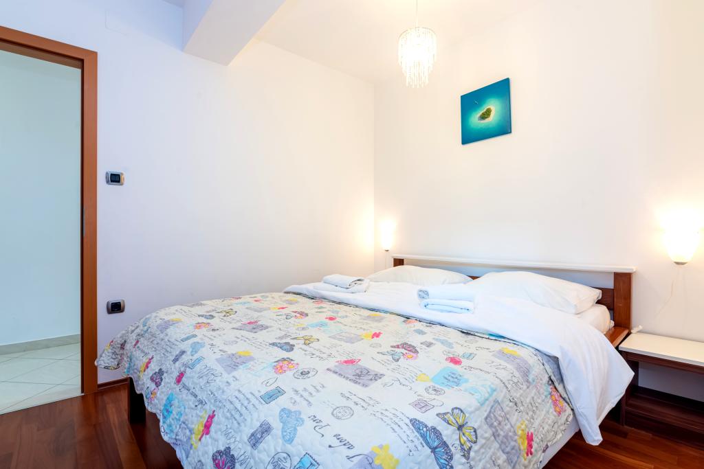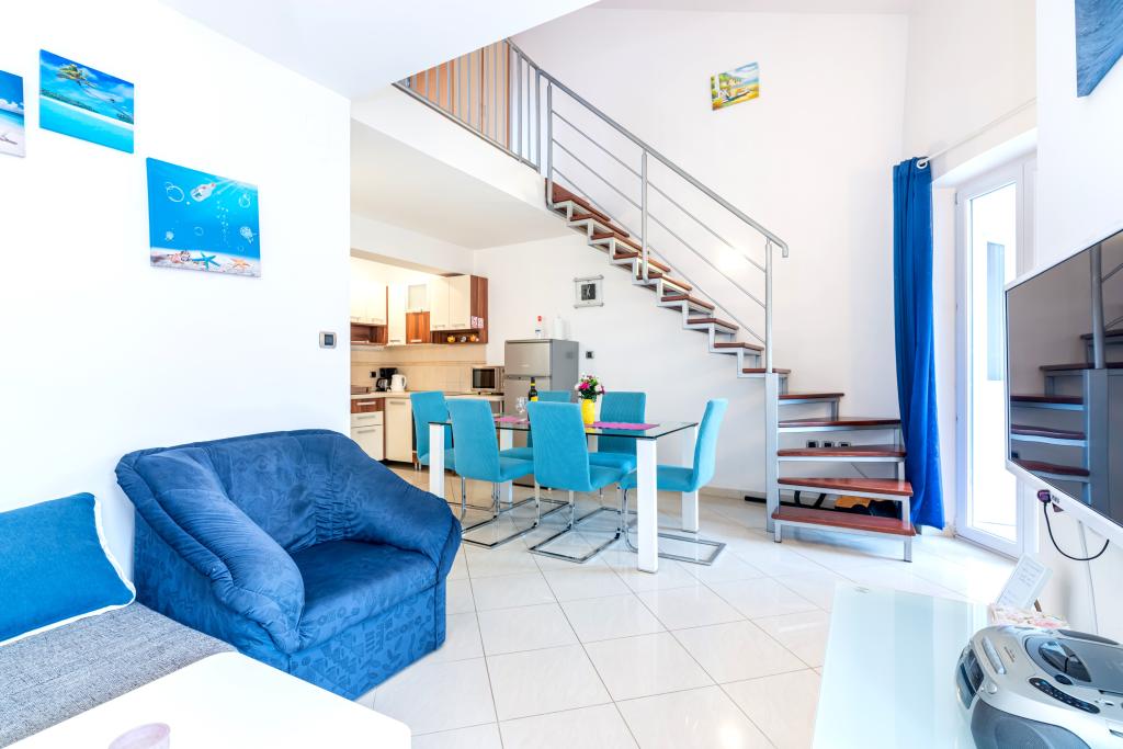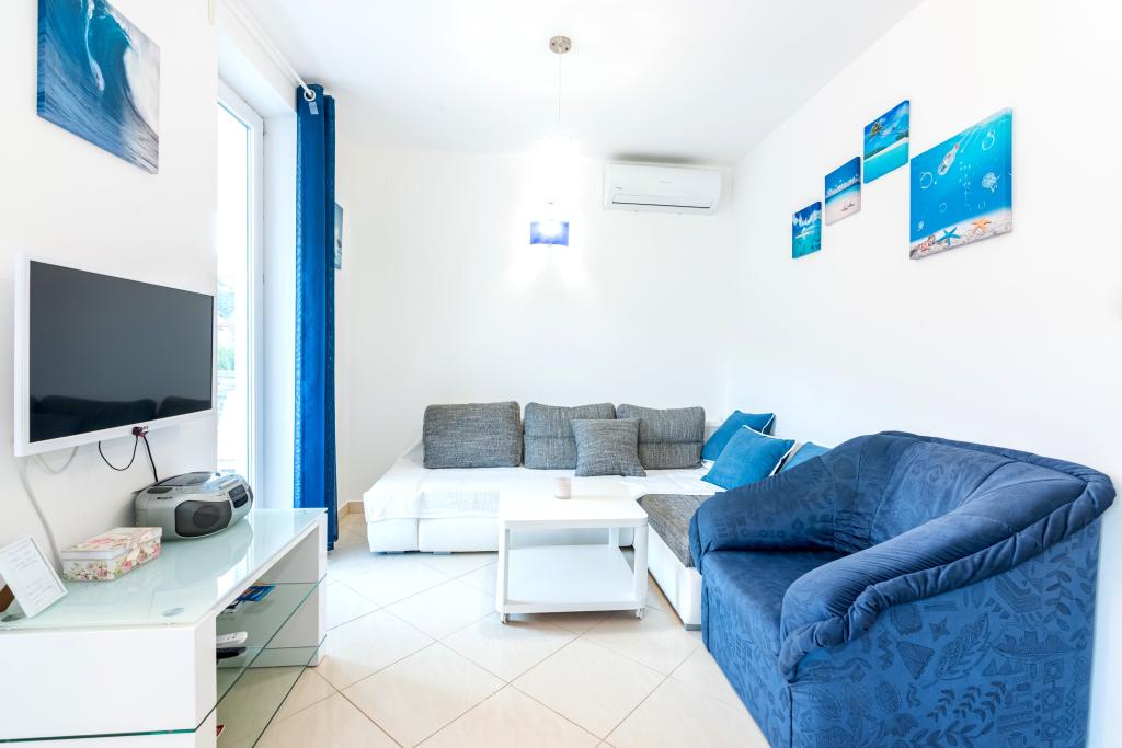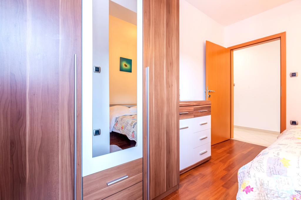 Stanovanje se nahaja v 2. in 3. nadstropju. Ima 2 dvoposteljni sobi z zakonskimi posteljami, 1 dvoposteljno sobo z enojnima posteljama, dnevno sobo s kavčem za 2 osebi, 2 kopalnici, popolnoma opremljeno kuhinjo in jedilnico. Apartma se nahaja približno 3 minute hoje od osrednje plaže. Ta sodoben apartma se nahaja v mirnem predelu in je opremljen s 3 klimatskimi napravami, brezplačnim brezžičnim internetom, SAT-TV, prostorno teraso in brezplačnim zasebnim parkiriščem pred hišo. V bližini objekta je tudi manjša trgovina in restavracija.