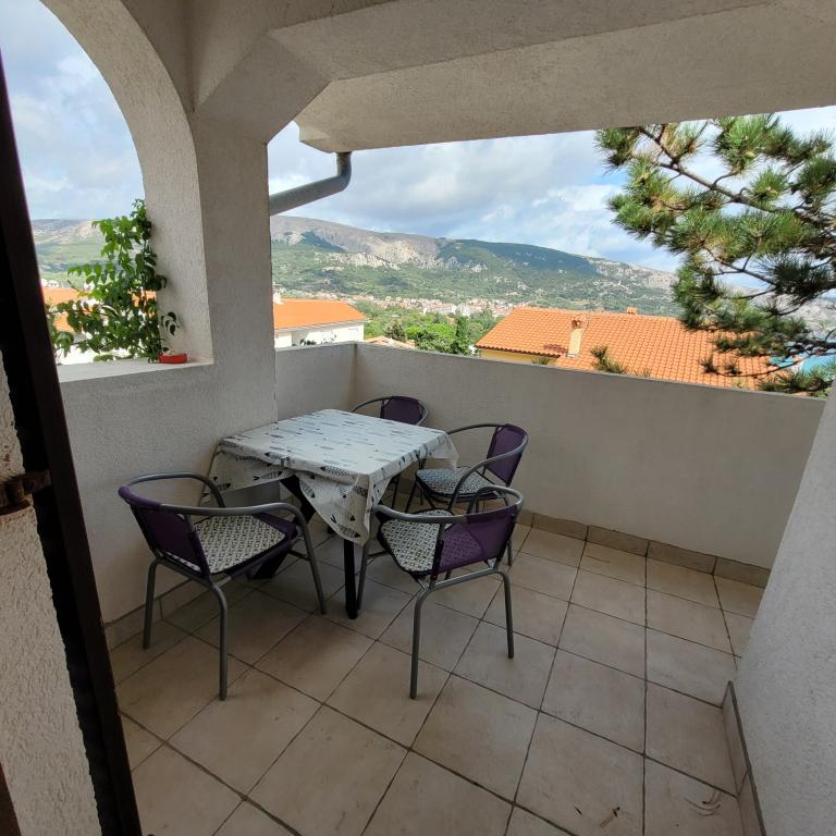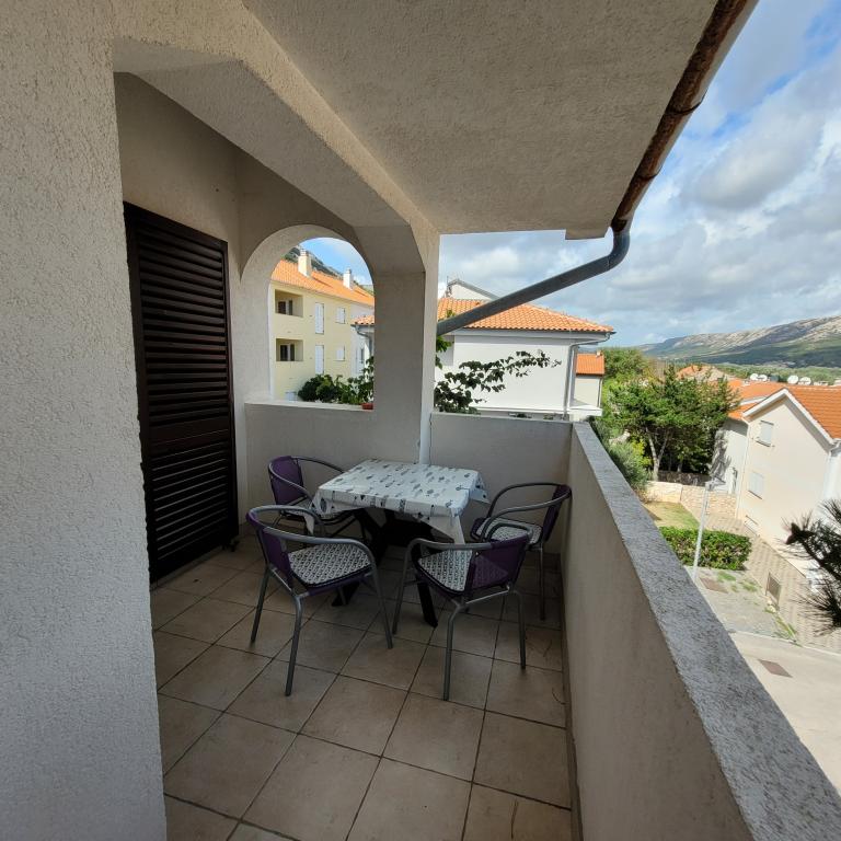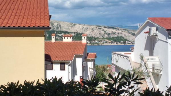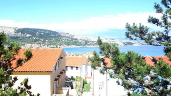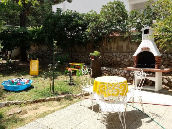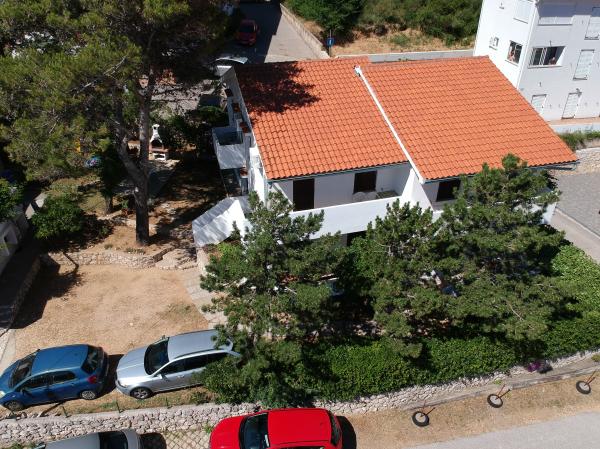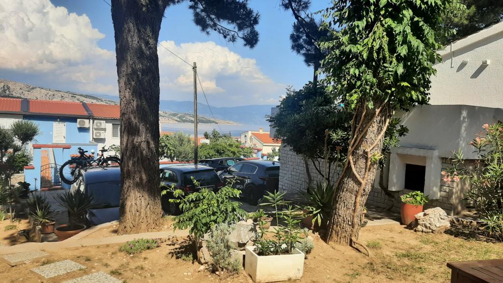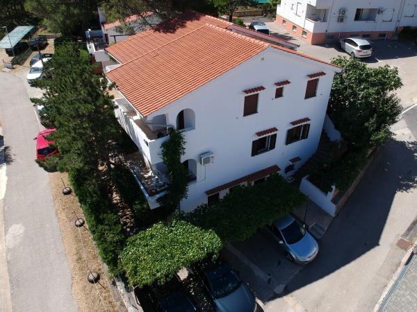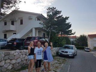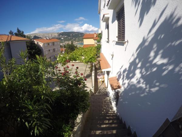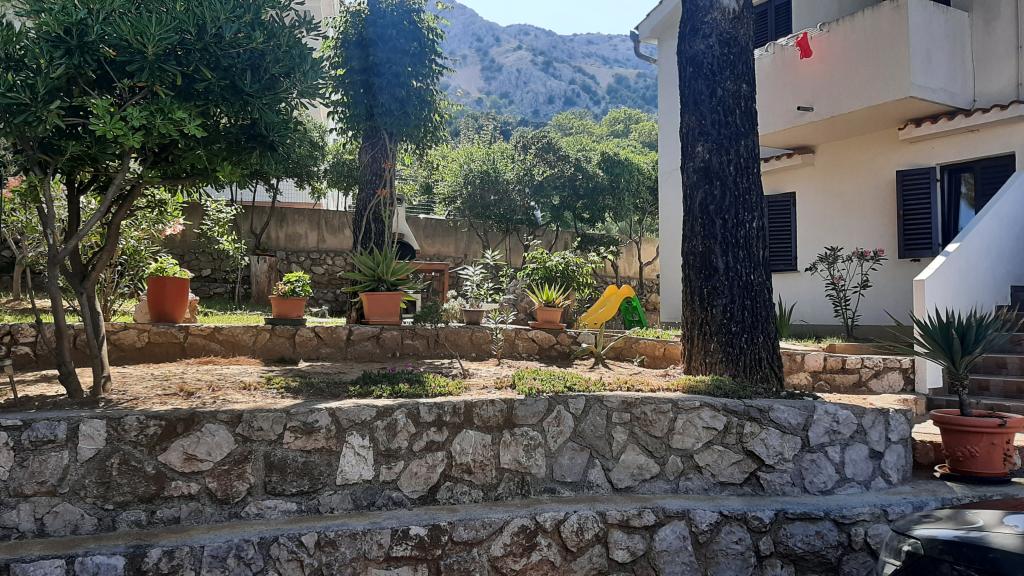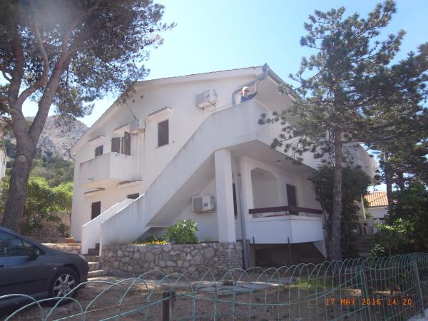 Nahajamo se v lepi in novi hiši, obdani z zelenjem, v mirnem delu Baške na otoku Krku, 250 metrov od morja in približno 300 metrov od čudovite in edinstvene prodnate plaže. Od centra, kjer so pošta, banka, menjalnica, ambulanta, restavracije, smo približno 1000 metrov. Najbližje trgovine, restavracije itd. So oddaljene približno 200 m. Nudimo 3 apartmaje za 4 -5 oseb in 3 studio apartmaje za 2-3 osebe. Vsak od večjih apartmajev ima 2 spalnici, dnevno sobo, kuhinjo, kopalnico, teraso. Vsak apartma ima ločen vhod in izhod na dvorišče ter parkirišče. Vsi apartmaji so opremljeni s klimatsko napravo, satelitsko televizijo, brezžičnim internetom (WI-FI), hladilnikom, aparatom za kavo, pomivalnim strojem itd. Skrb za goste in apartmaje v sezoni poleg lastnika in gostiteljice, ki je prisotna ves dan . Posteljnino in brisače menjajo enkrat tedensko