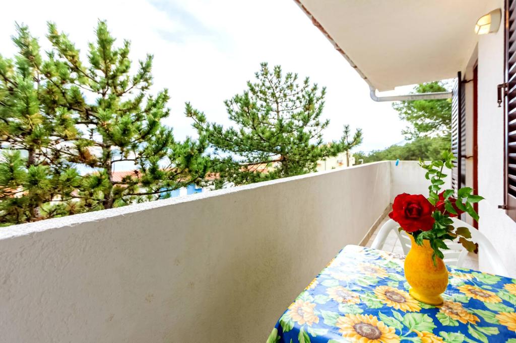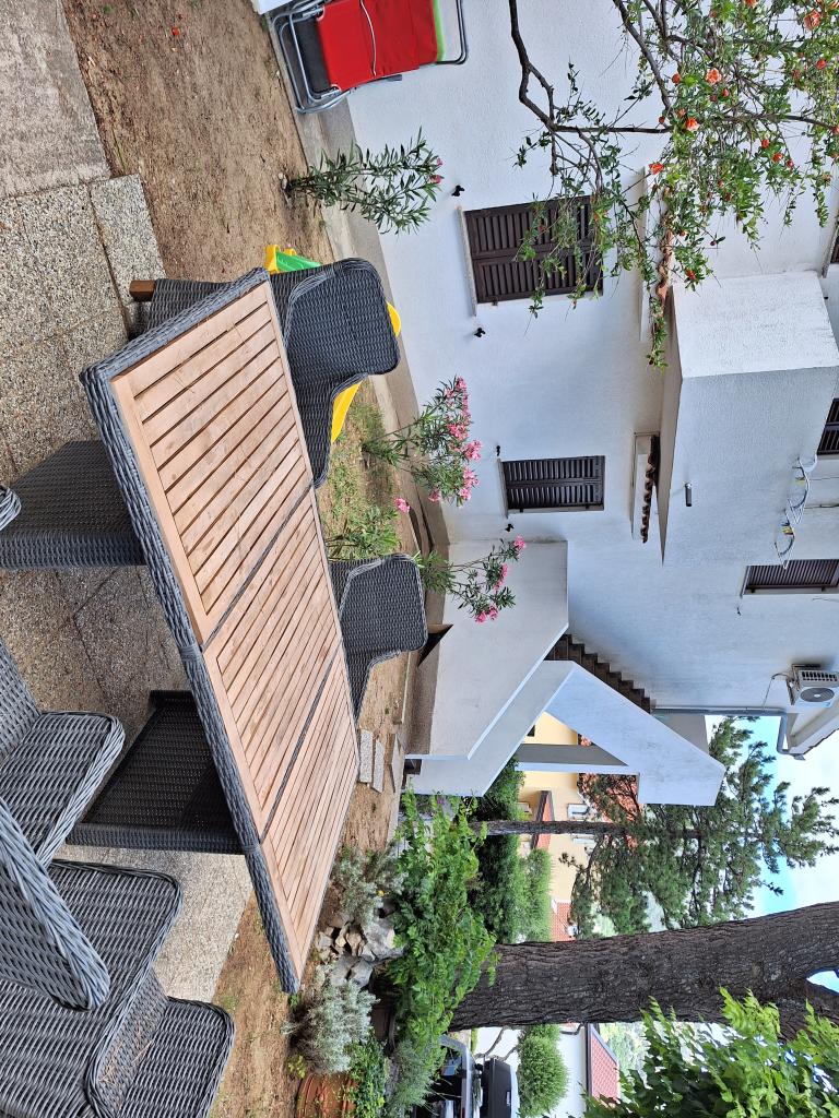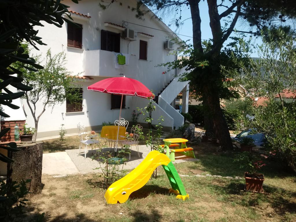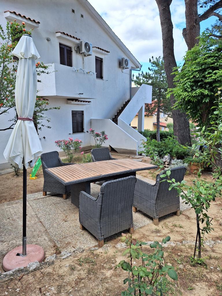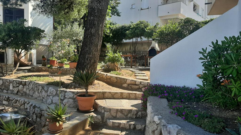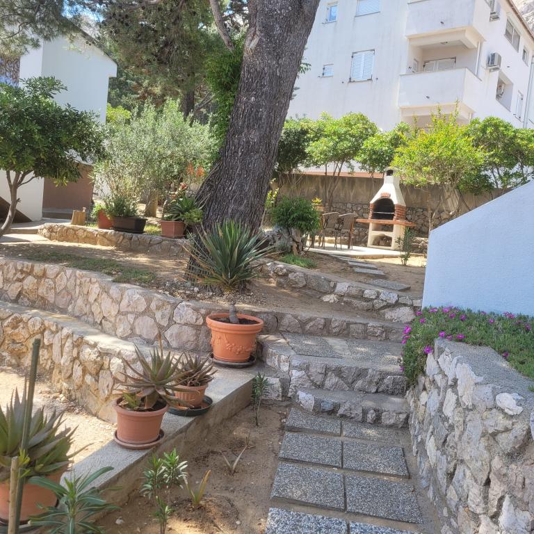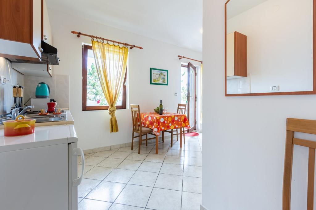 Nahajamo se v lepi in novi hiši, obdani z zelenjem, v mirnem delu Baške na otoku Krku, 250 metrov od morja in približno 300 metrov od čudovite in edinstvene prodnate plaže. Od centra, kjer so pošta, banka, menjalnica, ambulanta, restavracije, smo približno 1000 metrov. Najbližje trgovine, restavracije itd. So oddaljene približno 200 m. Nudimo 3 apartmaje za 4 -5 oseb in 3 studio apartmaje za 2-3 osebe. Vsak od večjih apartmajev ima 2 spalnici, dnevno sobo, kuhinjo, kopalnico, teraso. Vsak apartma ima ločen vhod in izhod na dvorišče ter parkirišče. Vsi apartmaji so opremljeni s klimatsko napravo, satelitsko televizijo, brezžičnim internetom (WI-FI), hladilnikom, aparatom za kavo, pomivalnim strojem itd. Skrb za goste in apartmaje v sezoni poleg lastnika in gostiteljice, ki je prisotna ves dan . Posteljnino in brisače menjajo enkrat tedensko