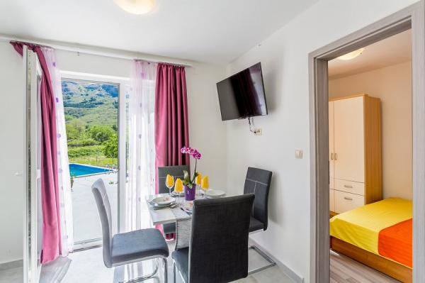Čisti in dobro opremljeni apartmaji. Odlična sprostitev na terasi s pogledom na bazen in gore. V bližini trgovine. Nekaj zabavnega za vsakogar - za lenuhe in za aktivne počitke. Prijetni gostitelji. Priporočam.