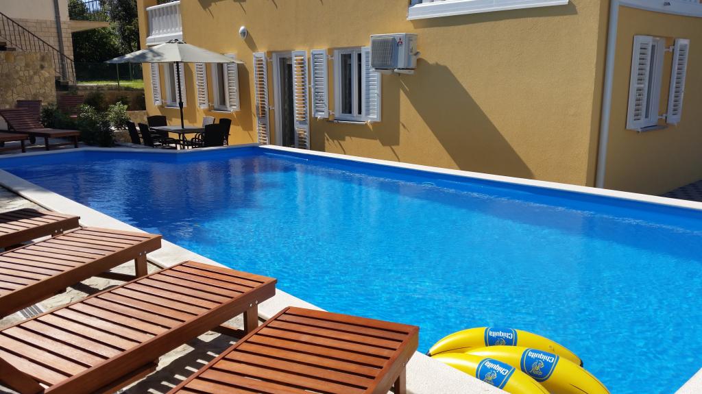 Moderno opremljeni apartmaji, le 5 minut hoje od čudovite plaže Vela, s skupnim zunanjim bazenom in žarom. Hiša ima 9 apartmajev, opremljenih s pomivalnim strojem, pralnim strojem, sefom, klimatsko napravo, internetom in SAT-TV. Vsak apartma ima eno parkirno mesto. Hišni ljubljenčki niso dobrodošli.