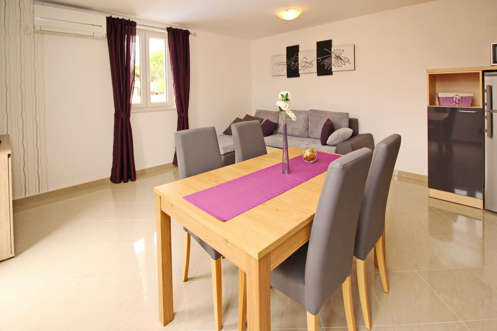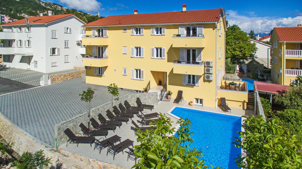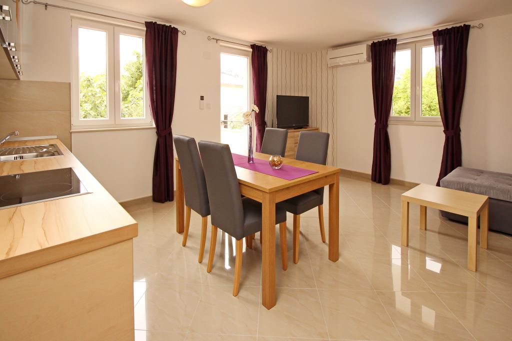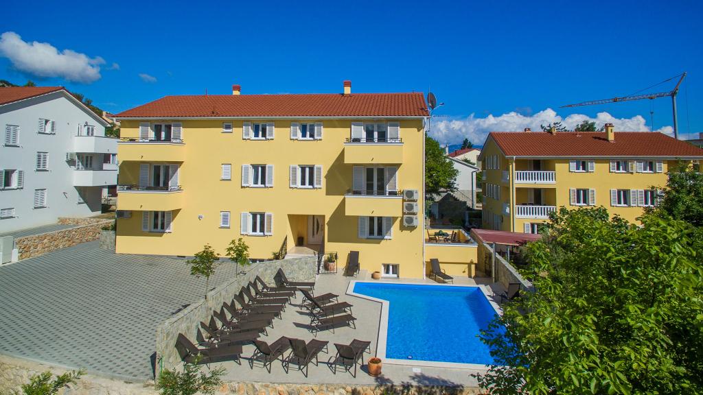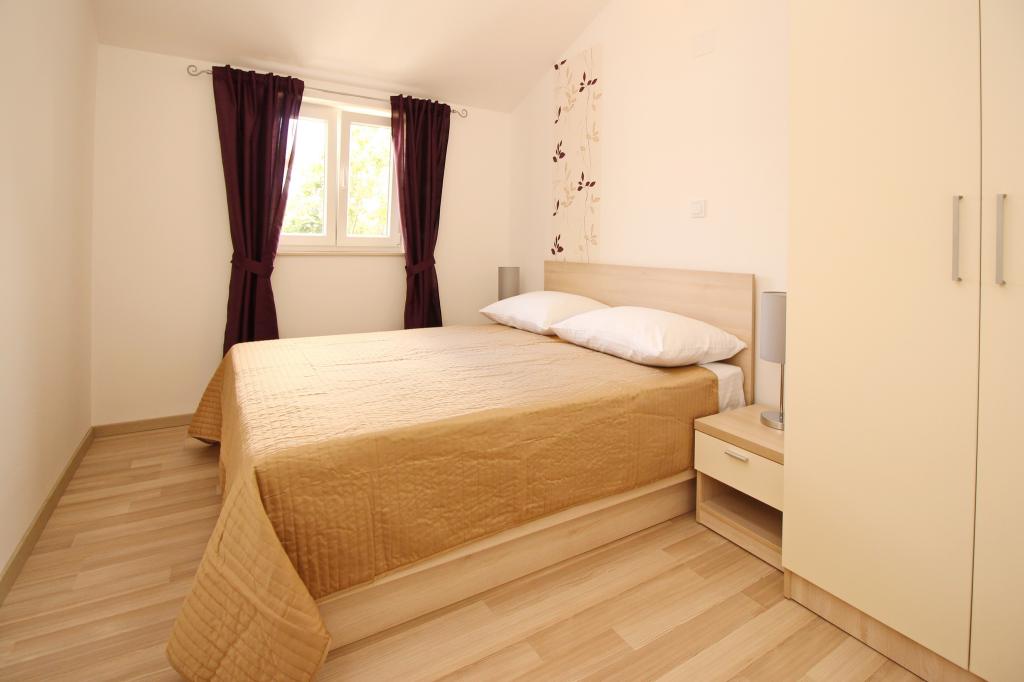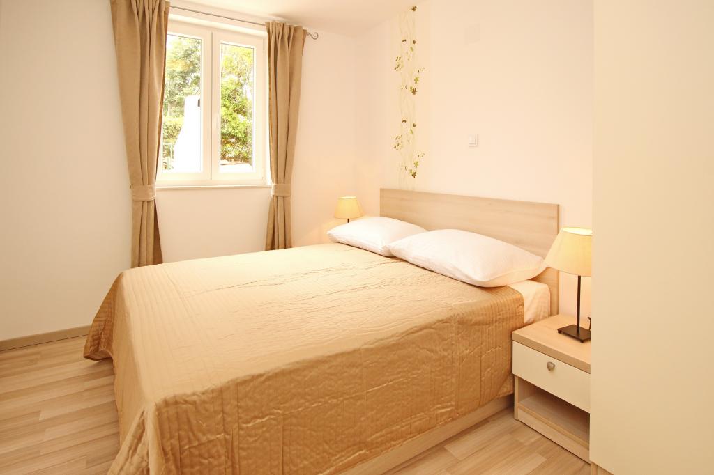 Moderno opremljeni apartmaji, le 300 m od čudovite plaže Vela Plaža, s skupnim zunanjim bazenom in žarom. Hiša ima 13 apartmajev, od katerih se 4 nahajajo v kleti. Apartmaji v kleti uporabljajo skupno teraso (20 m2), ki se nahaja v zgornjem nadstropju. Vsaka namestitvena enota je opremljena s pomivalnim strojem, pralnim strojem, klimatsko napravo, internetom in SAT-TV. Gostom je na voljo eno parkirno mesto. Hišni ljubljenčki niso dobrodošli.
