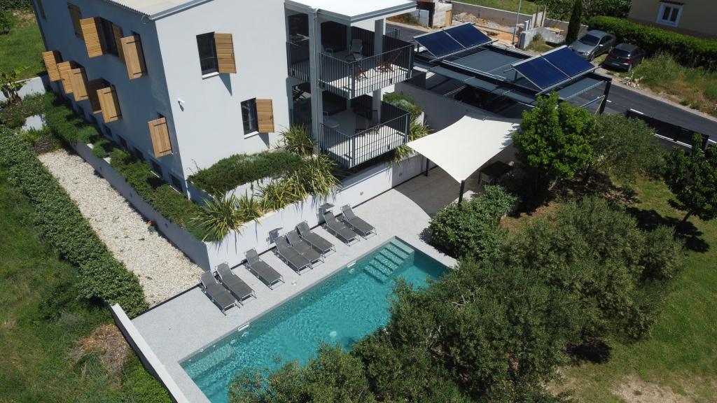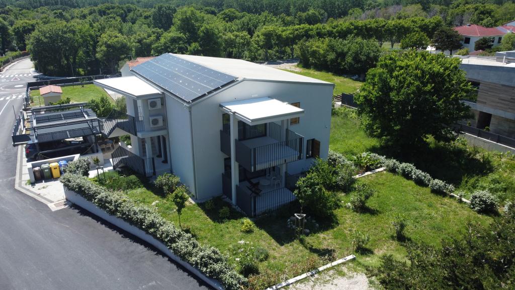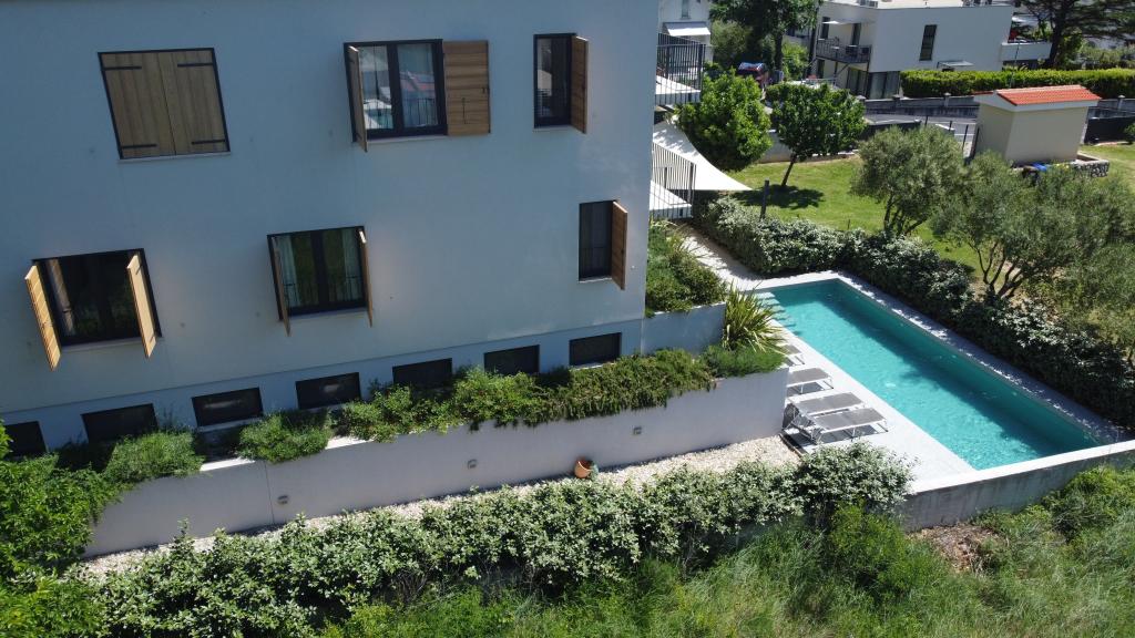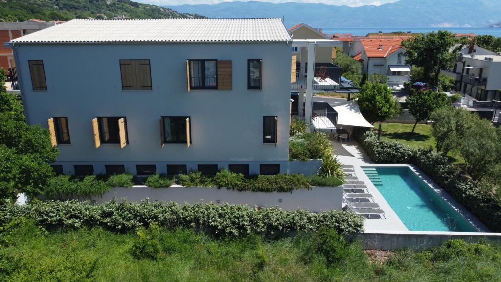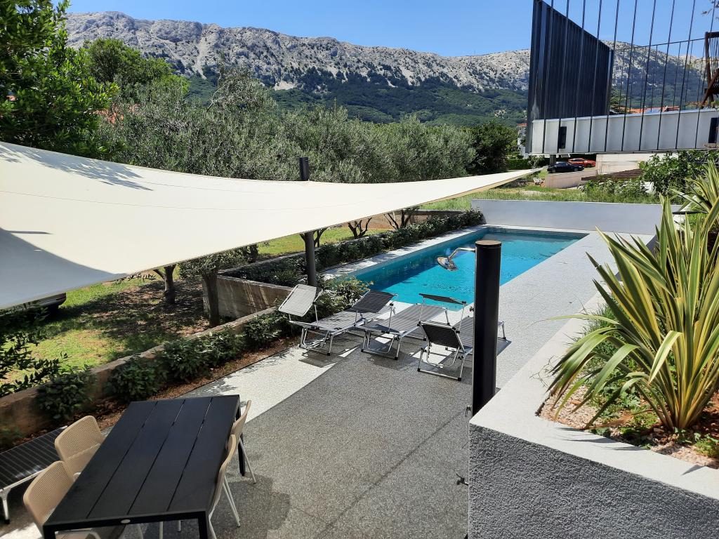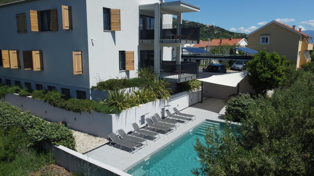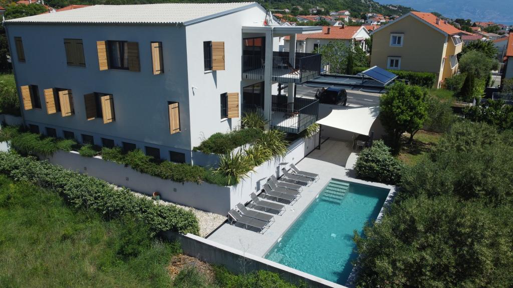 Moderno urejeni in popolnoma opremljeni apartmaji v novogradnji z bazenom. Prijeten prostor za sprostitev okoli bazena. Hiša se nahaja v Baški, na mirni lokaciji in 7 minut hoje od Vele plaže.
