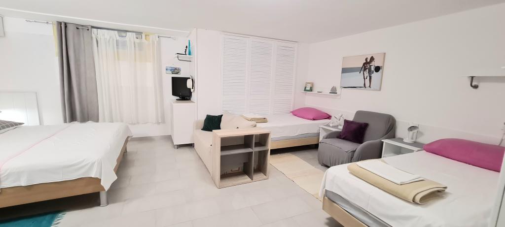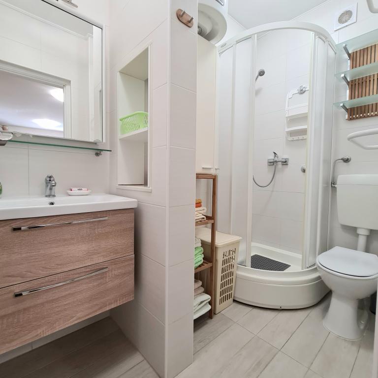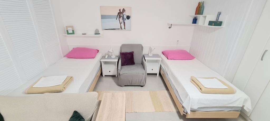 Namestitvene enoteOb rezervaciji je potrebno plačilo nepovratnega akontacije v višini 40 % celotnega zneska. Akontacija se plača na podlagi ponudbe. Preostanek celotnega zneska vaše rezervacije je treba plačati ob prihodu v apartma, v gotovini. Cena nočitve vključuje prijavo pri Turistični zvezi, turistično takso, uporabo klimatske naprave, otroške posteljice, WIFI, parkiranje in ekološko takso. Prijava je na dan prihoda od 14.00 ure, odjava pa na dan odhoda od 7.00 do 9.00 ure. Ob rezervaciji je potrebno navesti natančno število oseb, ki bodo uporabljale apartma. Vse osebe, ki uporabljajo apartma, morajo biti prijavljene pri Turistični zvezi. Otroško posteljico je treba rezervirati ob rezervaciji namestitve. Za otroško posteljico ni doplačila. Hišni red: Zabave niso dovoljene. Gostom ni dovoljeno povzročati hrupa od 23.00 do 7.00 ure.