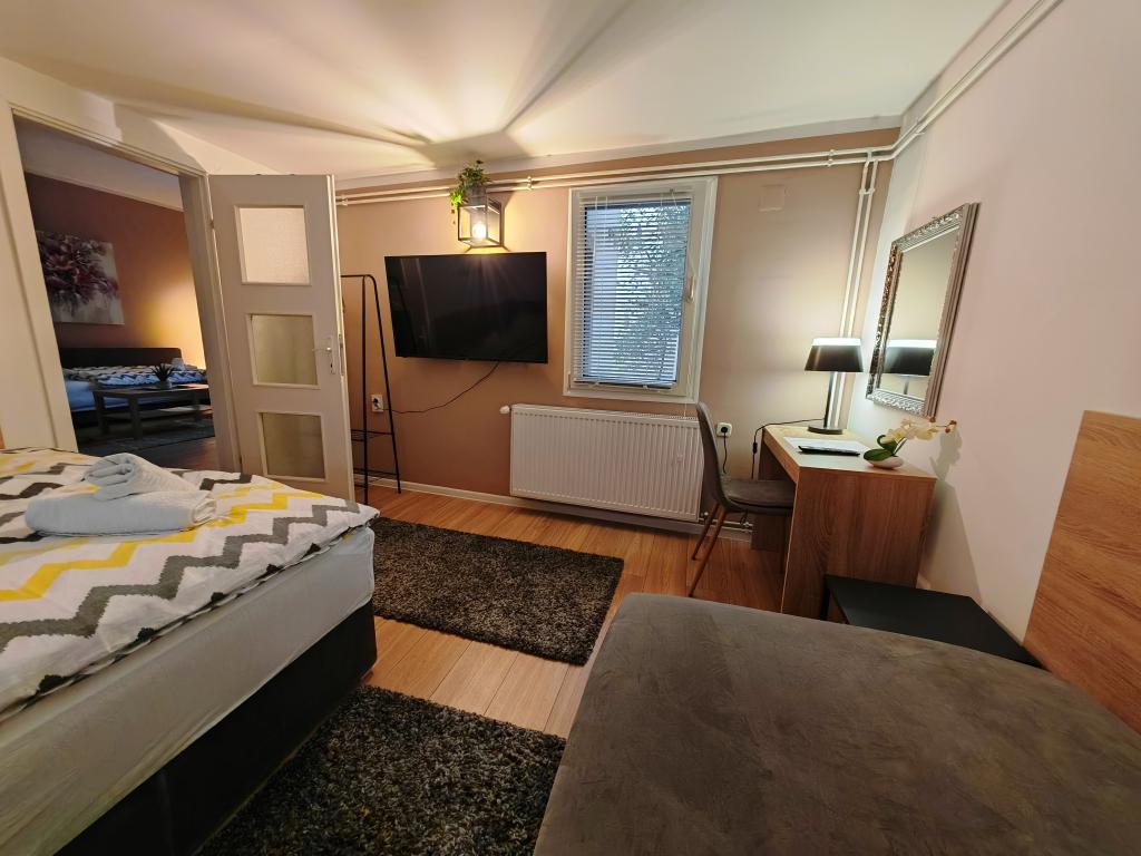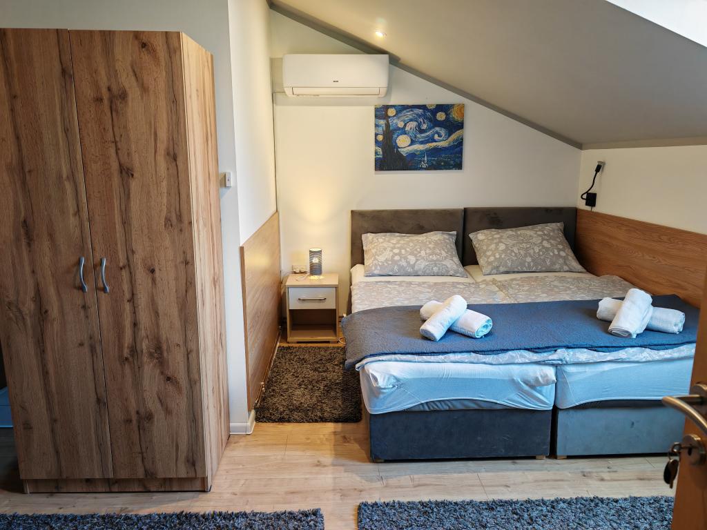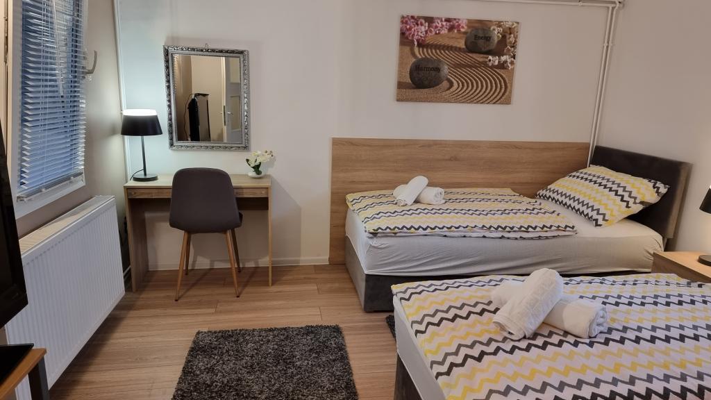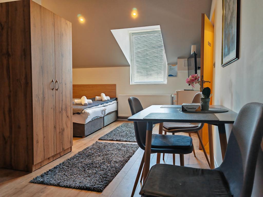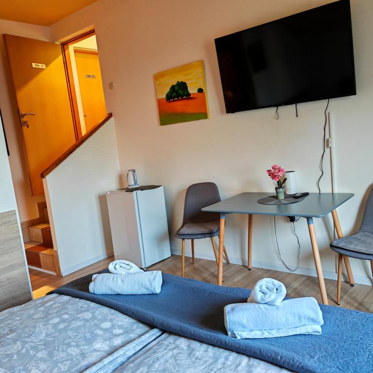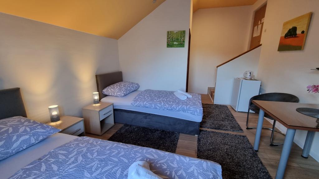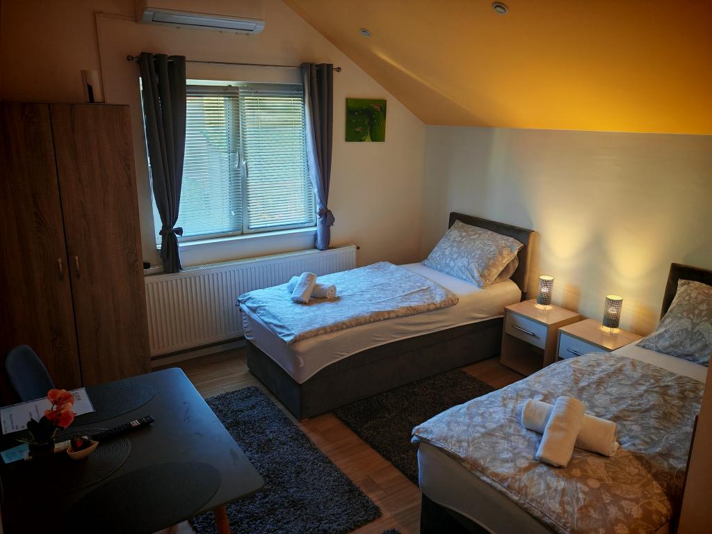 Privatna namestitev Corina, moderno in udobno opremljene sobe in apartma v mirnem mestu Bilje, predmestju Osijeka, 3 km od naravnega parka Kopački rit in 5 km od mesta Osijek (Tvrđe). lahko uživajo v blagodatih narave in se prebujajo ob vonju svežega cvetja in žvrgolenju ptic. Soba (dvoposteljna 23 m2) Značilnosti sobe: - pogled na vrt - SMART TV 126 cm (internetna televizija, Netflix) - klima - likalnik - jedilna miza z dvema stoloma - centralno ogrevanje - mreža proti komarjem - garderobna omara - kopalnica s tušem in WC-jem - sušilec za lase - brezplačen toaletni pribor - posteljnina - brezplačen wi-fi internet. Triposteljna soba (25 m2) Značilnosti sobe: - pogled na vrt - SMART TV 110 cm (internet televizija, Netflix) - klima - likalnik - jedilna miza z dvema stoloma - centralno ogrevanje - mreža proti komarjem - kopalnica s tušem in WC Apartma 46 M2 vrt pogled - SMART TV 120 cm (internet televizija-dnevna soba) Smart TV 126 cm spalnica pralni stroj