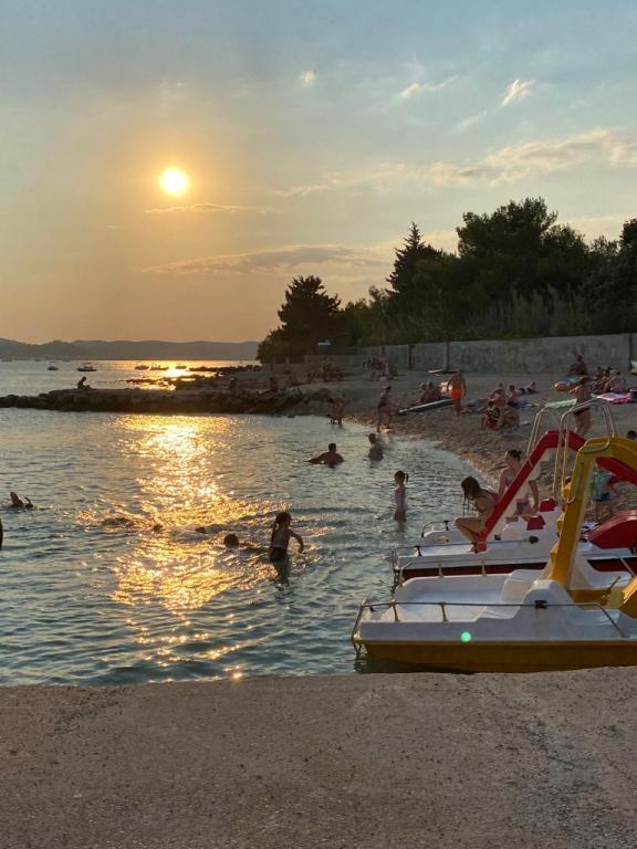 Dvosobno stanovanje se nahaja v naselju Kumenat v zalivu med plažo Soline in Crveno luko. 1 red do morja, kompletno opremljeno, brisače in posteljnina, WI FI. Največ za 4 osebe. Zagotovljeno 1 brezplačno parkirno mesto. Bližina trgovin, zabavni park Biograd, restavracije v kampu Soline, peščena plaža Soline z animacijo za otroke in odrasle na razdalji cca 800m.