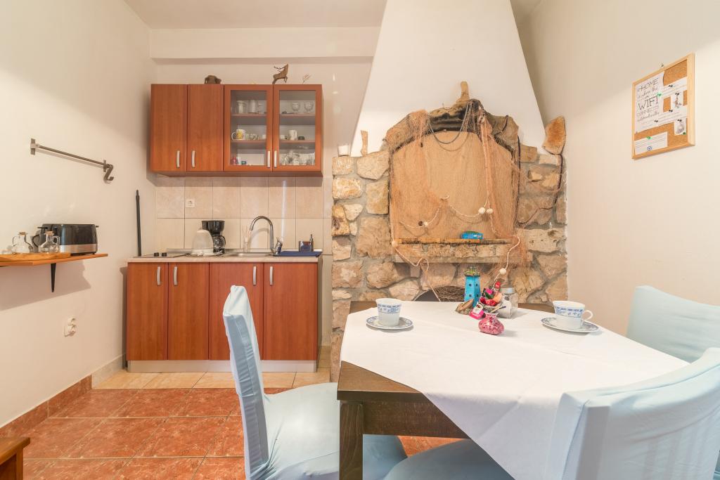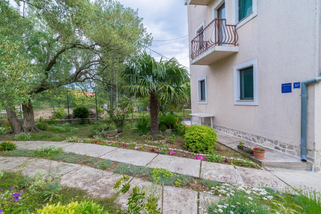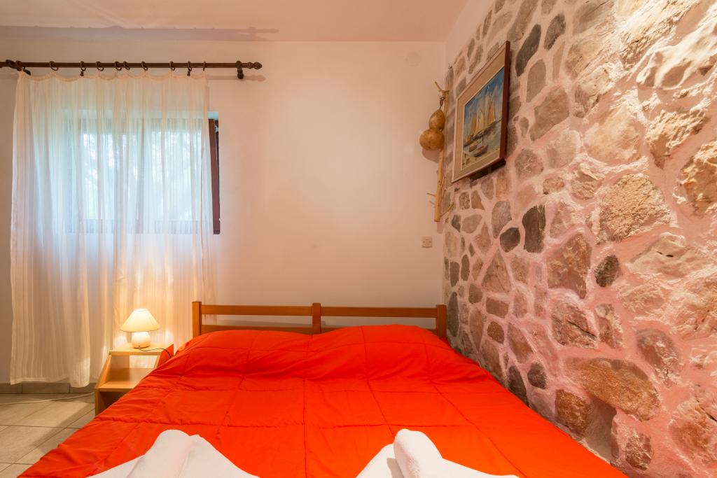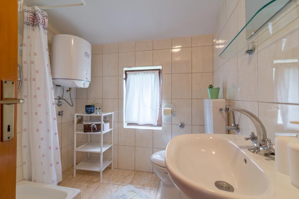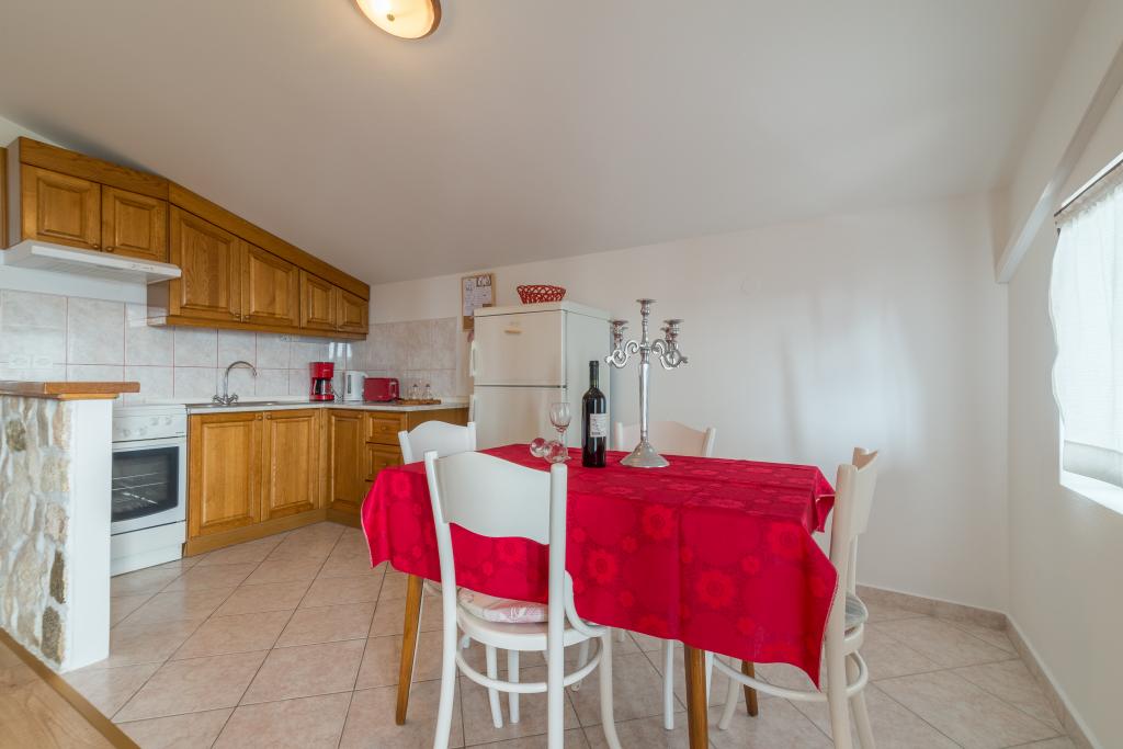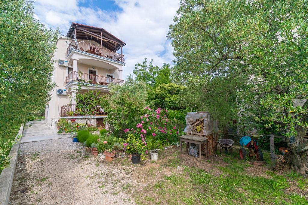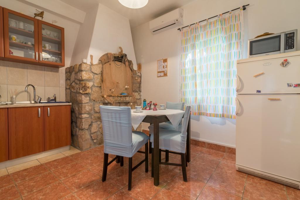 Družinska hiša z dvema apartmajema in pomožnega objekta z eno stanovanje. Apartma A2 smješšten se nahaja v prvem nadstropju in je sestavljen iz kuhinje, spalnico, kopalnico in teraso s pogledom na morje. Apartma A4 +1 se nahaja v zgornjem nadstropju, klimatizirano, dve spalnici z zakonsko posteljo, kopalnica, kuhinja in dnevna soba, terasa s pogledom na morje. A2 +1 se nahaja v pomožnem objektu v pritličju, klima, kuhinja, spalnica (zakonska postelja z dodatnim ležiščem), kopalnica, 50 m od morja.