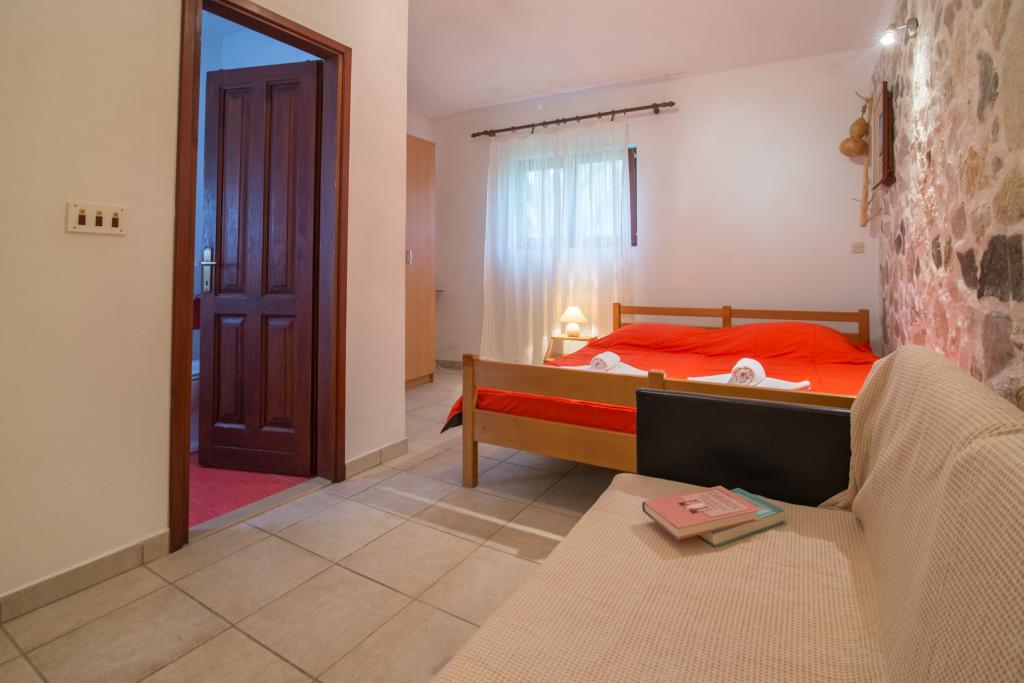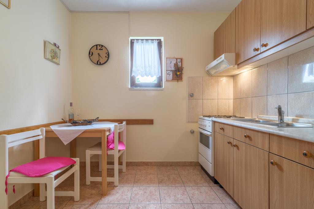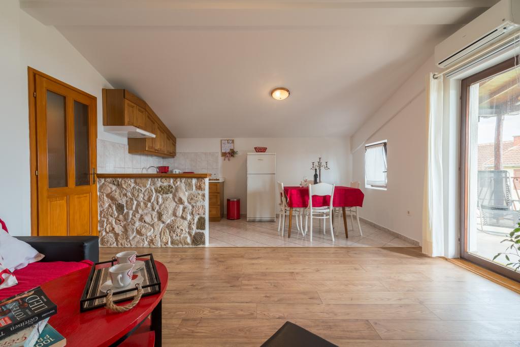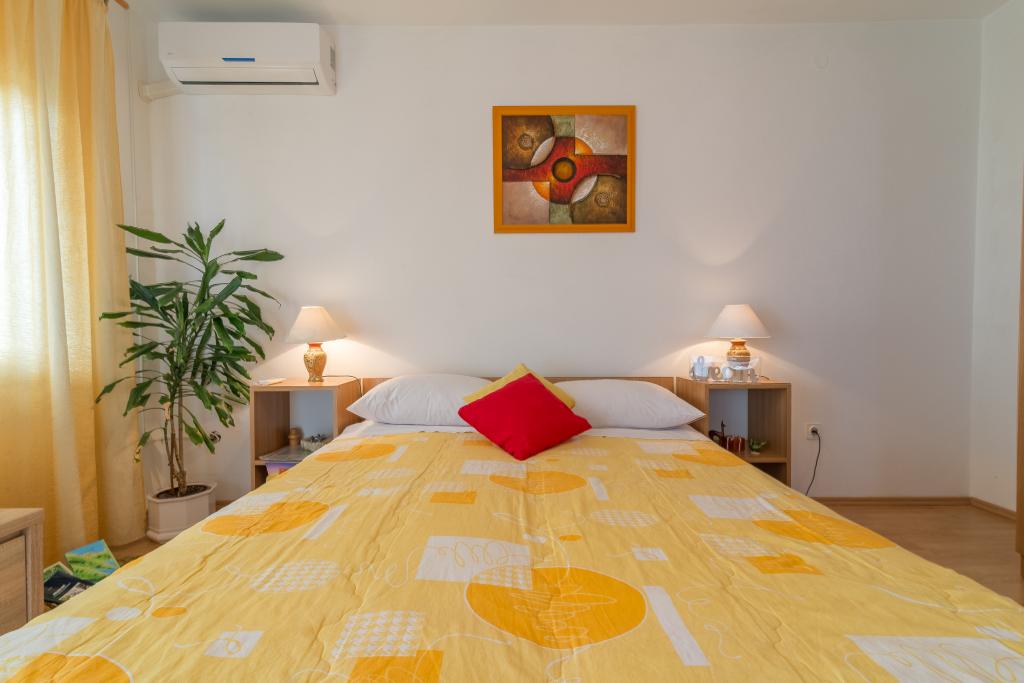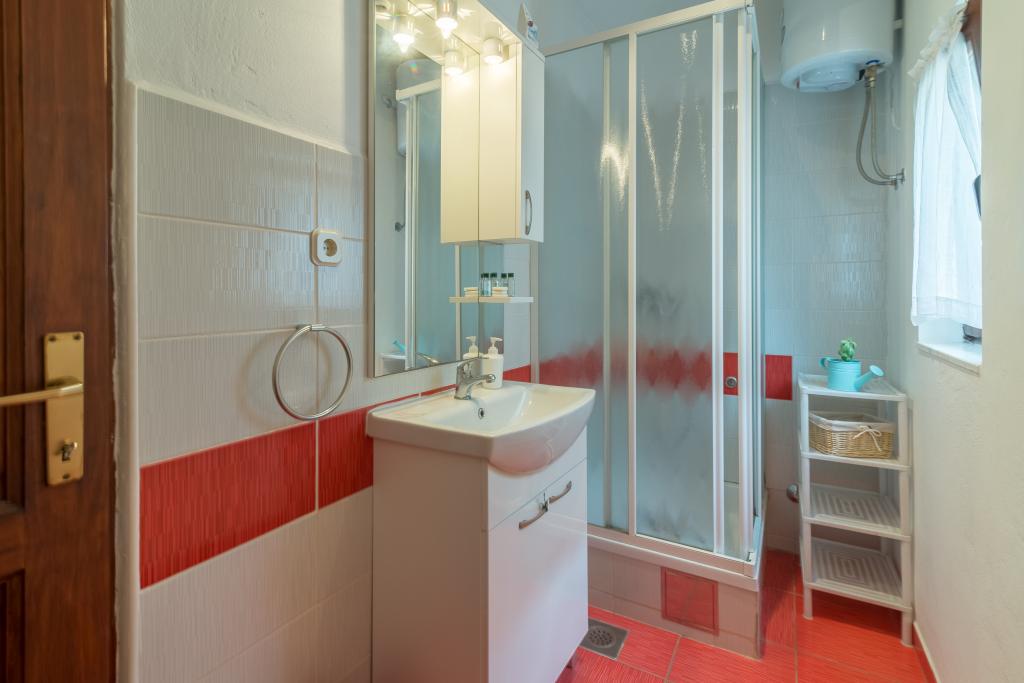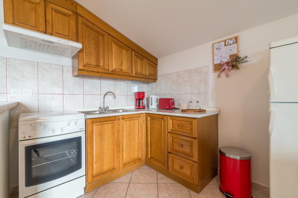 Družinska hiša z dvema apartmajema in pomožnega objekta z eno stanovanje. Apartma A2 smješšten se nahaja v prvem nadstropju in je sestavljen iz kuhinje, spalnico, kopalnico in teraso s pogledom na morje. Apartma A4 +1 se nahaja v zgornjem nadstropju, klimatizirano, dve spalnici z zakonsko posteljo, kopalnica, kuhinja in dnevna soba, terasa s pogledom na morje. A2 +1 se nahaja v pomožnem objektu v pritličju, klima, kuhinja, spalnica (zakonska postelja z dodatnim ležiščem), kopalnica, 50 m od morja.