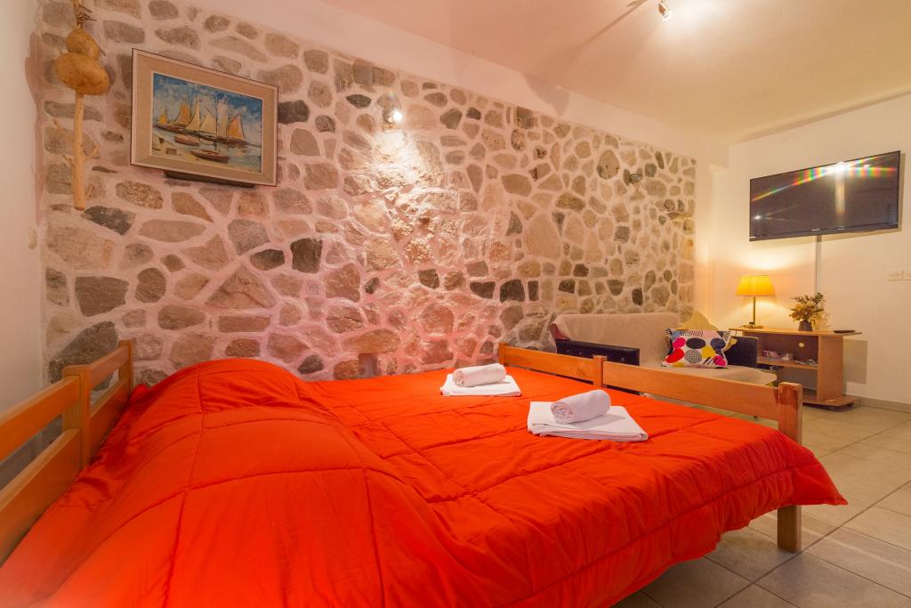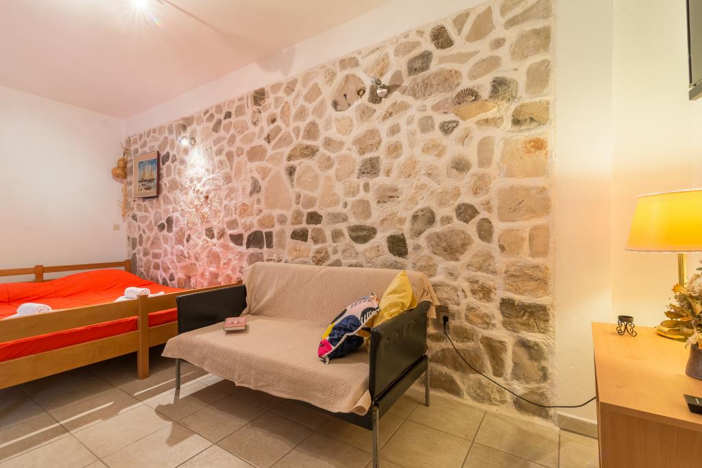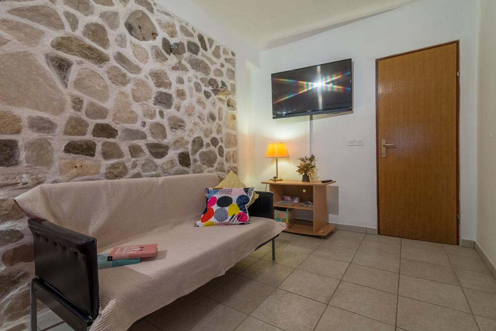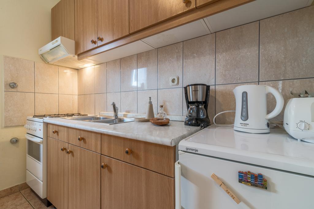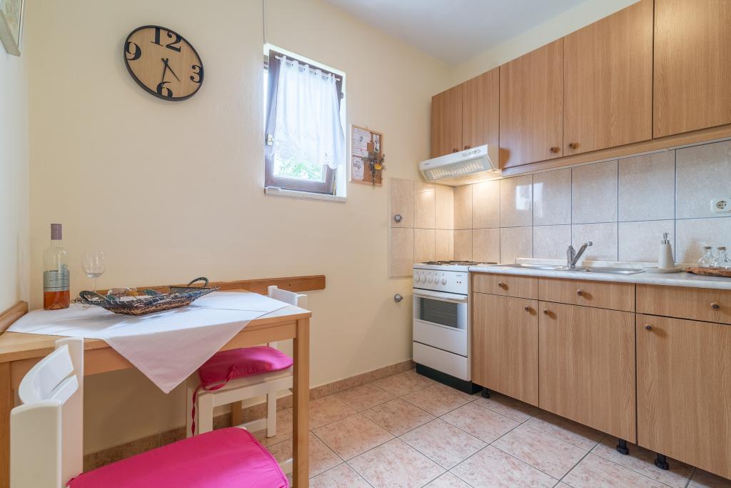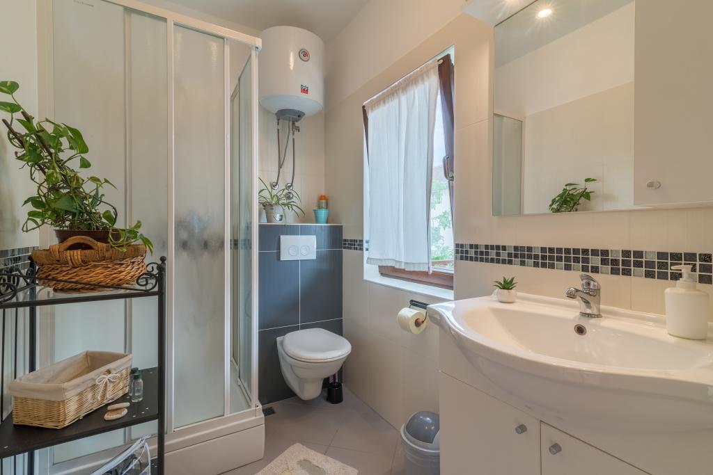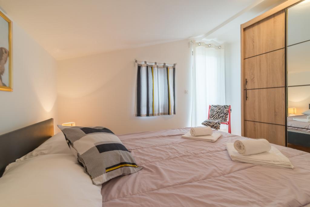 Družinska hiša z dvema apartmajema in pomožnega objekta z eno stanovanje. Apartma A2 smješšten se nahaja v prvem nadstropju in je sestavljen iz kuhinje, spalnico, kopalnico in teraso s pogledom na morje. Apartma A4 +1 se nahaja v zgornjem nadstropju, klimatizirano, dve spalnici z zakonsko posteljo, kopalnica, kuhinja in dnevna soba, terasa s pogledom na morje. A2 +1 se nahaja v pomožnem objektu v pritličju, klima, kuhinja, spalnica (zakonska postelja z dodatnim ležiščem), kopalnica, 50 m od morja.