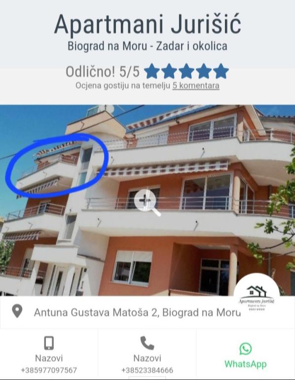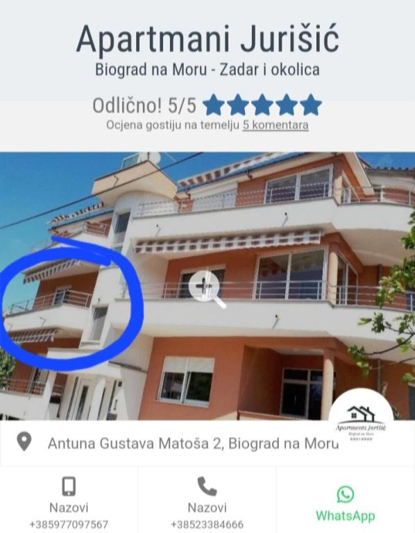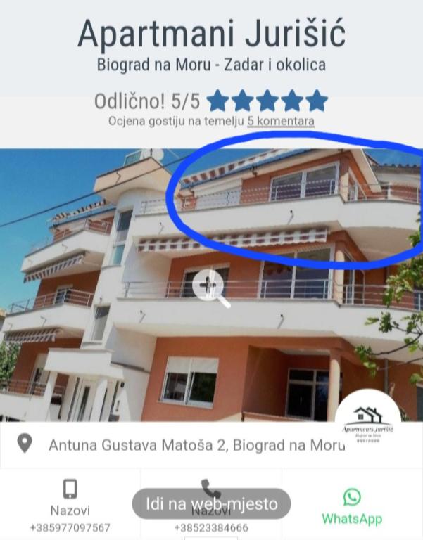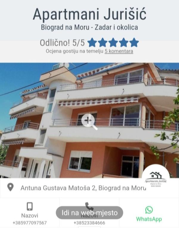 Smo družina Jurišić, ki ima dolgo tradicijo turizma, več kot 40 let. V mirnem delu centra mesta Biograd na Moru (v bližini hotela "Ilirija") se nahajata naši dve hiši, ki se nahajata le 50 metrov od morja, promenade, rive in drugih vsebin ... restavracij, trgovin, pošte ... Vsi apartmaji imajo klimatizirano namestitev (v vsaki sobi in dnevni sobi je klima), na oknih so mreže proti komarjem, vsak apartma pa ima svoj balkon, varovano parkirišče, Wi-Fi in žar za uporabo. Cene (po datumih) so navedene v ceniku posameznega apartmaja (pomožno ležišče - kavč za dodatni 2 osebi/otroka se doplača +10 eur/noč).