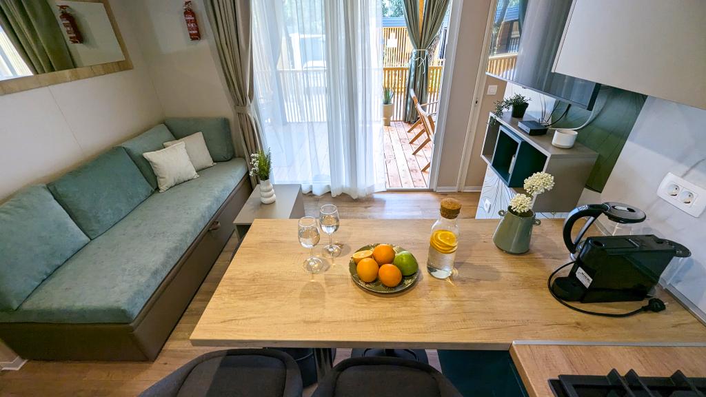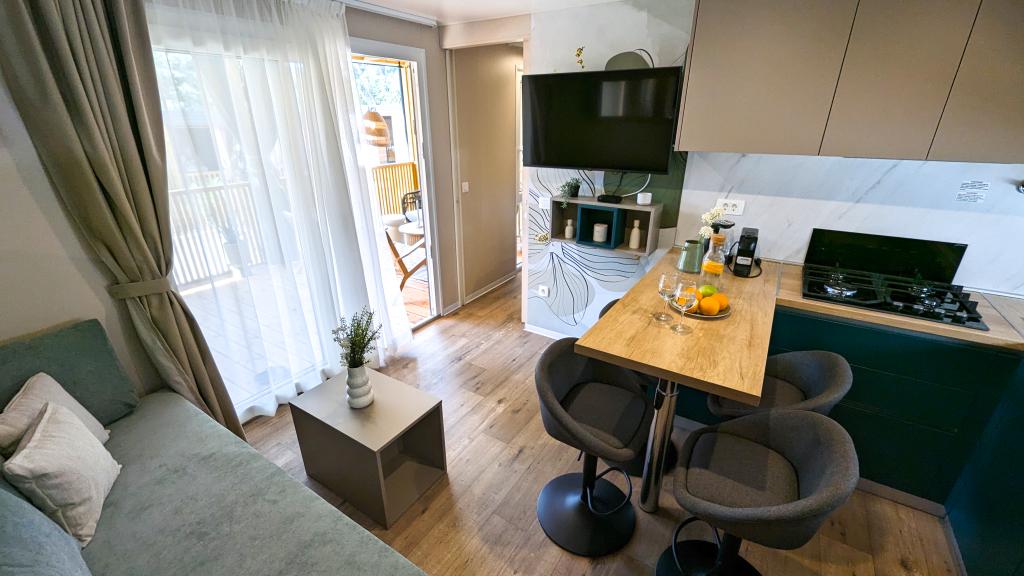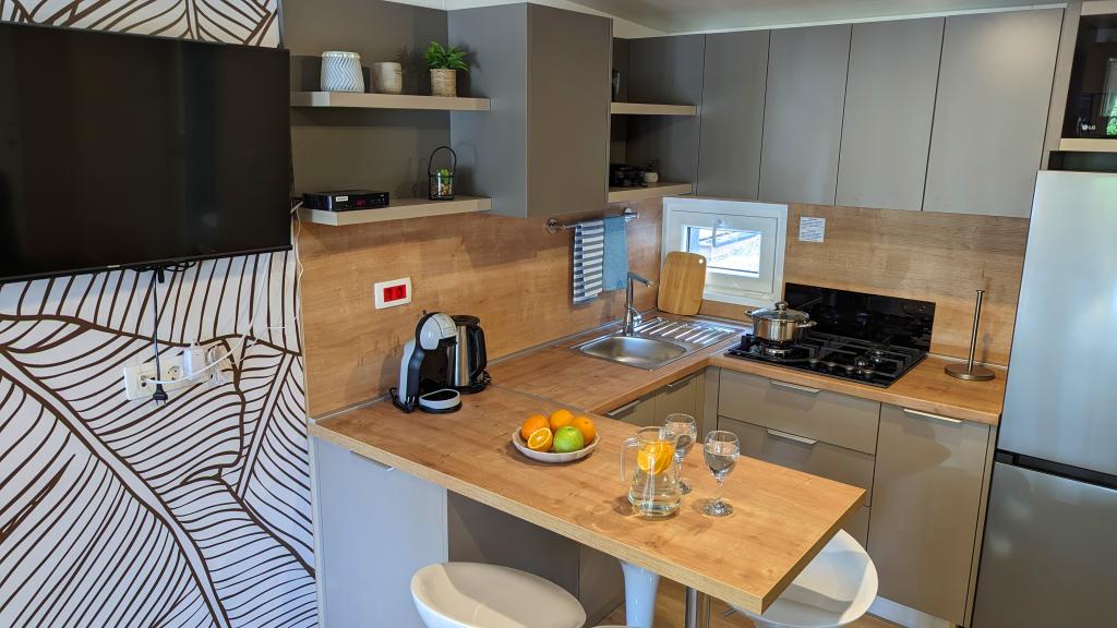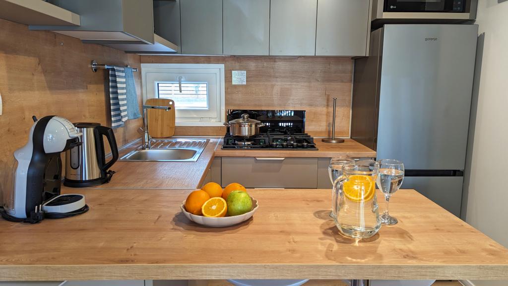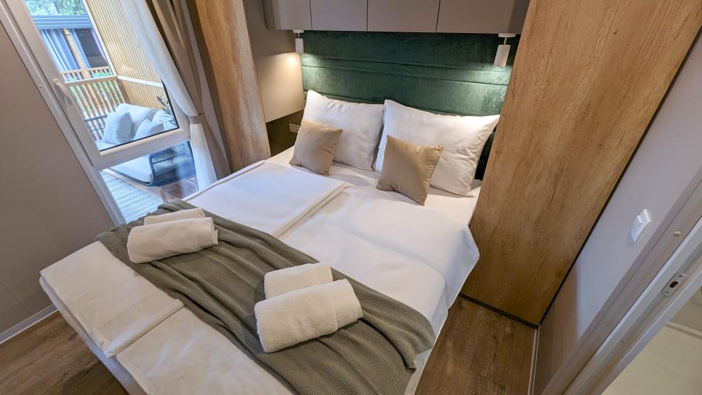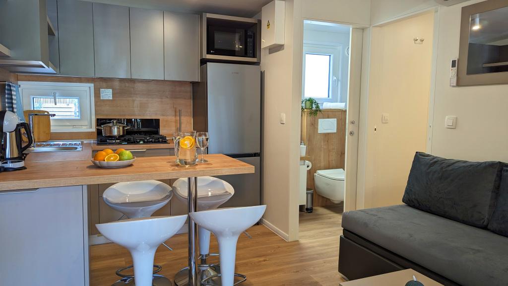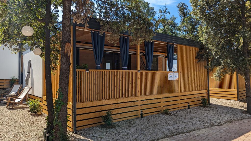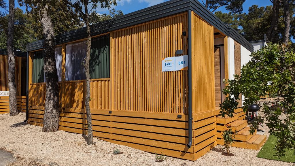 Uživajte v naravi in udobju: mobilne hišice Jaki v kampu Soline, Biograd na Moru. Naše moderno opremljene mobilne hišice, ki se nahajajo v mirnem delu kampa s 4 zvezdicami, obdane z borovim gozdom, so idealne za do 6 oseb. Uživajte v bližini plaže (2-5 minut hoje), trgovin in restavracij ter promenade, ki vodi do centra mesta (15 minut). Te hišice nudijo 2 spalnici in 2 kopalnici, dnevno sobo, veliko teraso z jedilno mizo in bivalnim prostorom ter popolnoma opremljeno kuhinjo - pomivalni stroj, mikrovalovna pečica, aparat za kavo, opekač kruha, mešalnik, zunanji žar. Hiša vključuje tudi brezplačen WiFi, brezplačno parkirišče tik ob hiši, Smart TV, klimatsko napravo, brisače in posteljnino. Kamp ponuja številne vsebine za vso družino: čudovite peščene in prodnate plaže, ki segajo vse do centra mesta, restavracijo z mediteranskimi specialitetami, otroško igrišče, športne aktivnosti in najem koles. Dalmaland, največji tematski vodni park na Hrvaškem, je oddaljen 15 min vožnje.