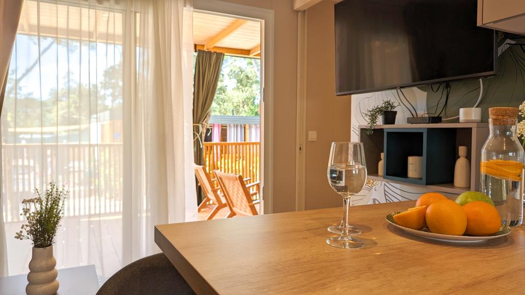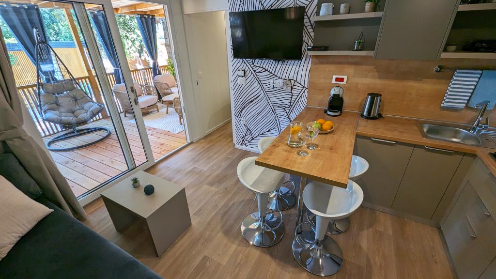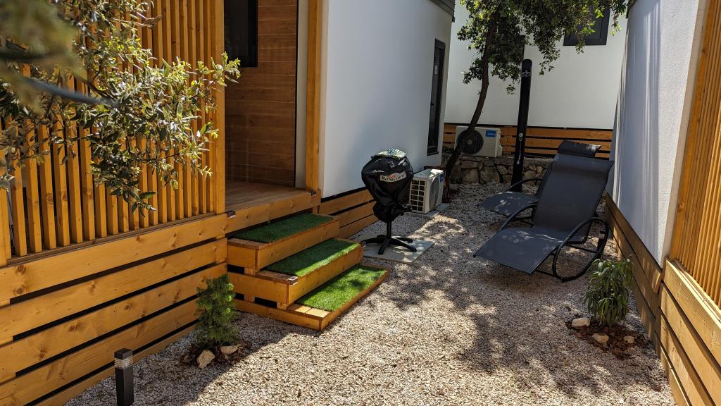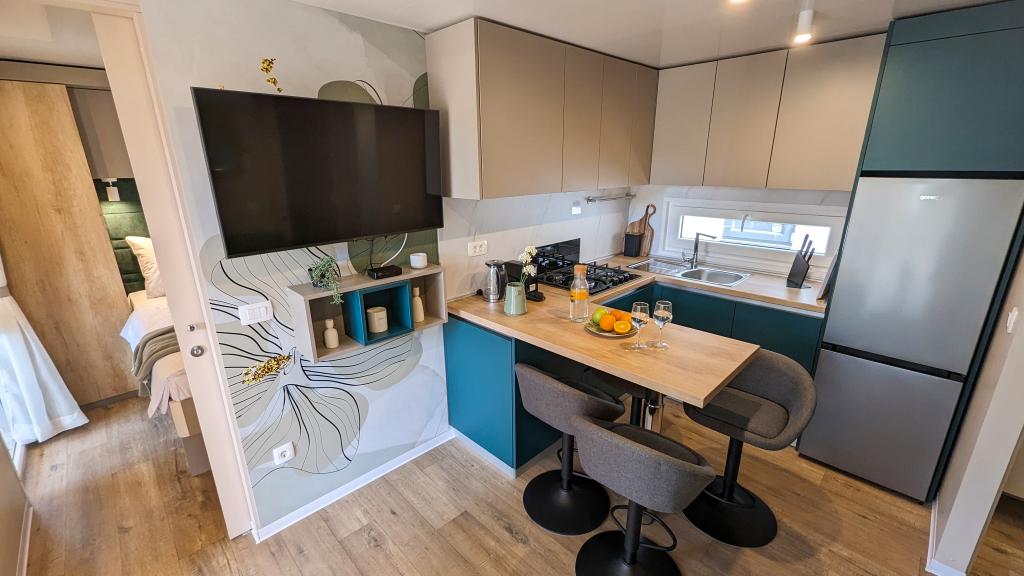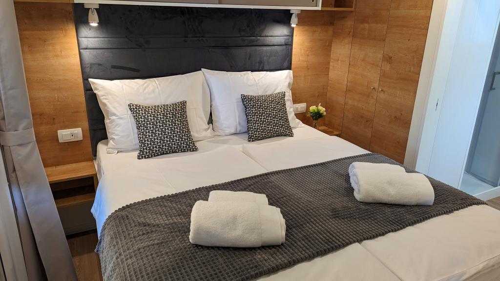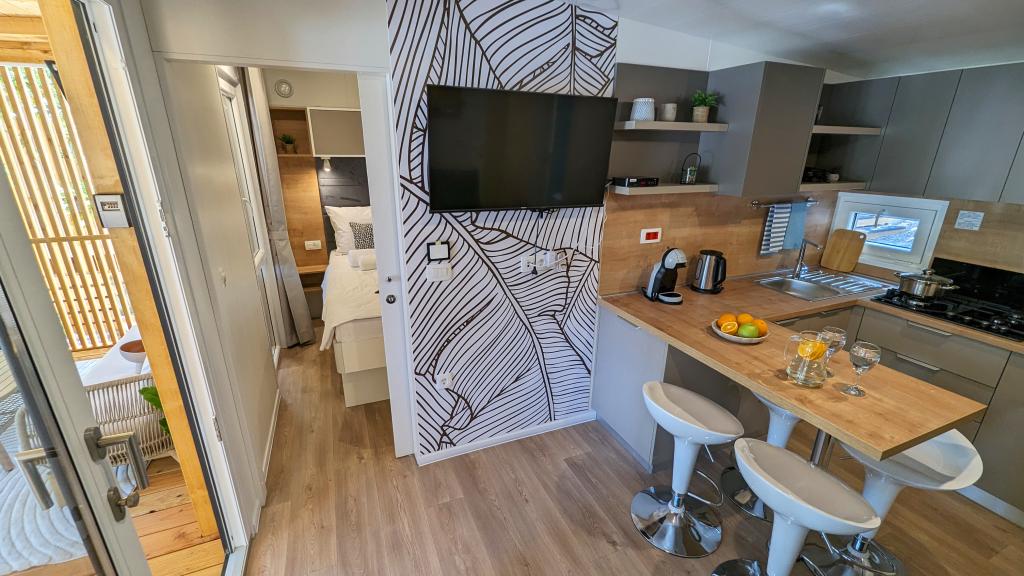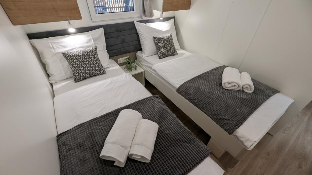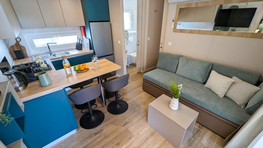 Uživajte v naravi in udobju: mobilne hišice Jaki v kampu Soline, Biograd na Moru. Naše moderno opremljene mobilne hišice, ki se nahajajo v mirnem delu kampa s 4 zvezdicami, obdane z borovim gozdom, so idealne za do 6 oseb. Uživajte v bližini plaže (2-5 minut hoje), trgovin in restavracij ter promenade, ki vodi do centra mesta (15 minut). Te hišice nudijo 2 spalnici in 2 kopalnici, dnevno sobo, veliko teraso z jedilno mizo in bivalnim prostorom ter popolnoma opremljeno kuhinjo - pomivalni stroj, mikrovalovna pečica, aparat za kavo, opekač kruha, mešalnik, zunanji žar. Hiša vključuje tudi brezplačen WiFi, brezplačno parkirišče tik ob hiši, Smart TV, klimatsko napravo, brisače in posteljnino. Kamp ponuja številne vsebine za vso družino: čudovite peščene in prodnate plaže, ki segajo vse do centra mesta, restavracijo z mediteranskimi specialitetami, otroško igrišče, športne aktivnosti in najem koles. Dalmaland, največji tematski vodni park na Hrvaškem, je oddaljen 15 min vožnje.