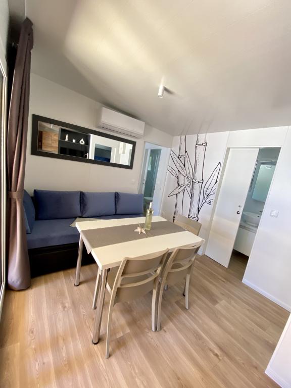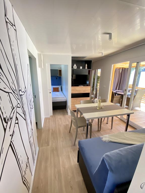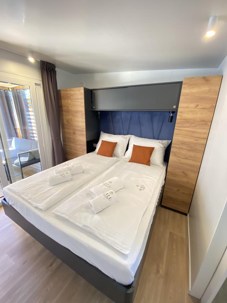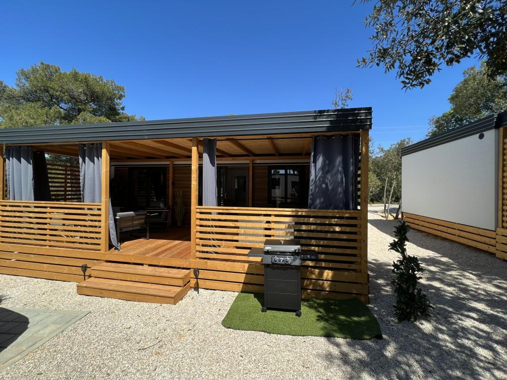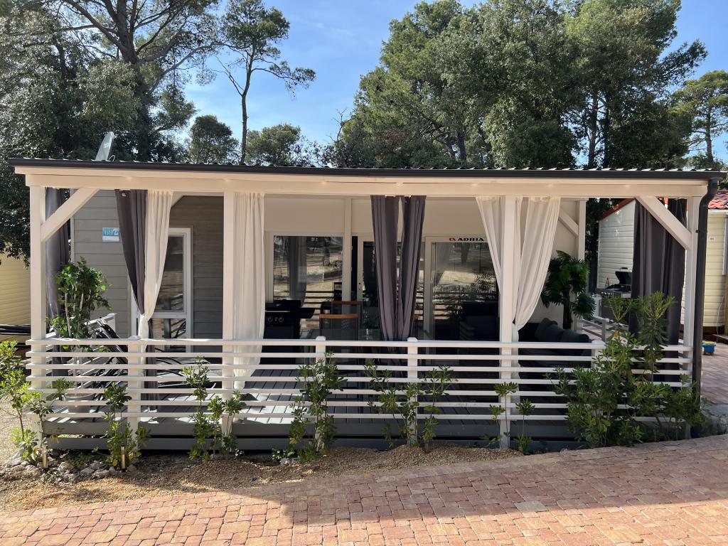 Vsebina mobilne hišice Mobilna hišica vsebuje: • 2 spalnici • Dnevna soba z dodatnim ležiščem za 2 osebi • Popolnoma opremljena kuhinja • Jedilnica • Kopalnica • Velika pokrita terasa približno 30 m² Oprema • Klimatska naprava • Brezplačen WiFi internet • Pametna TV s satelitskimi programi • Aparat za kavo • Električni grelnik vode • Opekač kruha • Mikrovalovna pečica • Popolna kuhinjska oprema • Žar • Sušilnik za lase • Posteljnina vključena • Brisače vključene Idealno za družine Mobilna hišica je še posebej primerna za družine z otroki. Na voljo so: • Otroška posteljica • Otroški stolček Prednosti namestitve Mobilna hišica Biograd na Moru – Kamp Park Soline Le 350 m od plaže Naravna senca borovcev Mirna lokacija Velika terasa Blizu morja Sprehajališče ob morju do centra Restavracije in trgovine v kampu Idealno za družine