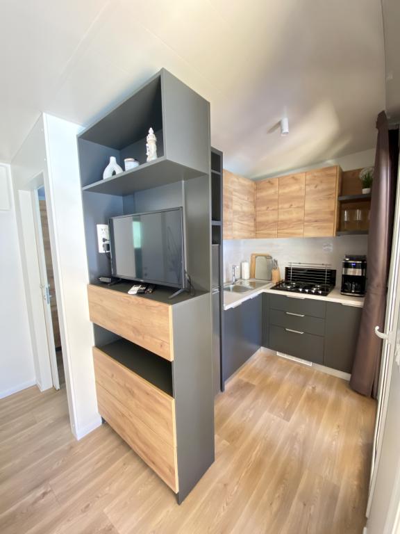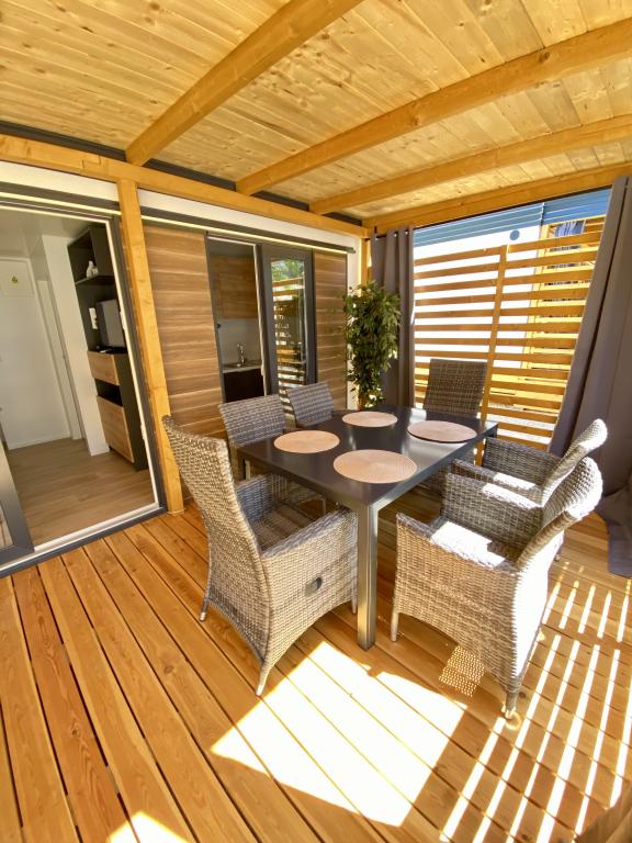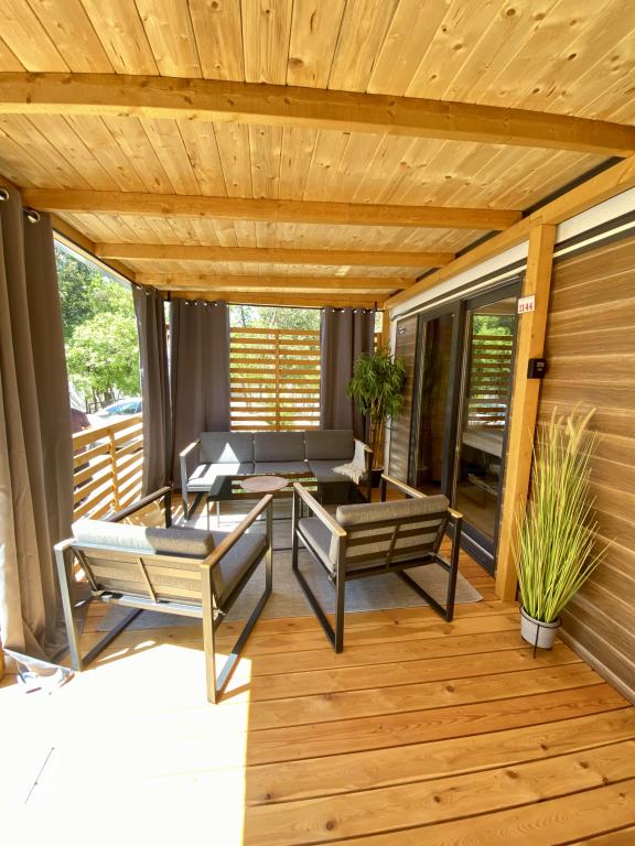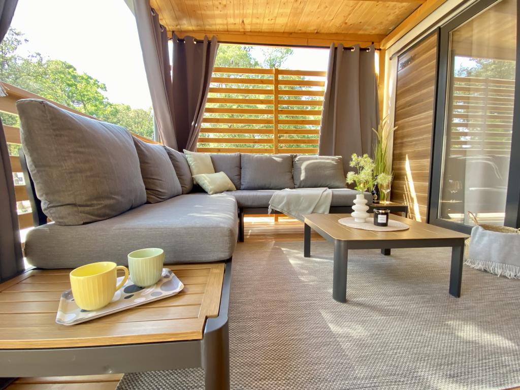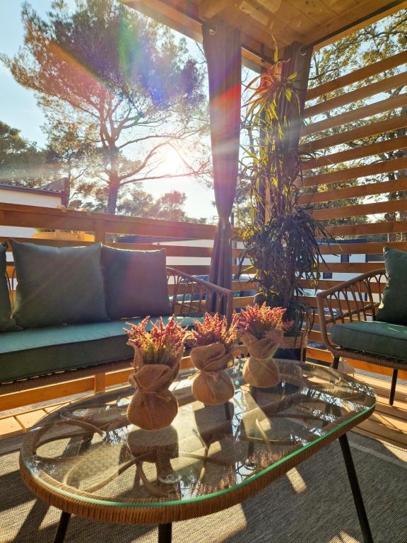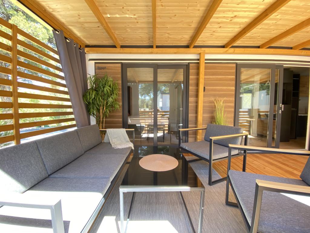 Vsebina mobilne hišice Mobilna hišica vsebuje: • 2 spalnici • Dnevna soba z dodatnim ležiščem za 2 osebi • Popolnoma opremljena kuhinja • Jedilnica • Kopalnica • Velika pokrita terasa približno 30 m² Oprema • Klimatska naprava • Brezplačen WiFi internet • Pametna TV s satelitskimi programi • Aparat za kavo • Električni grelnik vode • Opekač kruha • Mikrovalovna pečica • Popolna kuhinjska oprema • Žar • Sušilnik za lase • Posteljnina vključena • Brisače vključene Idealno za družine Mobilna hišica je še posebej primerna za družine z otroki. Na voljo so: • Otroška posteljica • Otroški stolček Prednosti namestitve Mobilna hišica Biograd na Moru – Kamp Park Soline Le 350 m od plaže Naravna senca borovcev Mirna lokacija Velika terasa Blizu morja Sprehajališče ob morju do centra Restavracije in trgovine v kampu Idealno za družine