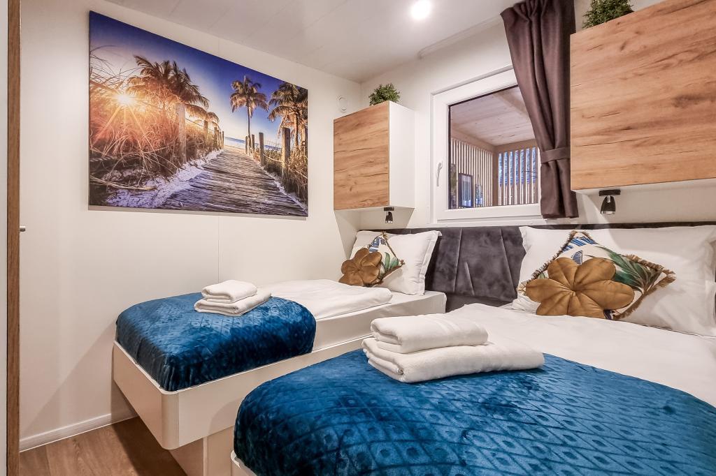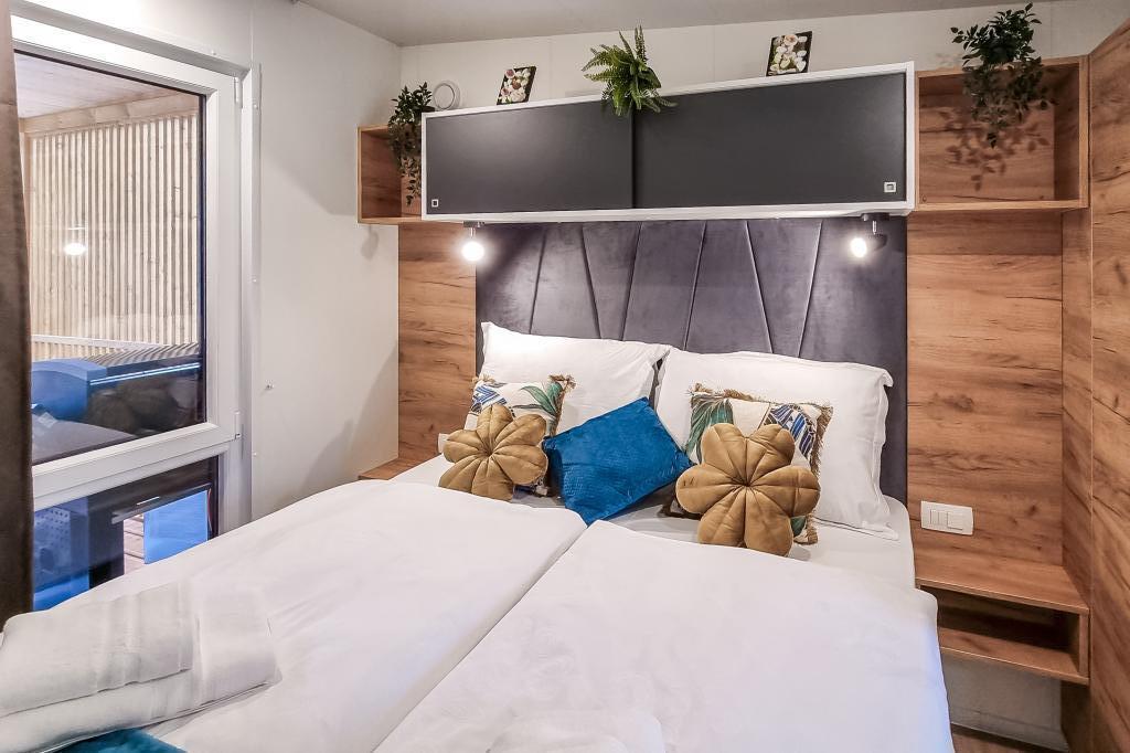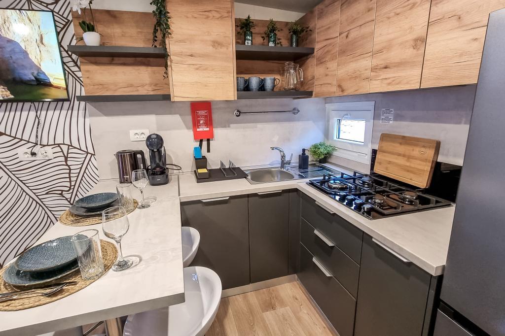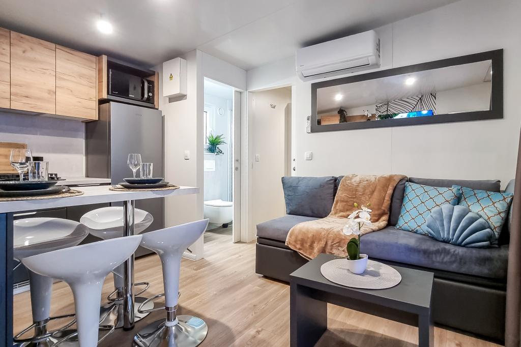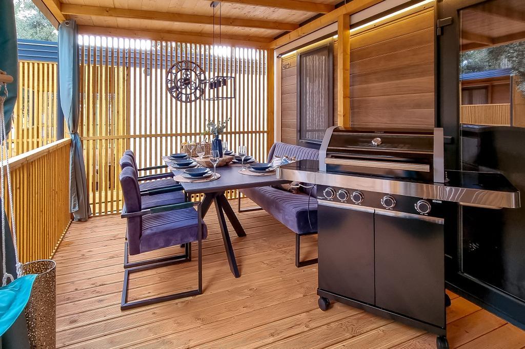 Naša moderno opremljena mobilna hišica ponuja udobno namestitev za do 6 oseb, z 2 prostornima spalnicama, dnevno sobo z raztegljivim kavčem in 2 kopalnicama. Uživajte na veliki pokriti terasi z jedilnico in zunanjo dnevno sobo, idealno za dolga večerna druženja. Tukaj lahko uživate v pikadu ali se sprostite pred velikim televizorjem, medtem ko pečete na našem velikem plinskem žaru in zunanjem štedilniku. Pokrito teraso obdajajo borovci in lahek morski vetrič. Na eni strani terase je prostorna jedilnica z udobnim kavčem in še bolj udobnimi naslanjači, na drugi strani pa naša zunanja dnevna soba ponuja udoben prostor za sedenje, kjer se lahko ne le sprostite, ampak tudi uživate v svojih najljubših televizijskih oddajah na ogromnem televizorju z razpoložljivimi satelitskimi televizijskimi kanali, Netflixom in HBO GO. Hiša se nahaja 3 minute od čudovite plaže.