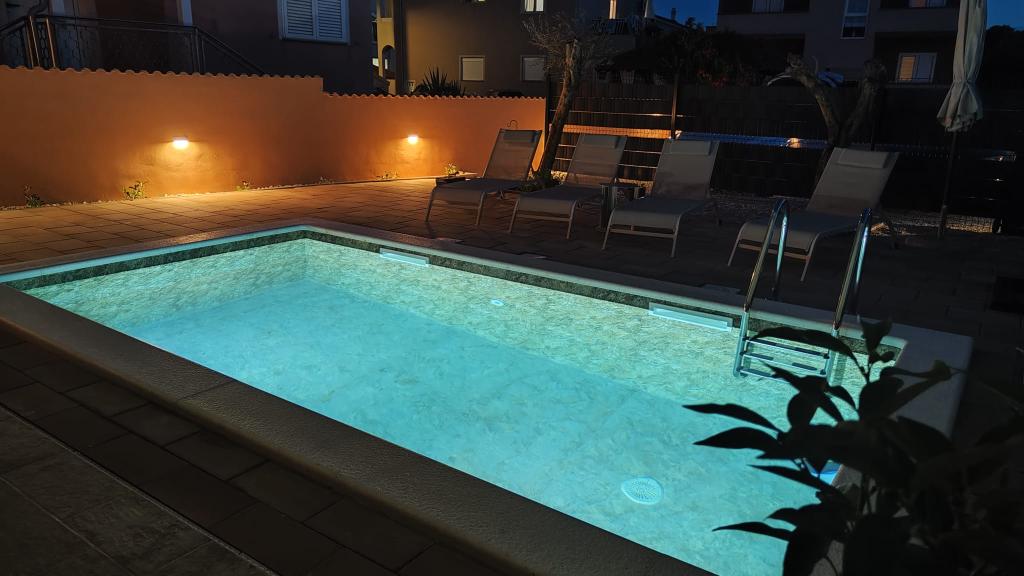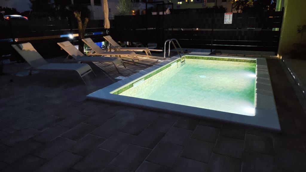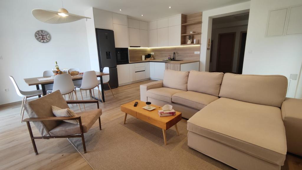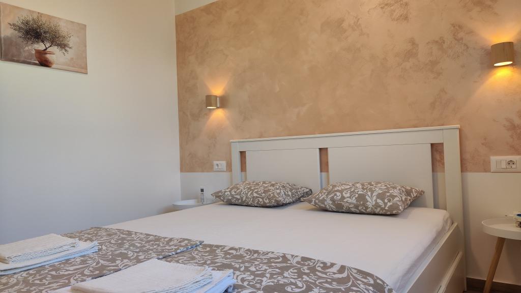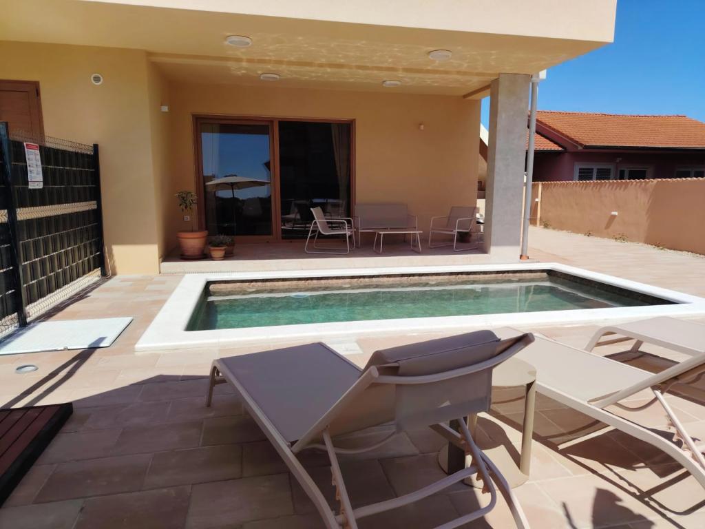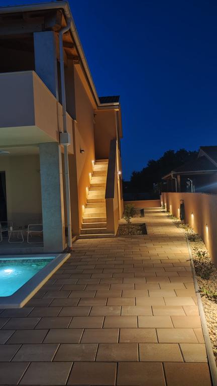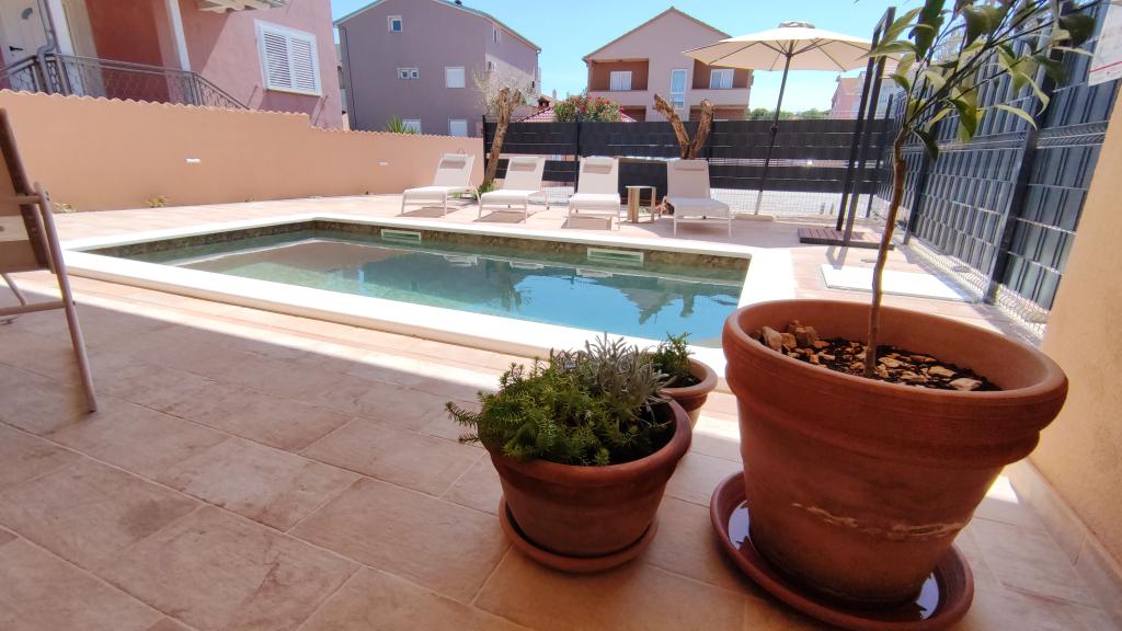 Novozgrajena dvonadstropna počitniška hiša z bazenom in dvema ločenima stanovanjskima enotama (pritličje in prvo nadstropje). Vsaka stanovanjska enota meri 90 kvadratnih metrov in je opremljena s 3 spalnicami, kuhinjo, kopalnico, teraso in dnevno sobo. Parkirišče je zagotovljeno.