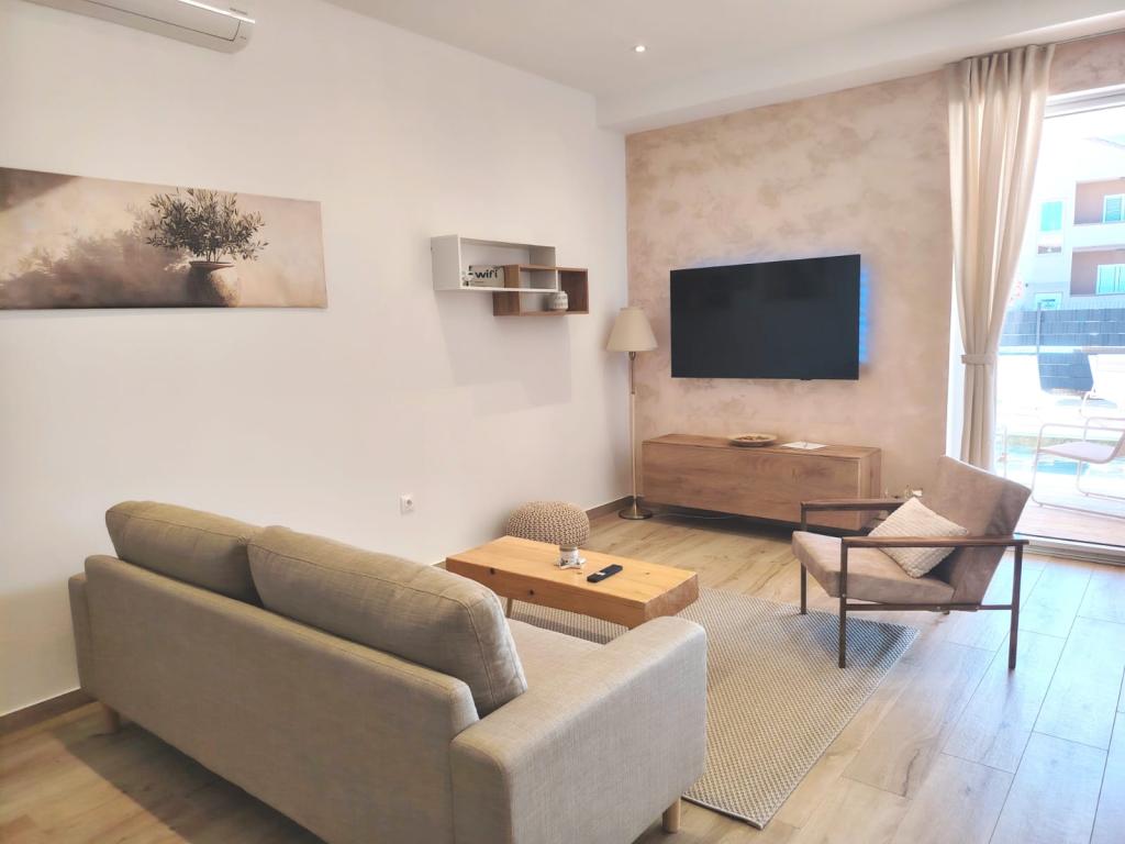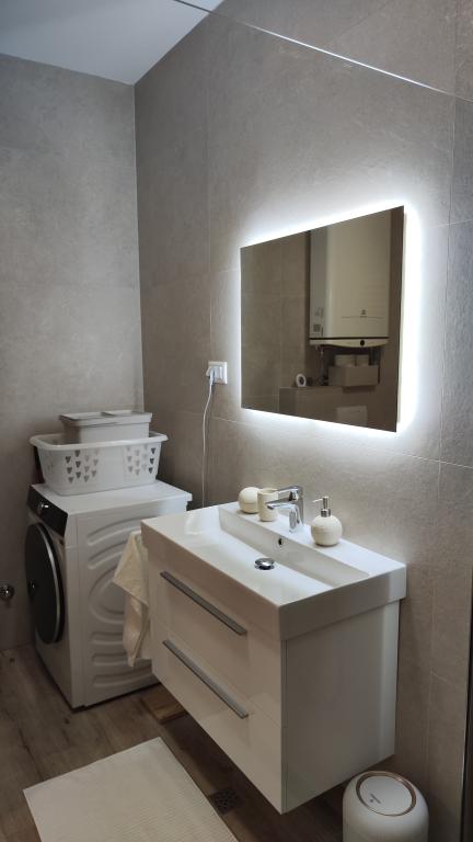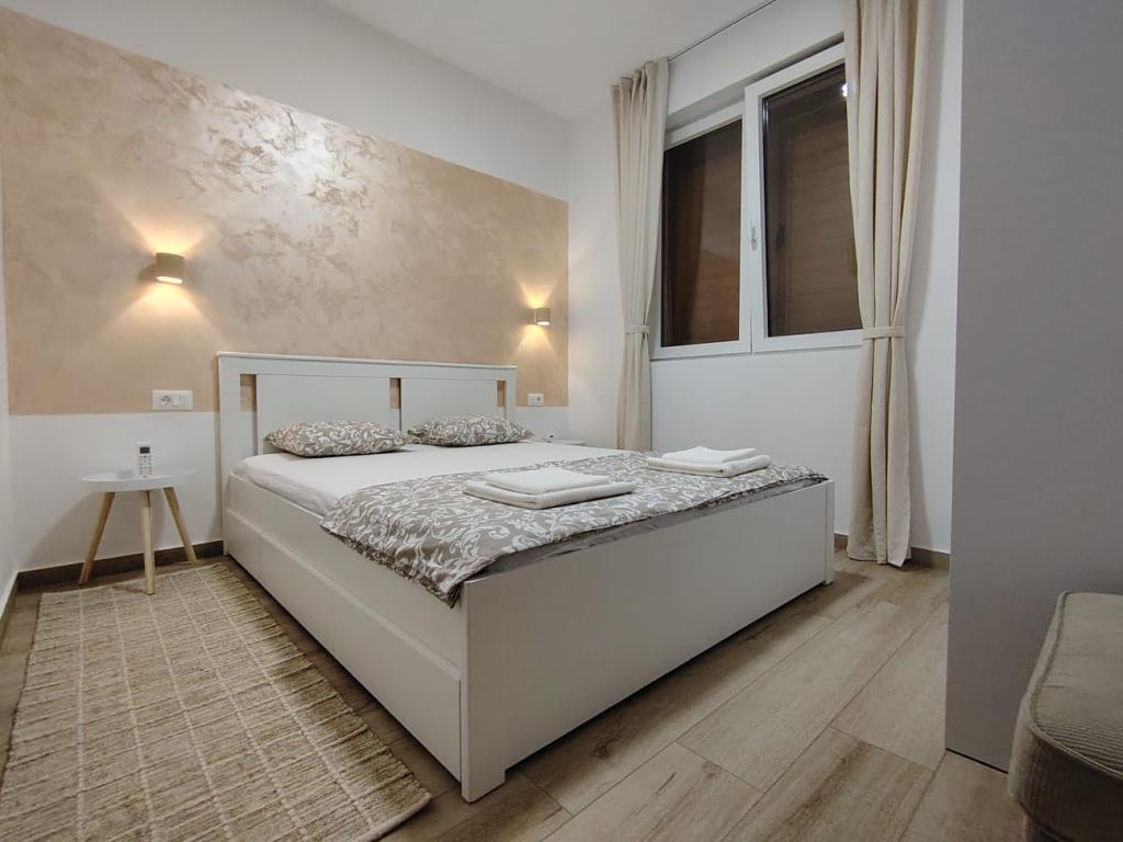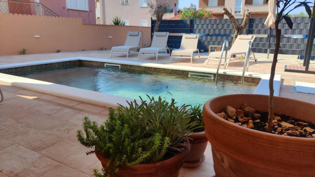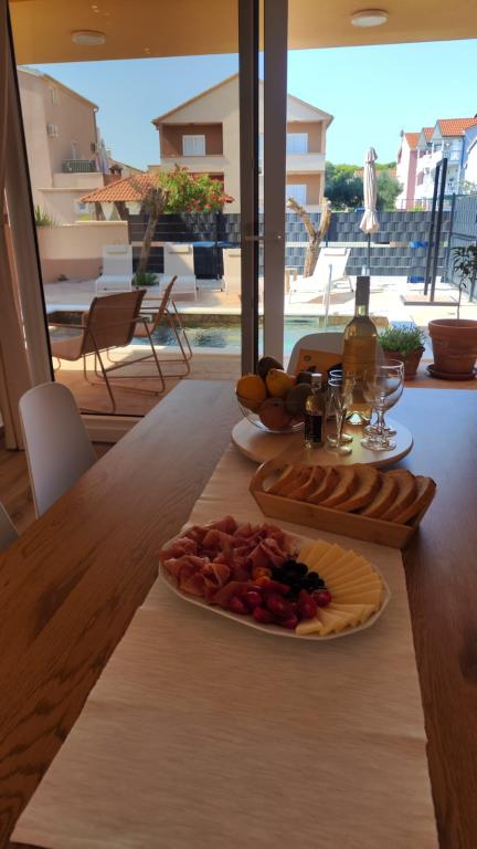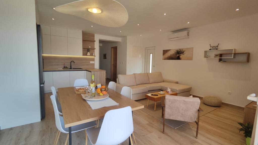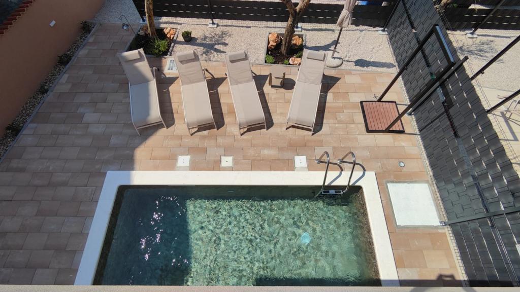 Novozgrajena dvonadstropna počitniška hiša z bazenom in dvema ločenima stanovanjskima enotama (pritličje in prvo nadstropje). Vsaka stanovanjska enota meri 90 kvadratnih metrov in je opremljena s 3 spalnicami, kuhinjo, kopalnico, teraso in dnevno sobo. Parkirišče je zagotovljeno.