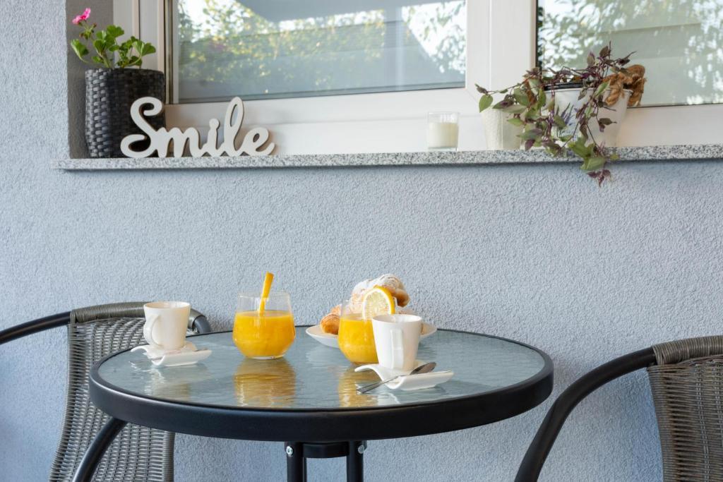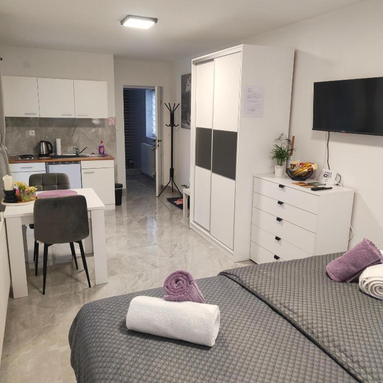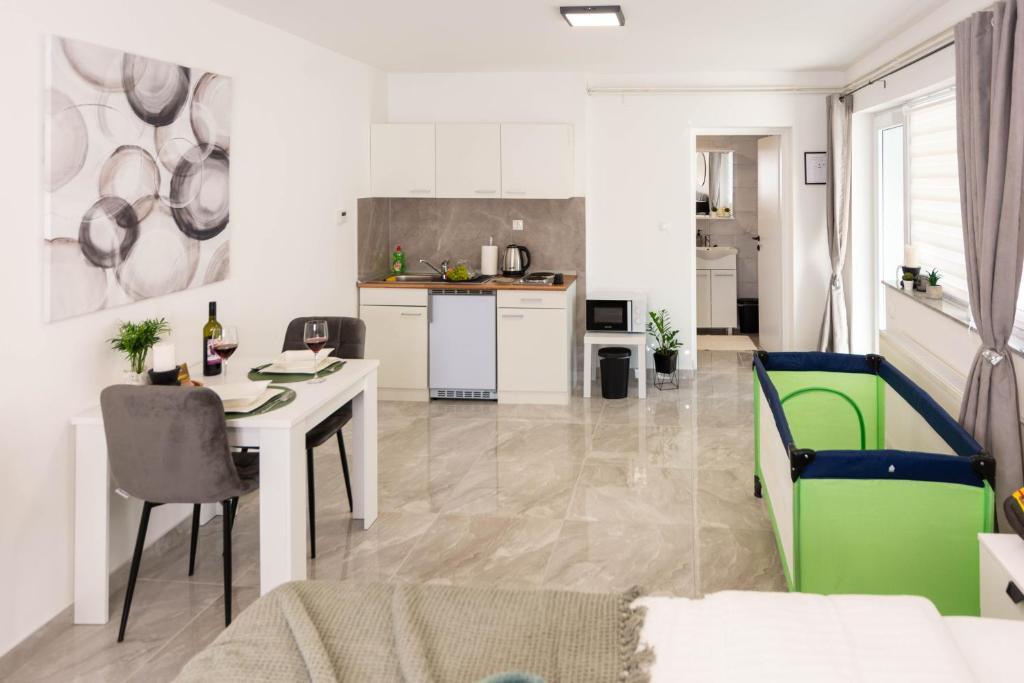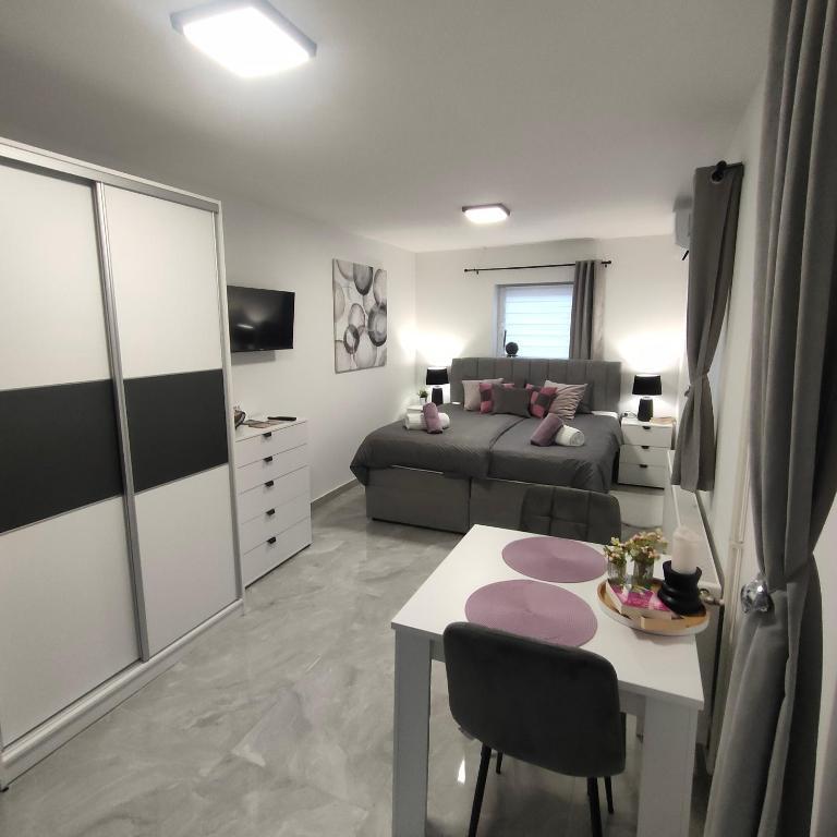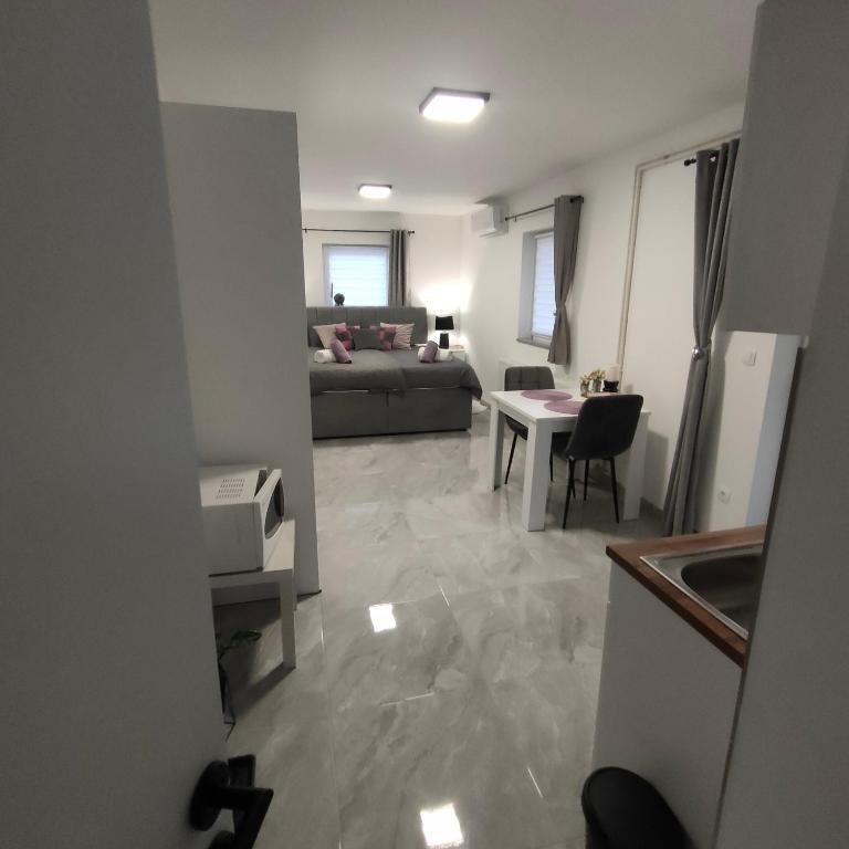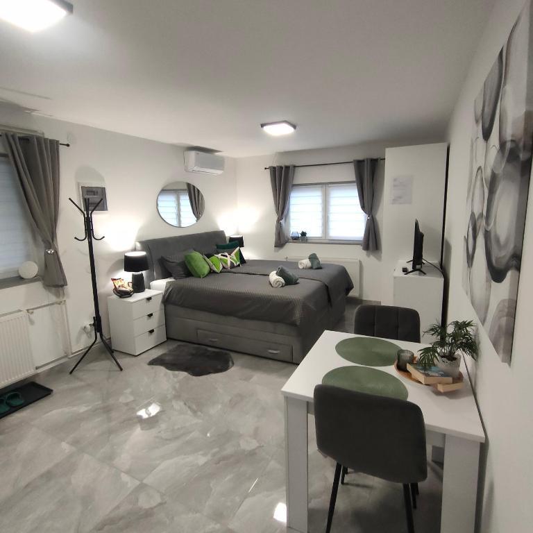 Hiša je sestavljena iz dveh studio apartmajev. Vsak Studio apartma vsebuje 1 spalnico s popolnoma opremljeno kuhinjo, 1 kopalnico, posteljnino, brisače, mila, geli za tuširanje, šampone, TV z ravnim zaslonom, skupno teraso za uživanje v kavi z velikim vrtom. Stanovanje se nahaja v mirni ulici cca 500 m od centra mesta in je umaknjeno v parcelo. Dvorišče in velik vrt ločita stanovanje od ceste, kar omogoča mirno bivanje v apartmaju in na terasi. Na dvorišču je parkirišče za osebne avtomobile.