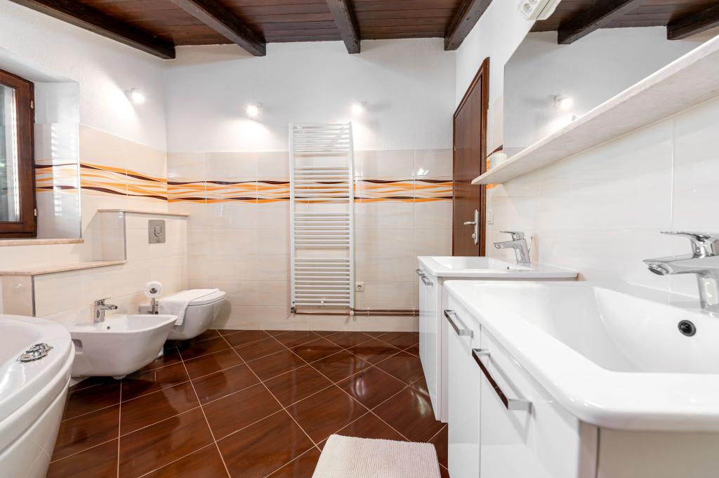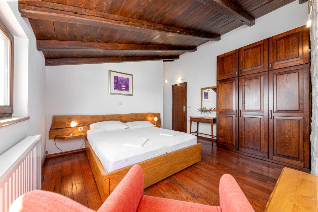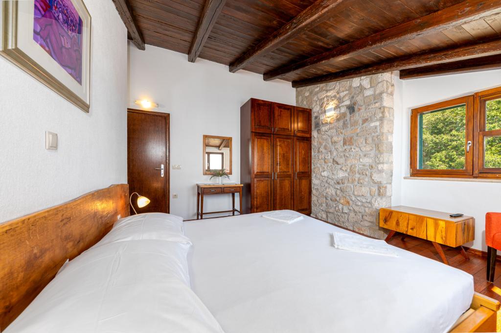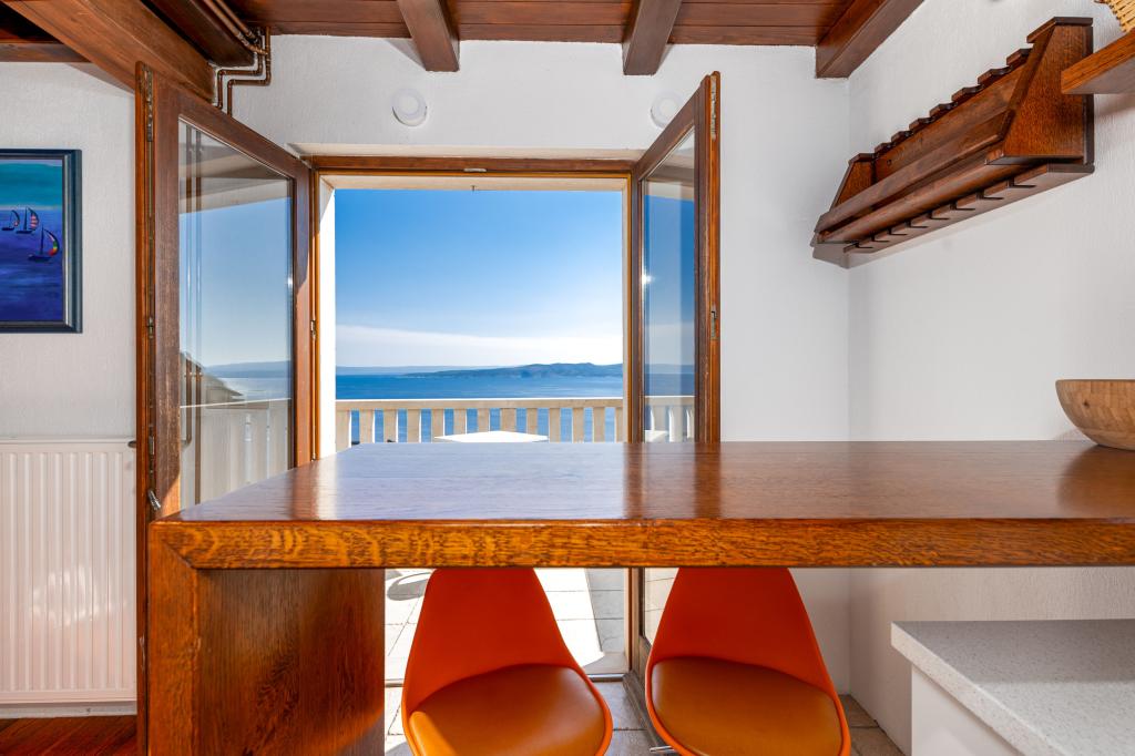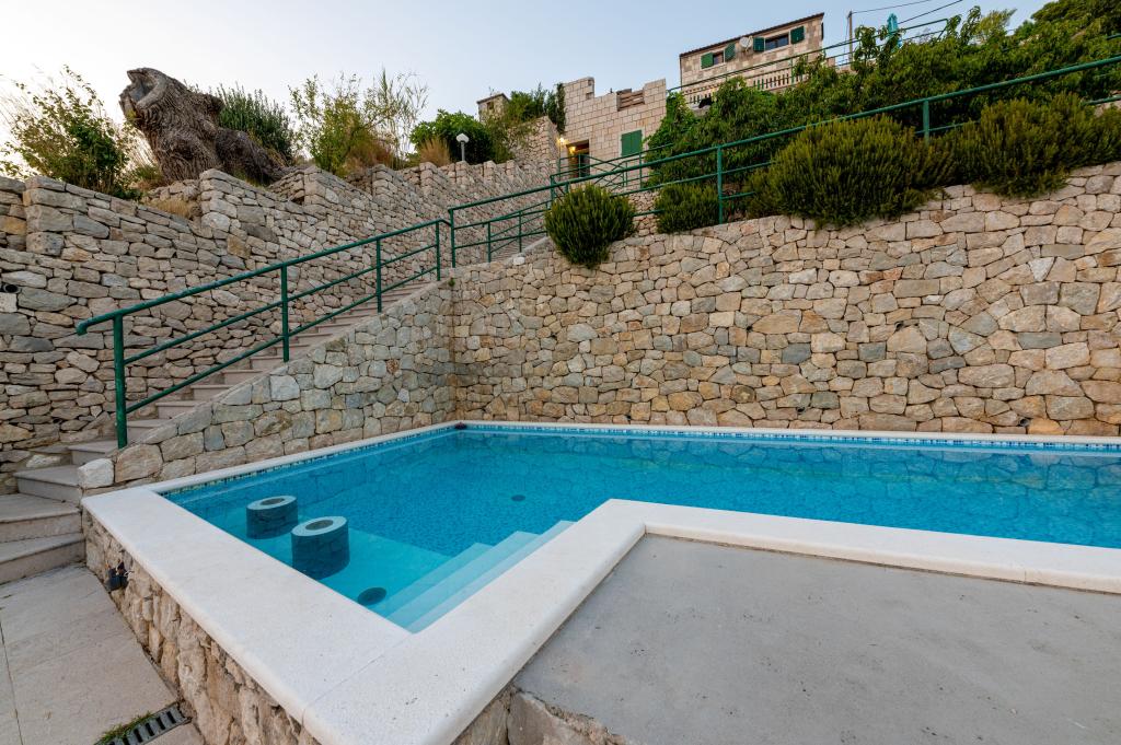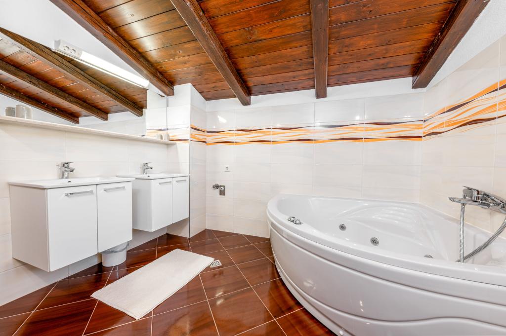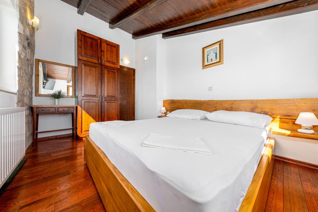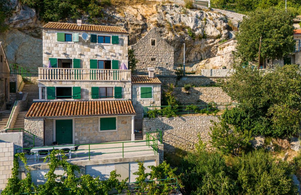 Dobrodošli v našem prostornem in očarljivem apartmaju, ki se nahaja v zasebni hiši s skupno tremi apartmaji - idealna izbira za miren in sproščujoč dopust v pristnem dalmatinskem ambientu. Apartma s 115 m² površine ponuja vse, kar potrebujete za prijetno bivanje. Sestavljen je iz dveh udobnih spalnic, popolnoma opremljene kuhinje, povezane s prostorno dnevno sobo, dveh kopalnic (ena od njih ima hidromasažno kad) in dodatnega ločenega stranišča. Rustikalna dekoracija in skrbno izbrani detajli ustvarjajo toplo vzdušje in pristno dalmatinsko vzdušje. Hiša se nahaja na kaskadnem terenu, stopnice pa vodijo do skupnega bazena. Bazen se nahaja na prostorni terasi, opremljeni z ležalniki in senčniki, idealni za sončenje in uživanje v razgledu. Zaradi stopnic in konfiguracije terena apartma ni primeren za osebe z invalidnostjo ali osebe z omejeno mobilnostjo. Zasebno parkirišče je na voljo tik ob hiši (kar je velika prednost v poletnih mesecih). Veselimo se vašega prihoda!