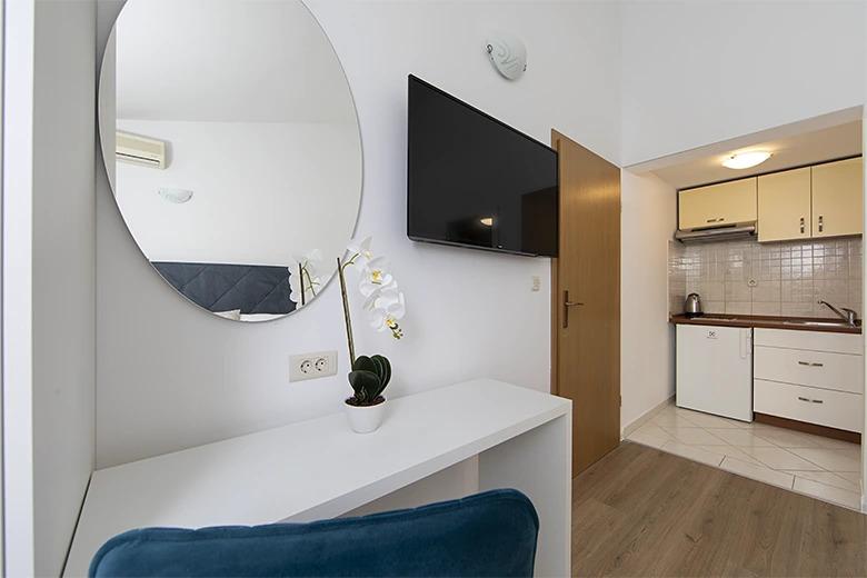 Studio je zelo čist, smeti pobirajo vsak dan, brisače zamenjajo po potrebi. Oprema je lepa, sodobna, vse deluje. Kuhinja je majhna, temu primerna je tudi oprema - le najnujnejše. Balkon je primeren za posedanje le zjutraj, saj se čez dan preveč segreje. Klima deluje odlično. Wi-fi povezava se ob večernih konicah rada prekine. Gostitelja sta zelo prijazna in ustrežljiva. Plaža je zelo lepa in nudi veliko sence; zlasti Punta Rata. Morje čisto, lepih barv.