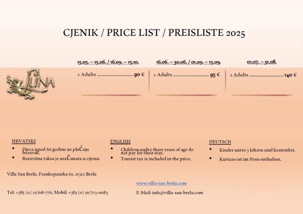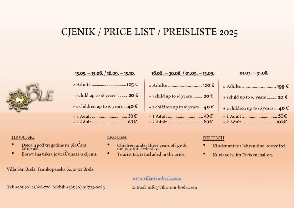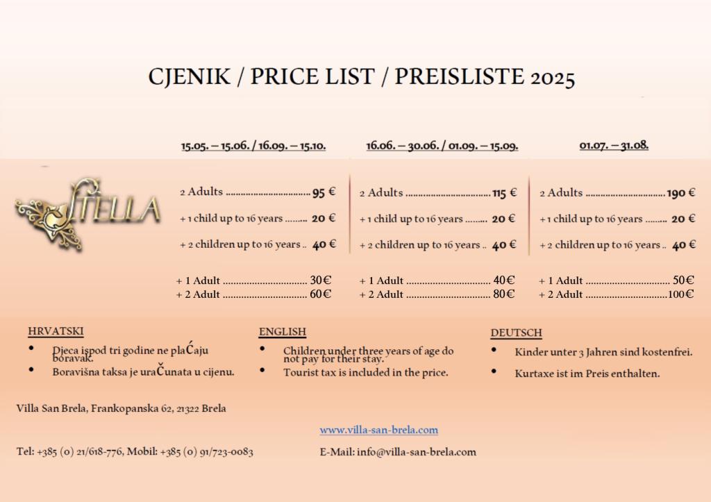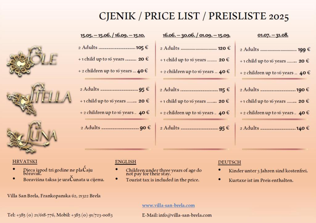 Villa SAN bile sanje Ned Ante, ki je postal realnost v lepi Brela in ki je danes delež s svojimi gosti. Na njegovo izvedbo so bili usposobljeni gastronomi delajo več kot 30 let v njegovi družinski restavraciji v Nemčiji. 1998 njihova prizadevanja je na koncu okronal z nakupom staro vilo v mirnem okolju, v neposredni bližini morja. Sedem let traja dela obnove vile zgrajene leta 1937, medtem ko vsi popolnoma ni ustrezala željam Nedu in Ante. Danes, prijatelji in gostje so na voljo od 15. 04., 15. 10. vsako leto tri lepo in udobno opremljen apartma imenovana Luna, Sole in Stella. Vsak apartma ima svoj čar in slog - pa naj bo to na kaminom, lepo teraso in čudovitim razgledom na morje. Idilična vrt s palmami in različnih rastlin in cvetja vabi na počitek. Pri tej oazi lastniki v letu 2008 od občine prejel nagrado najboljši vrt v Breli, na katere so še posebej ponosni.