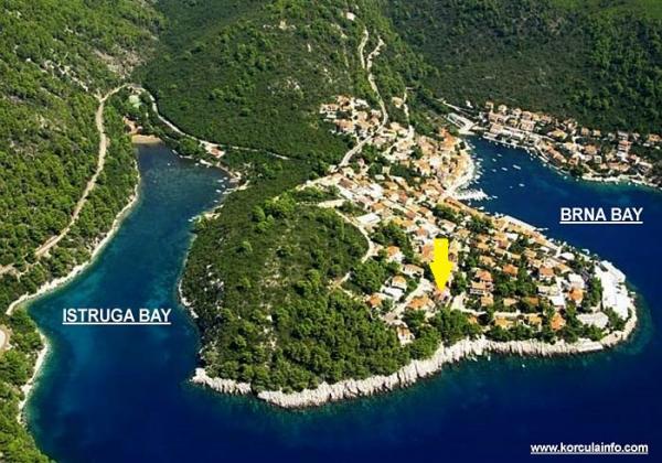 Apartmaji se nahajajo v mirnem zalivu Brna na južni strani otoka. Nudimo vam tri apartmaje in studio. Studio je primeren za 2 osebi, ki se nahaja v pritličju, soba in wc, kuhinjo in teraso. Apartma 3 +1 in 2 +2 osebe, ki so primerni za družine z otroki, medtem ko Suite 4, ki ima dve spalnici in je primeren za družine in pare. Apartmaji se nahajajo v bližini morja in od centra mesta, kar omogoča gostom, da uživajo v miru in tišini. Center Brna od apartmaja je 150-200 metrov, so trgovine, restavracije, pošta, kavarne in turistično pisarno. Blizu Brna je peščena plaža Istruga znan po svoji zdravilnim blatom, ki se naravno pojavlja in ga uporabljam za zdravljenje revmatskih obolenj. Istruga ponuja športnih objektov, zato je primerna za otroke.