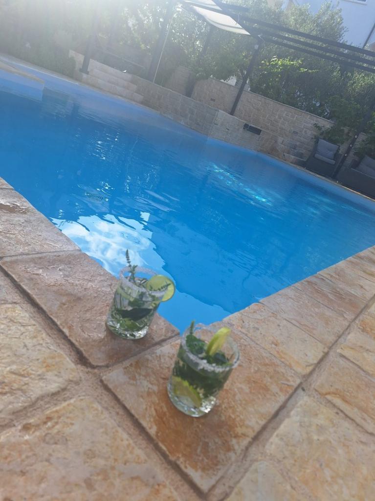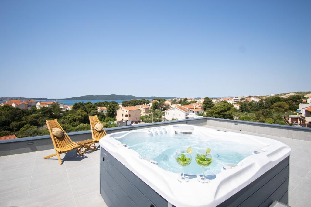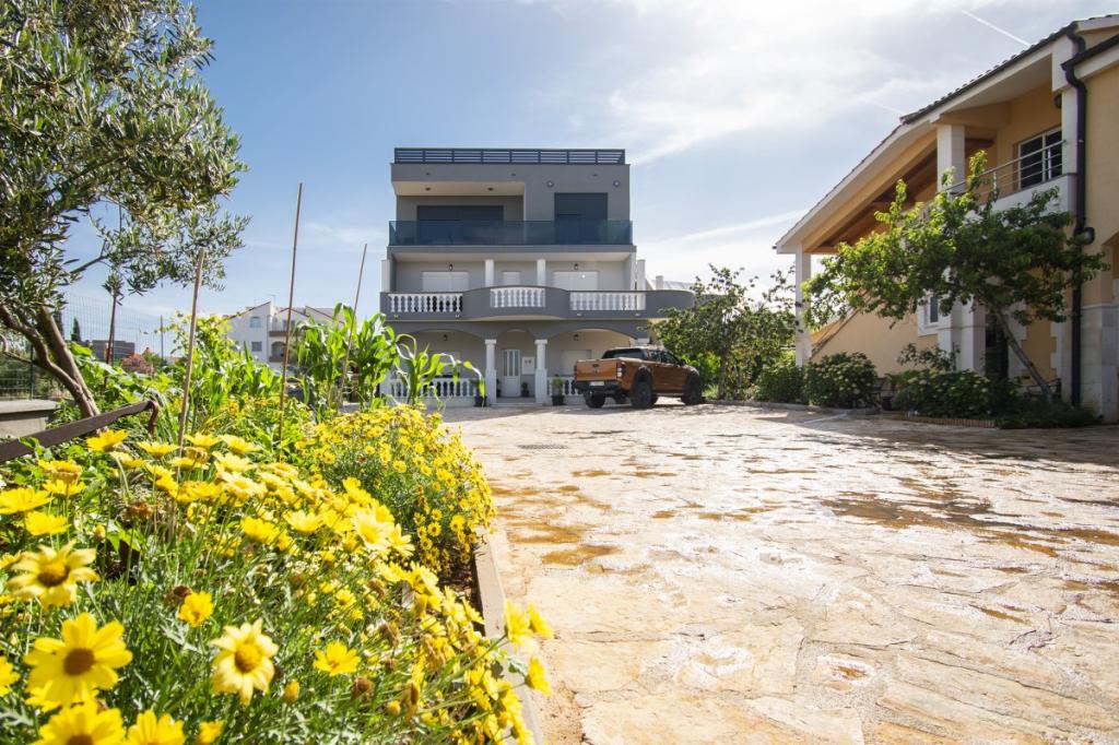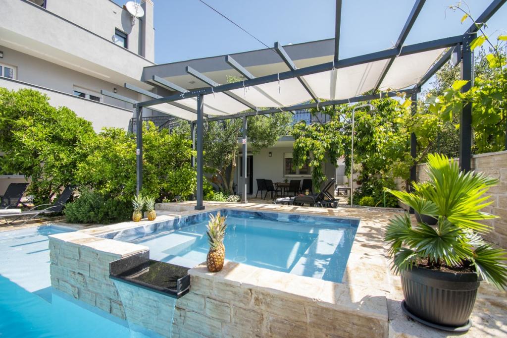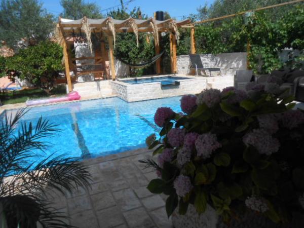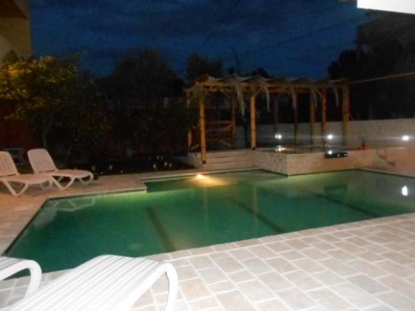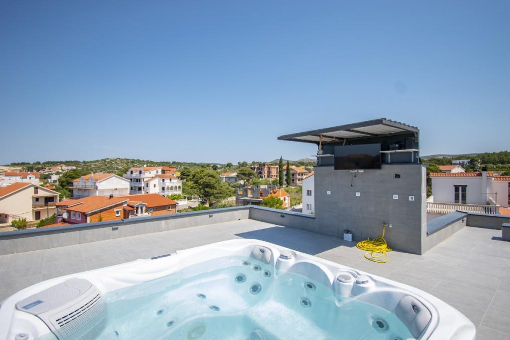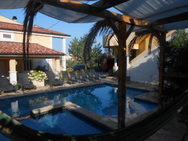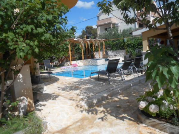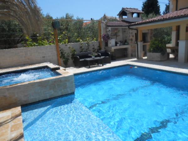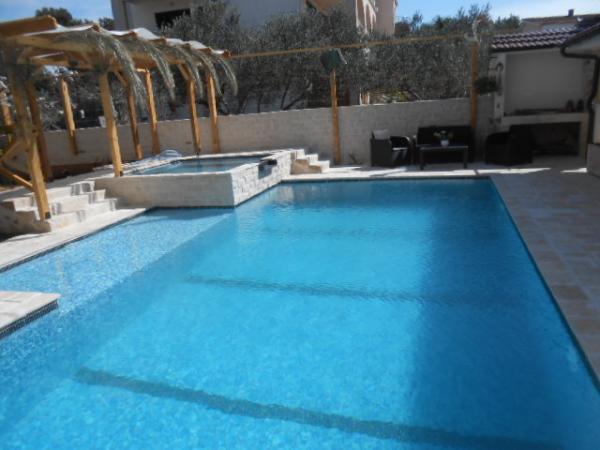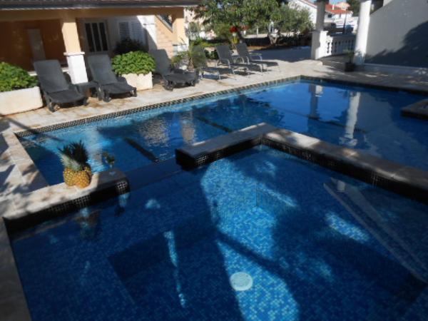 Hiša za 10 oseb z bazenom in jacuzzijem se nahaja v mirnem predelu Brodarice, obdana z veliko zelenja in cvetja. Prva dva apartmaja sta v pritličju, eno ima 45 m2, drugo pa 50 m2. Vsak apartma ima dvoposteljno sobo, kuhinjo, raztegljiv kavč, kopalnico in teraso z mizo in stoli. Tretji apartma meri 90 m2 in se nahaja v prvem nadstropju, ima dve veliki dvoposteljni sobi, veliko dnevno sobo, kuhinjo, kopalnico in 45 m2 veliko teraso z mizo in stoli. Primeren je za malo večjo družino in prijatelje. Apartma je klimatiziran. Četrti apartma je luksuzno urejen, cca 100m2, ima veliko dnevno sobo, popolnoma opremljeno kuhinjo, veliko sobo s televizijo in klimo, apartma ima tudi savno. na strehi je jacuzzi z veliko teraso. vsak apartma ima klimo in vsaka soba ima tudi televizijo. Bazen je skupen. Hiša je od morja oddaljena 5-6 minut hoje. Poleg hiše se nahajata še dva apartmaja, eden je 110m2 luksuzno opremljen, drugi pa 55m2.