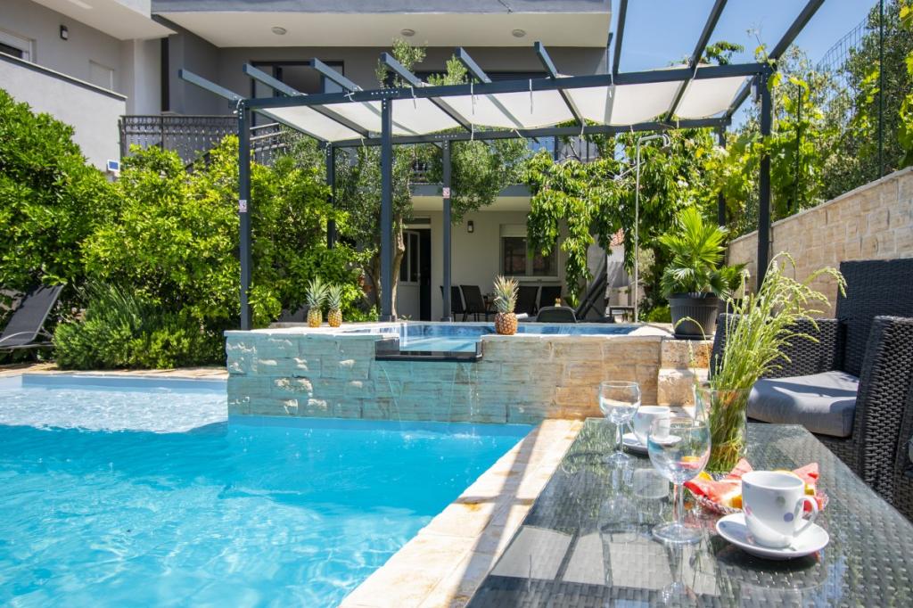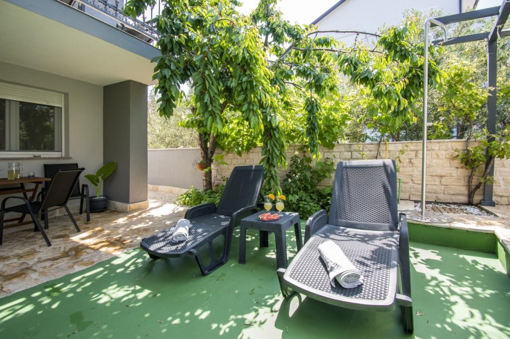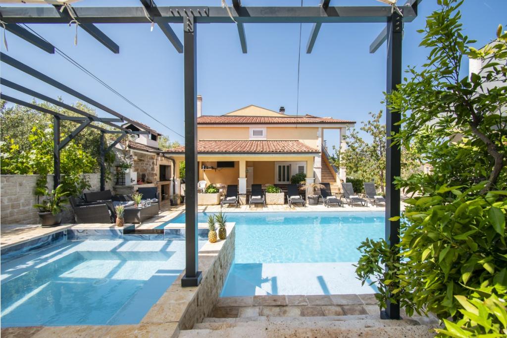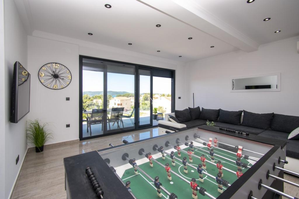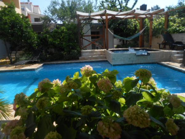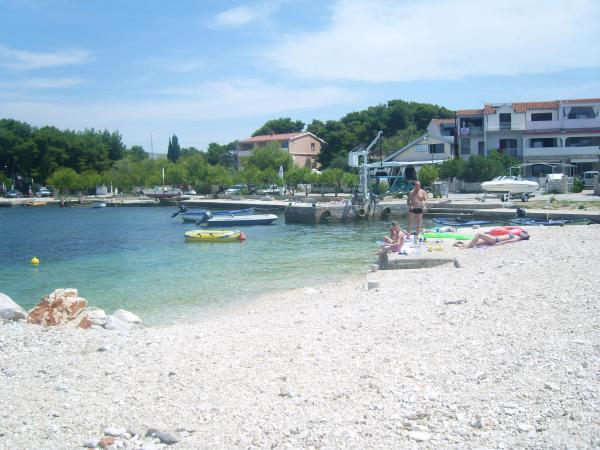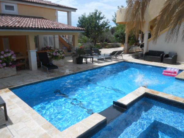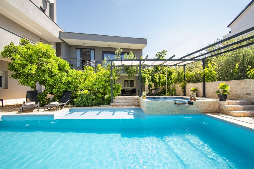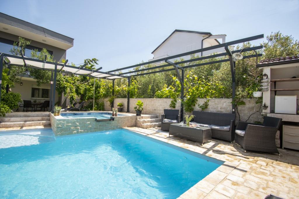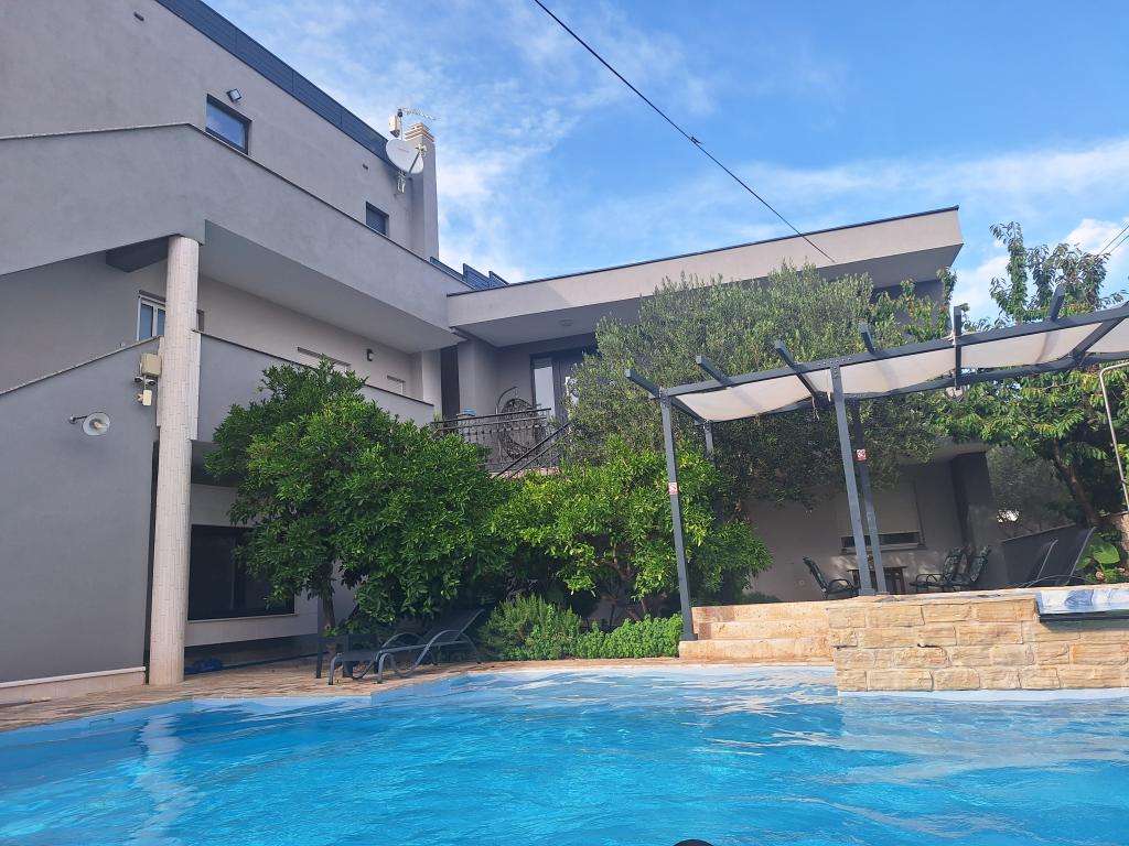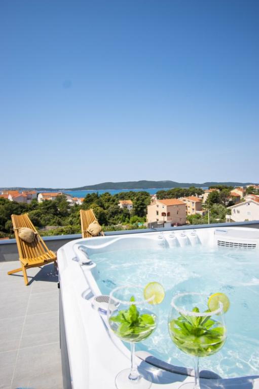 Hiša za 10 oseb z bazenom in jacuzzijem se nahaja v mirnem predelu Brodarice, obdana z veliko zelenja in cvetja. Prva dva apartmaja sta v pritličju, eno ima 45 m2, drugo pa 50 m2. Vsak apartma ima dvoposteljno sobo, kuhinjo, raztegljiv kavč, kopalnico in teraso z mizo in stoli. Tretji apartma meri 90 m2 in se nahaja v prvem nadstropju, ima dve veliki dvoposteljni sobi, veliko dnevno sobo, kuhinjo, kopalnico in 45 m2 veliko teraso z mizo in stoli. Primeren je za malo večjo družino in prijatelje. Apartma je klimatiziran. Četrti apartma je luksuzno urejen, cca 100m2, ima veliko dnevno sobo, popolnoma opremljeno kuhinjo, veliko sobo s televizijo in klimo, apartma ima tudi savno. na strehi je jacuzzi z veliko teraso. vsak apartma ima klimo in vsaka soba ima tudi televizijo. Bazen je skupen. Hiša je od morja oddaljena 5-6 minut hoje. Poleg hiše se nahajata še dva apartmaja, eden je 110m2 luksuzno opremljen, drugi pa 55m2.