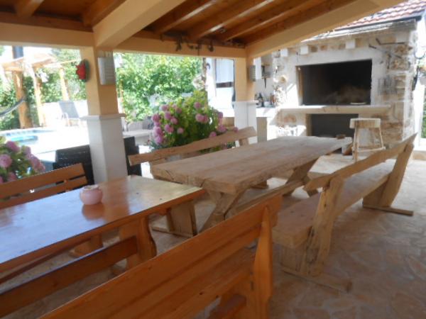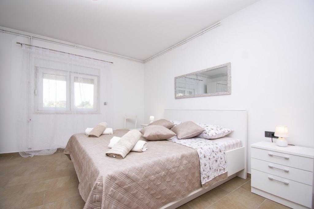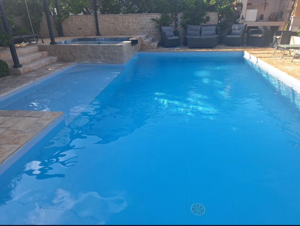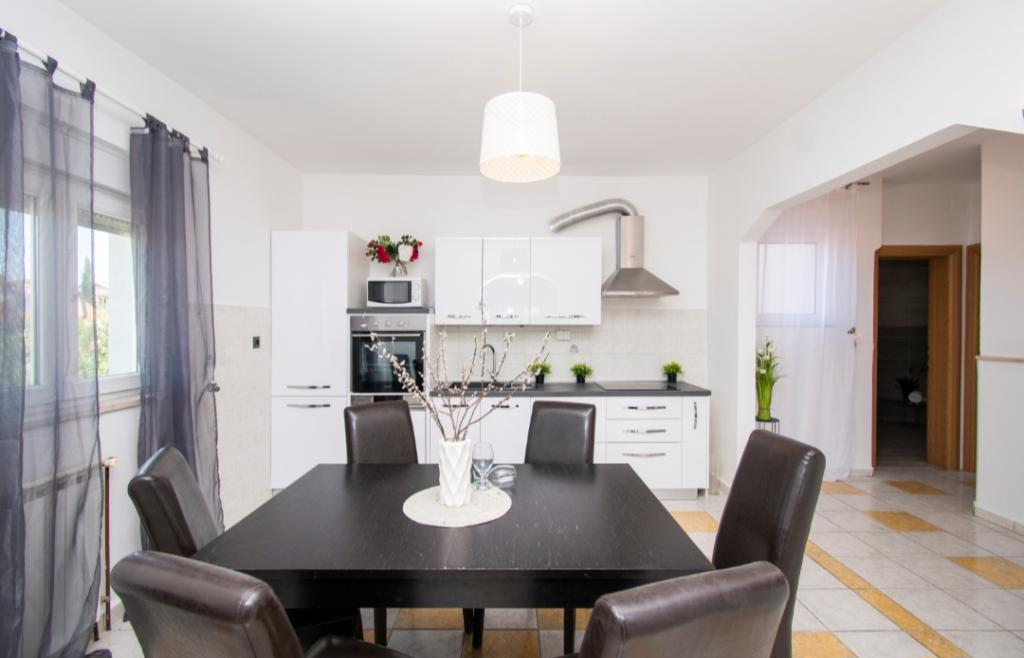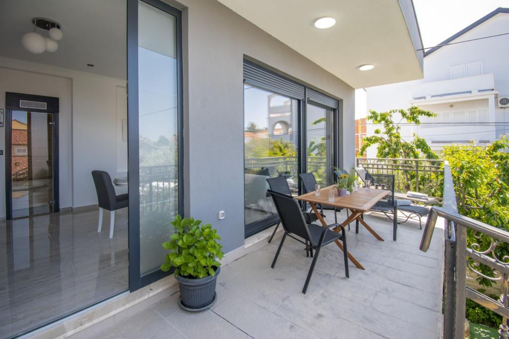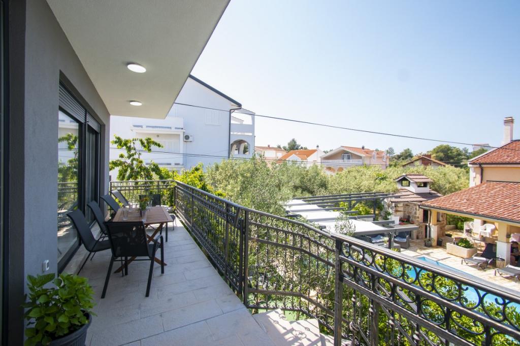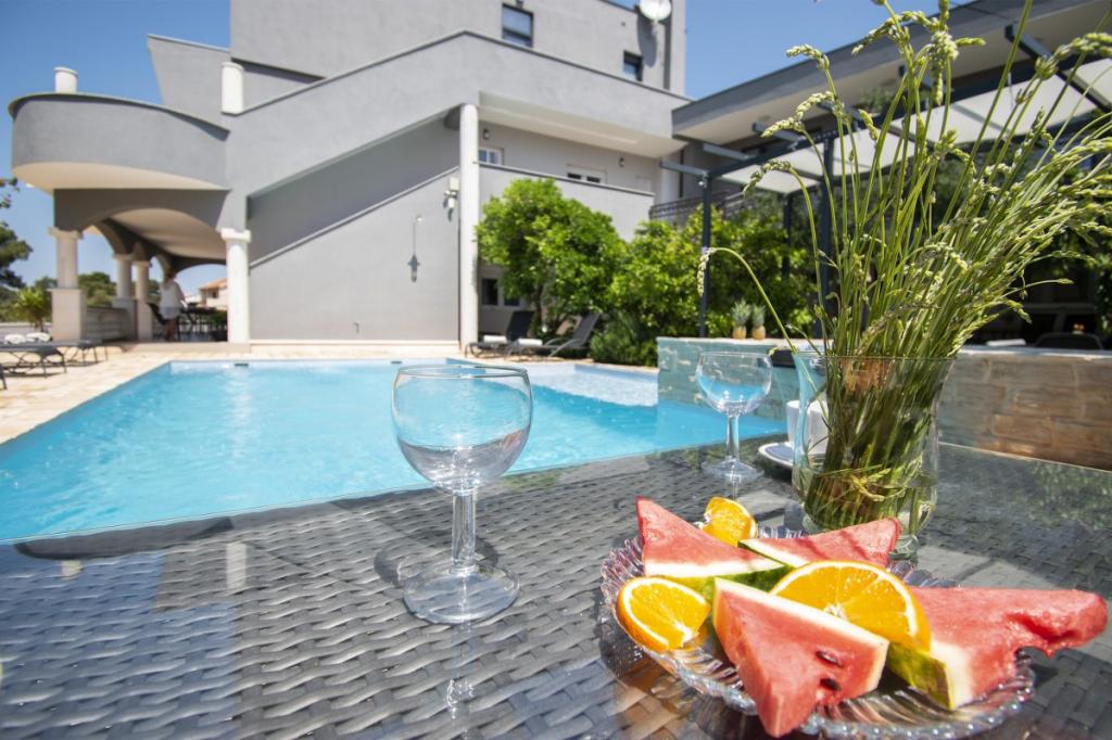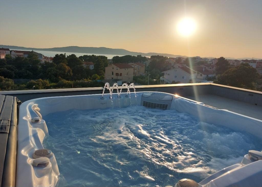 Hiša za 10 oseb z bazenom in jacuzzijem se nahaja v mirnem predelu Brodarice, obdana z veliko zelenja in cvetja. Prva dva apartmaja sta v pritličju, eno ima 45 m2, drugo pa 50 m2. Vsak apartma ima dvoposteljno sobo, kuhinjo, raztegljiv kavč, kopalnico in teraso z mizo in stoli. Tretji apartma meri 90 m2 in se nahaja v prvem nadstropju, ima dve veliki dvoposteljni sobi, veliko dnevno sobo, kuhinjo, kopalnico in 45 m2 veliko teraso z mizo in stoli. Primeren je za malo večjo družino in prijatelje. Apartma je klimatiziran. Četrti apartma je luksuzno urejen, cca 100m2, ima veliko dnevno sobo, popolnoma opremljeno kuhinjo, veliko sobo s televizijo in klimo, apartma ima tudi savno. na strehi je jacuzzi z veliko teraso. vsak apartma ima klimo in vsaka soba ima tudi televizijo. Bazen je skupen. Hiša je od morja oddaljena 5-6 minut hoje. Poleg hiše se nahajata še dva apartmaja, eden je 110m2 luksuzno opremljen, drugi pa 55m2.
