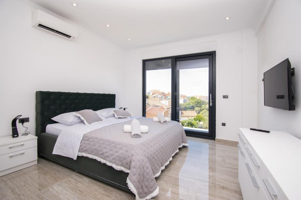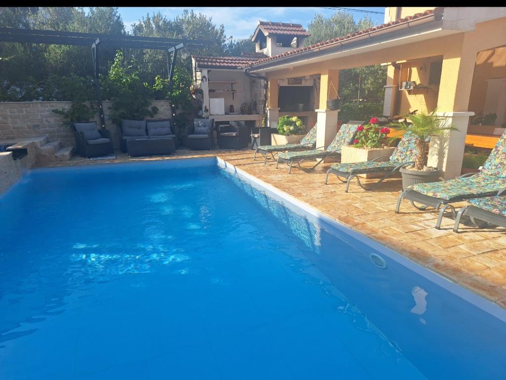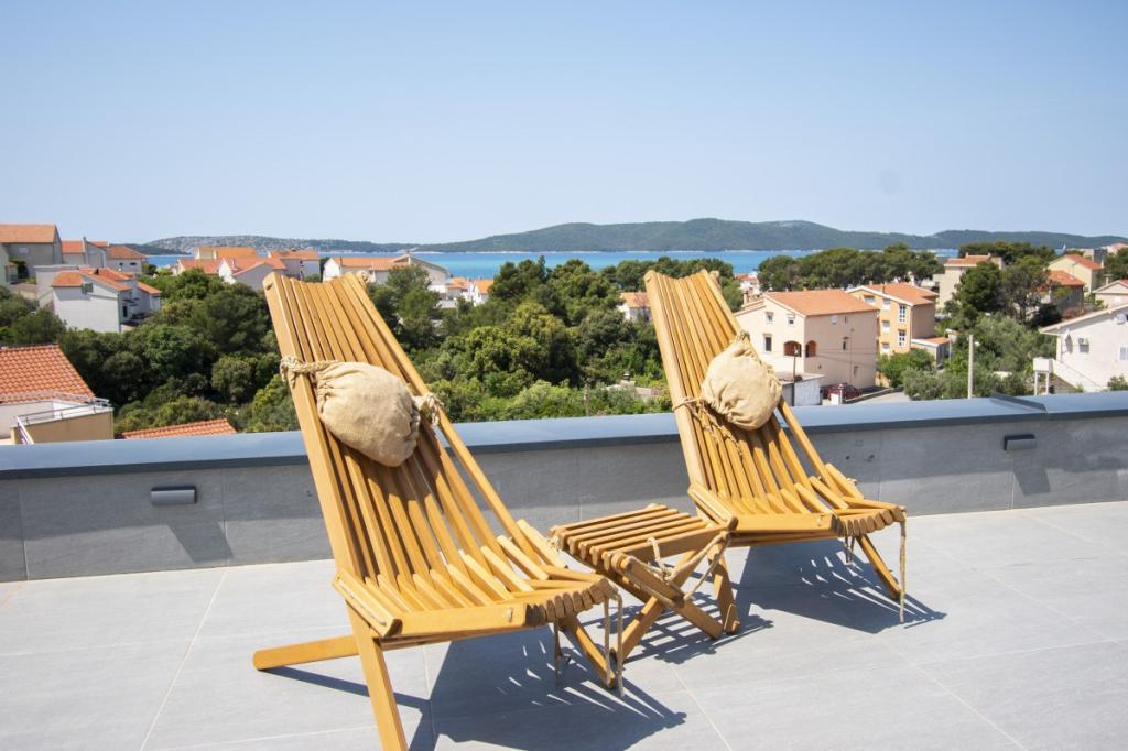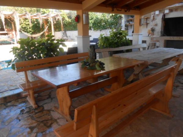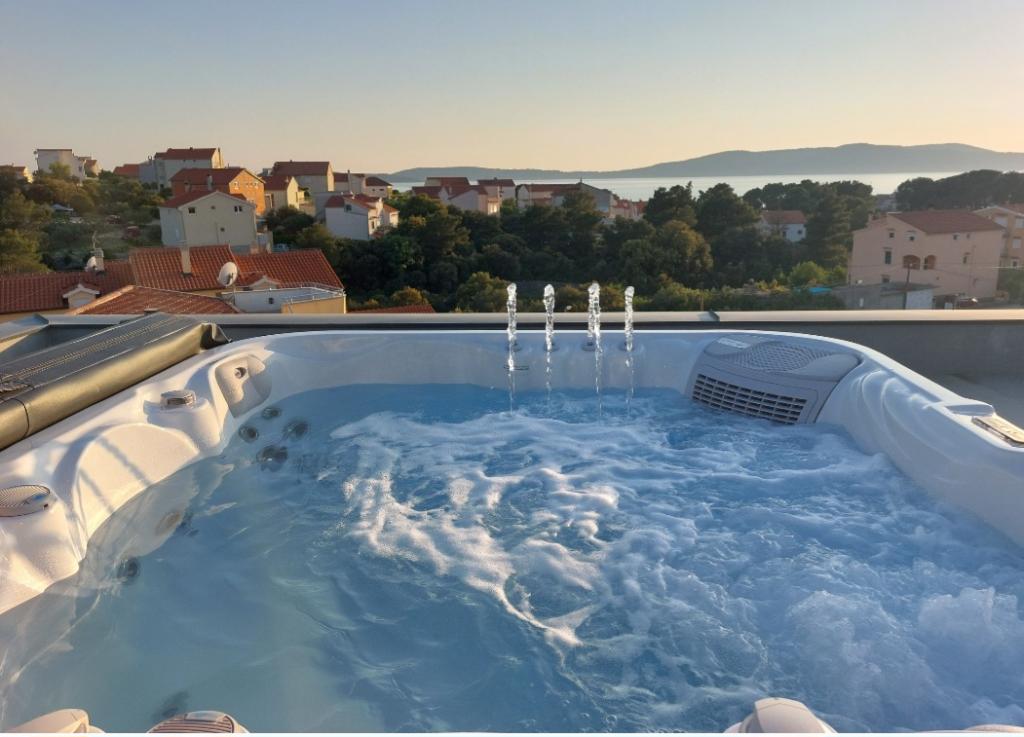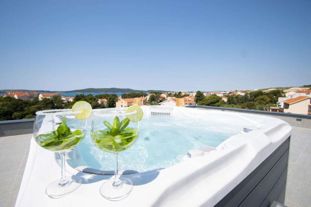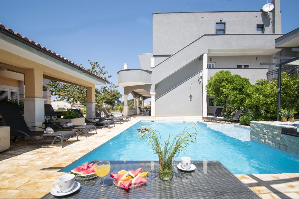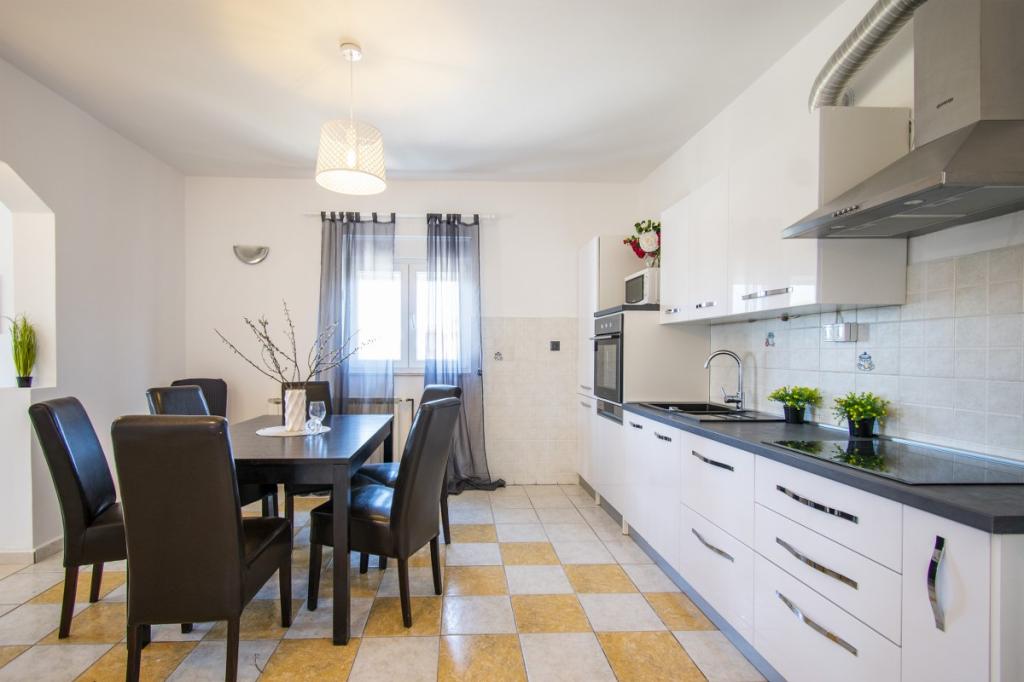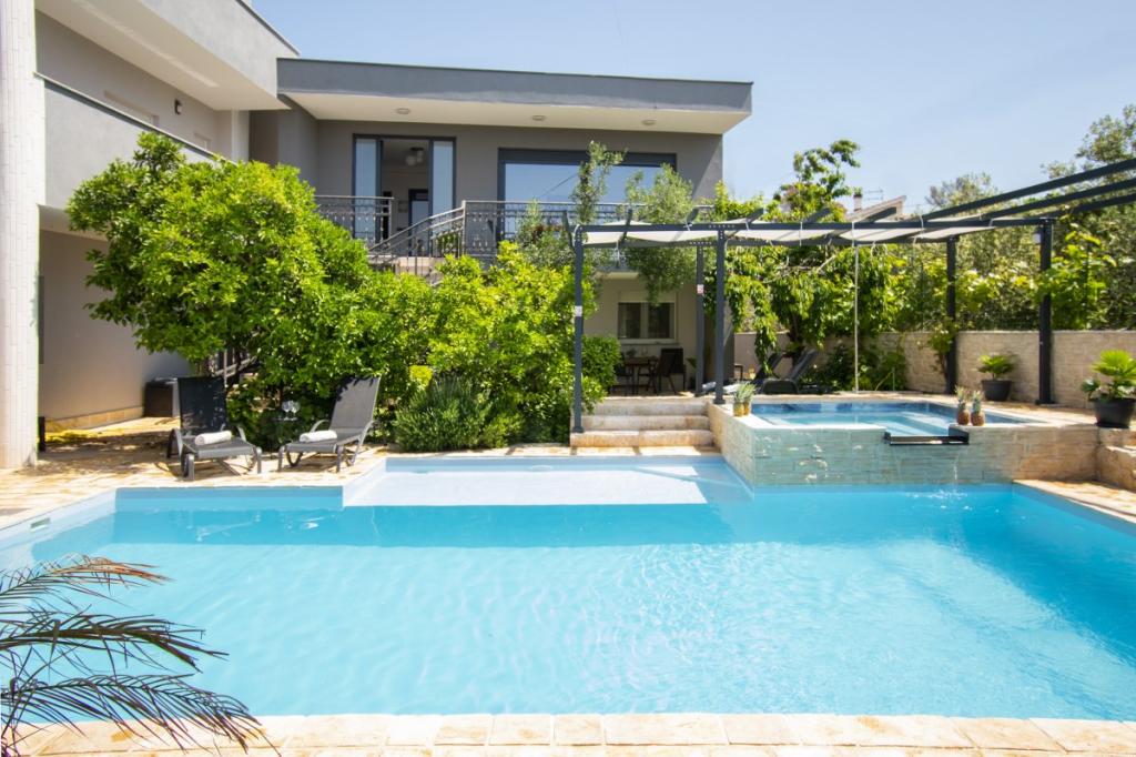 Hiša za 10 oseb z bazenom in jacuzzijem se nahaja v mirnem predelu Brodarice, obdana z veliko zelenja in cvetja. Prva dva apartmaja sta v pritličju, eno ima 45 m2, drugo pa 50 m2. Vsak apartma ima dvoposteljno sobo, kuhinjo, raztegljiv kavč, kopalnico in teraso z mizo in stoli. Tretji apartma meri 90 m2 in se nahaja v prvem nadstropju, ima dve veliki dvoposteljni sobi, veliko dnevno sobo, kuhinjo, kopalnico in 45 m2 veliko teraso z mizo in stoli. Primeren je za malo večjo družino in prijatelje. Apartma je klimatiziran. Četrti apartma je luksuzno urejen, cca 100m2, ima veliko dnevno sobo, popolnoma opremljeno kuhinjo, veliko sobo s televizijo in klimo, apartma ima tudi savno. na strehi je jacuzzi z veliko teraso. vsak apartma ima klimo in vsaka soba ima tudi televizijo. Bazen je skupen. Hiša je od morja oddaljena 5-6 minut hoje. Poleg hiše se nahajata še dva apartmaja, eden je 110m2 luksuzno opremljen, drugi pa 55m2.