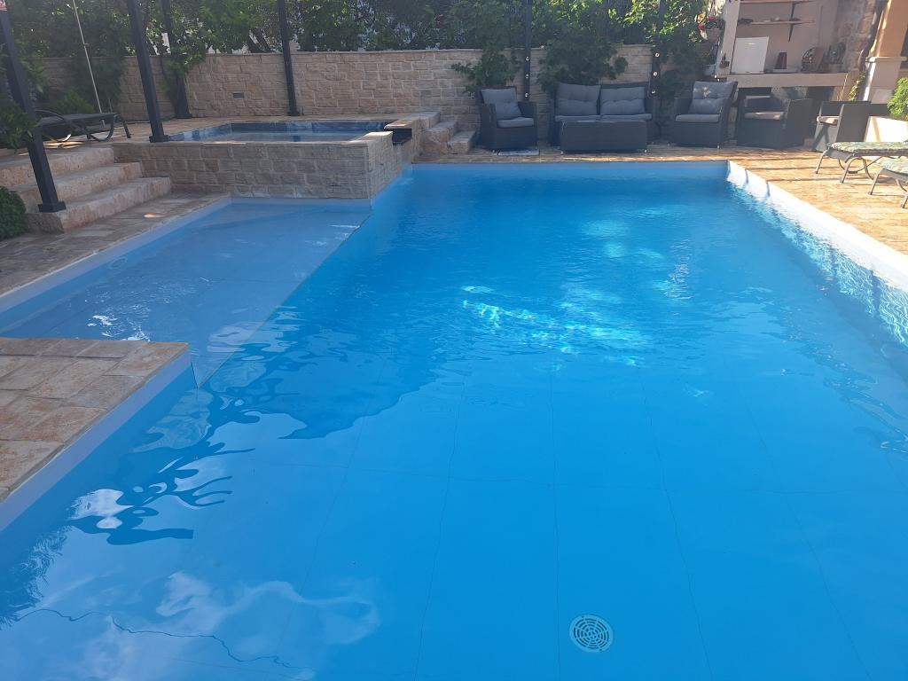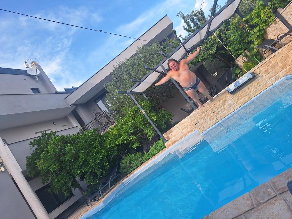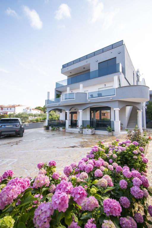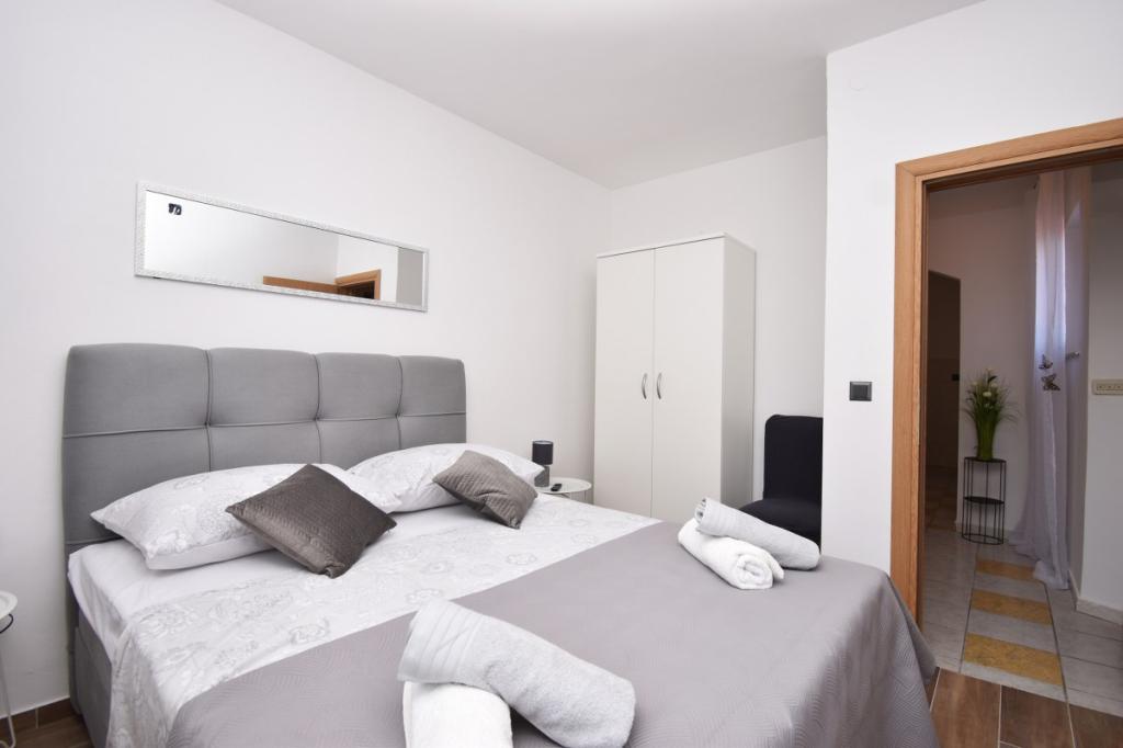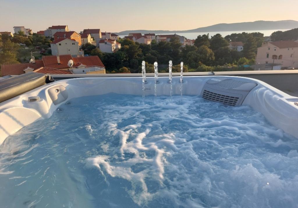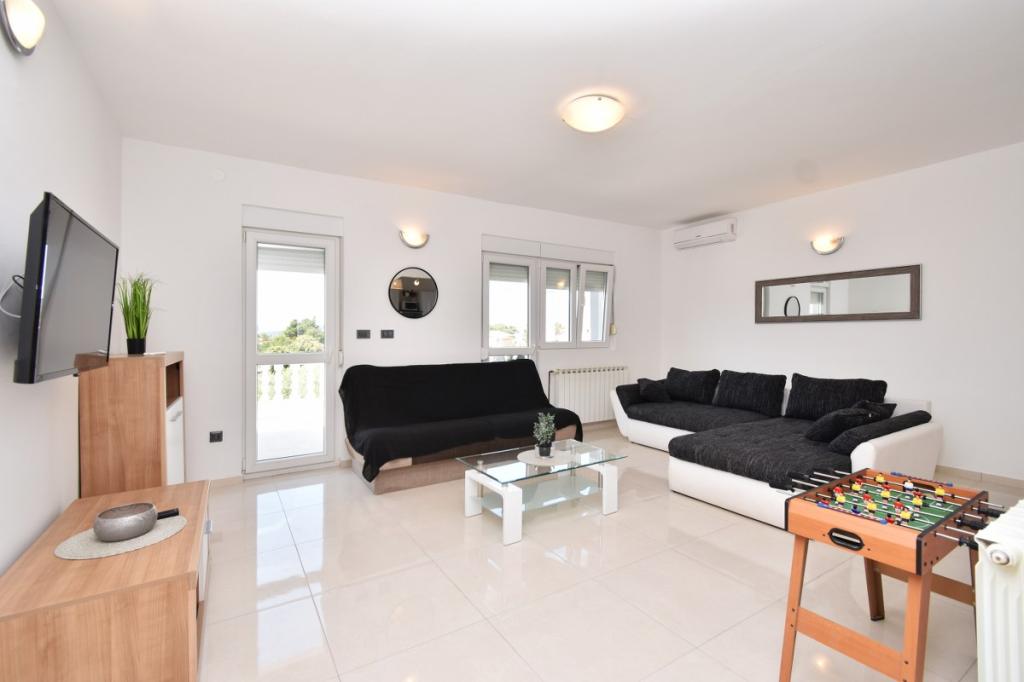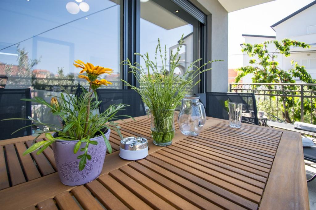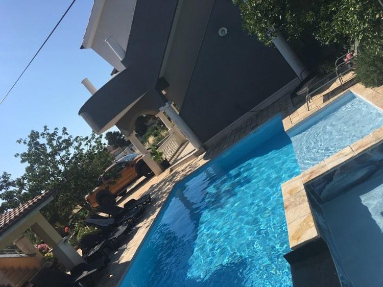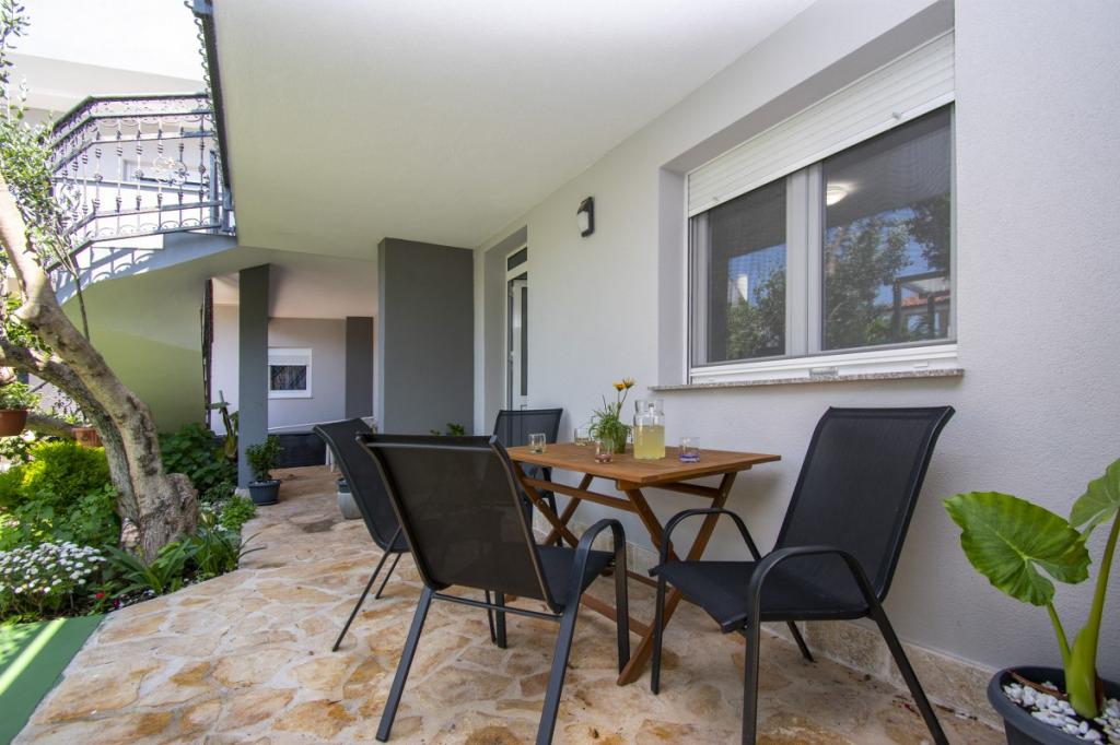 Hiša za 10 oseb z bazenom in jacuzzijem se nahaja v mirnem predelu Brodarice, obdana z veliko zelenja in cvetja. Prva dva apartmaja sta v pritličju, eno ima 45 m2, drugo pa 50 m2. Vsak apartma ima dvoposteljno sobo, kuhinjo, raztegljiv kavč, kopalnico in teraso z mizo in stoli. Tretji apartma meri 90 m2 in se nahaja v prvem nadstropju, ima dve veliki dvoposteljni sobi, veliko dnevno sobo, kuhinjo, kopalnico in 45 m2 veliko teraso z mizo in stoli. Primeren je za malo večjo družino in prijatelje. Apartma je klimatiziran. Četrti apartma je luksuzno urejen, cca 100m2, ima veliko dnevno sobo, popolnoma opremljeno kuhinjo, veliko sobo s televizijo in klimo, apartma ima tudi savno. na strehi je jacuzzi z veliko teraso. vsak apartma ima klimo in vsaka soba ima tudi televizijo. Bazen je skupen. Hiša je od morja oddaljena 5-6 minut hoje. Poleg hiše se nahajata še dva apartmaja, eden je 110m2 luksuzno opremljen, drugi pa 55m2.