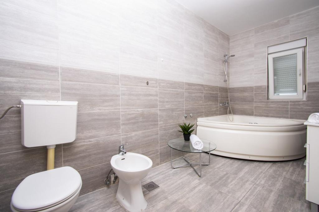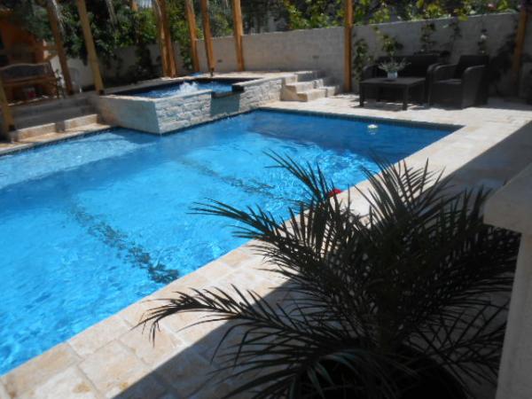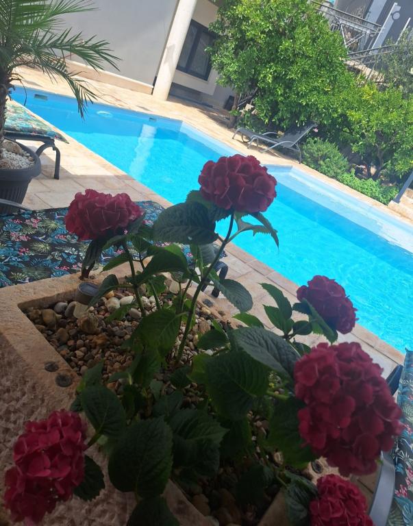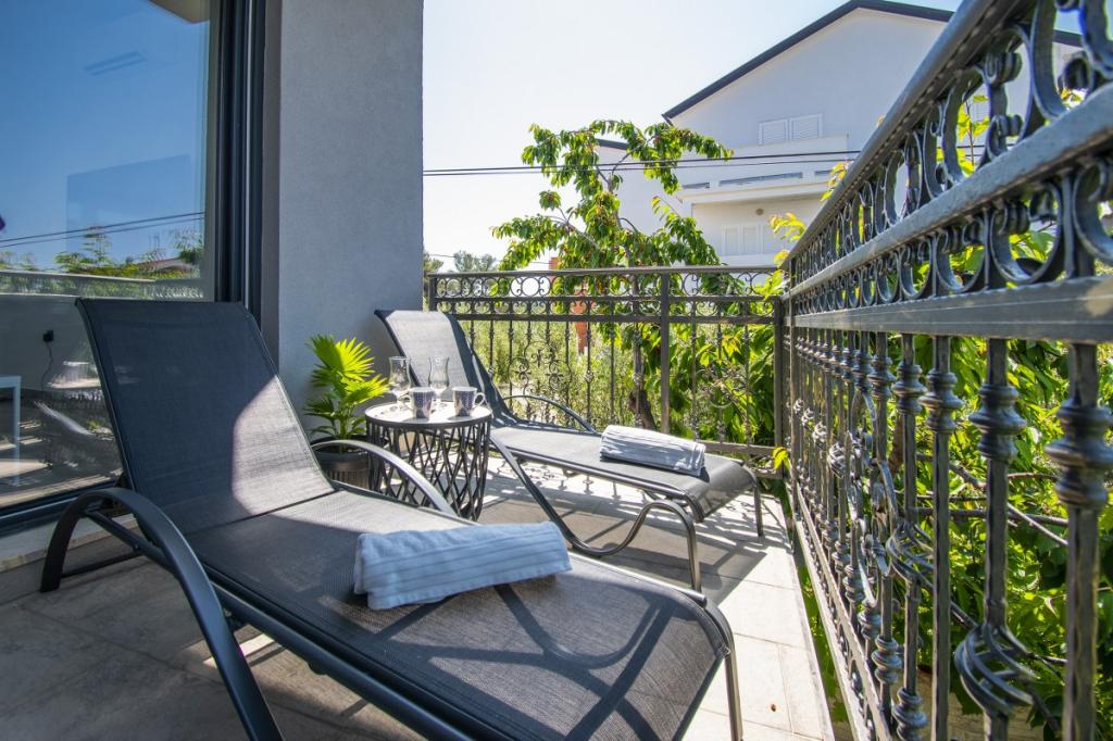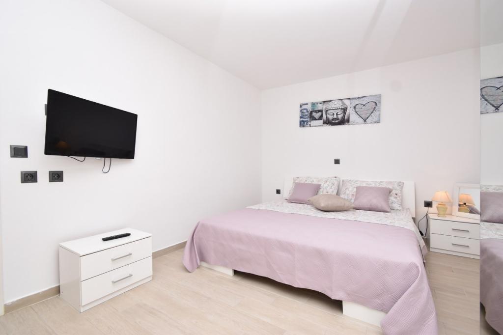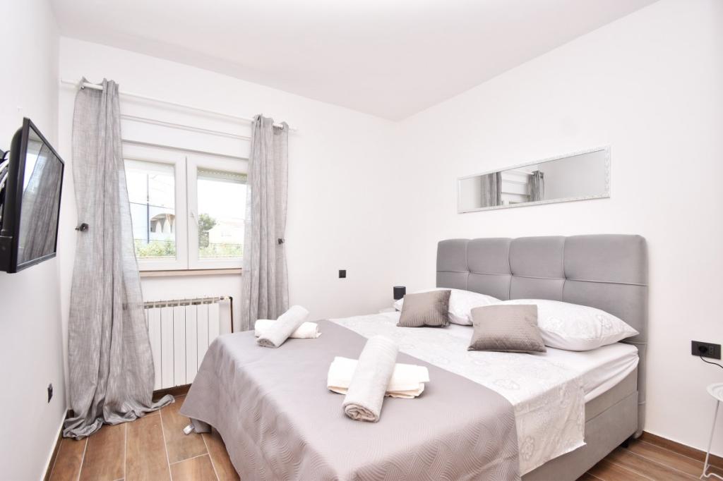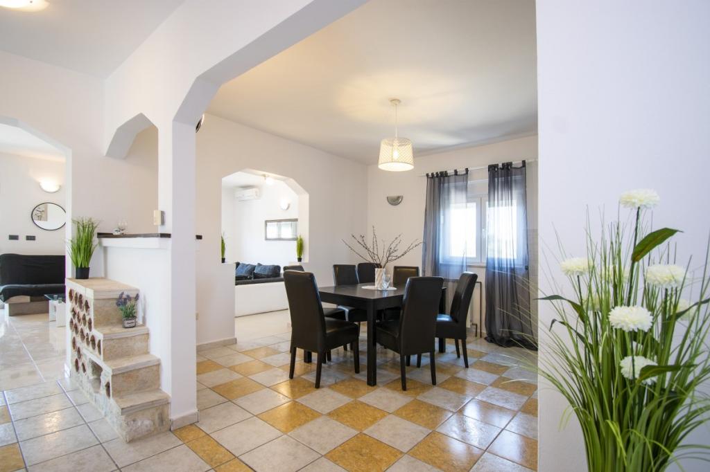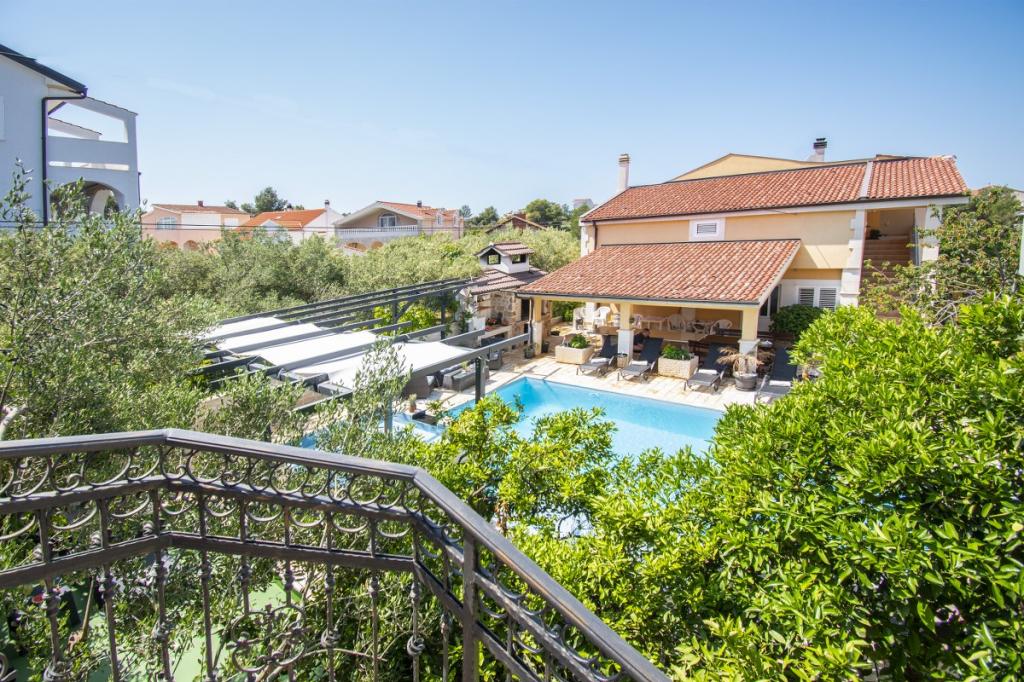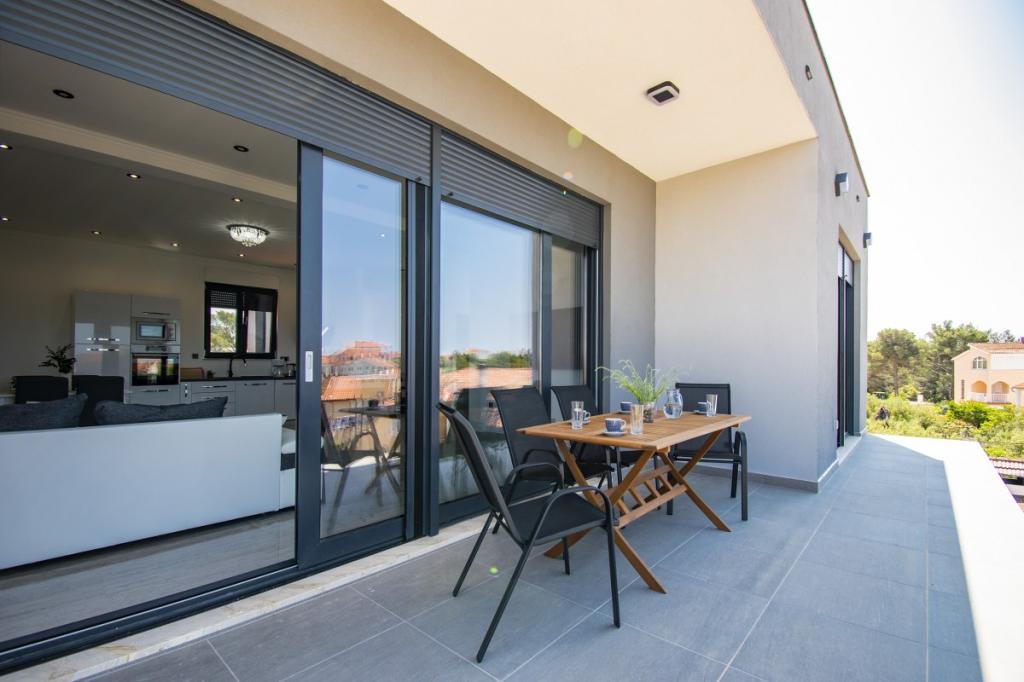 Hiša za 10 oseb z bazenom in jacuzzijem se nahaja v mirnem predelu Brodarice, obdana z veliko zelenja in cvetja. Prva dva apartmaja sta v pritličju, eno ima 45 m2, drugo pa 50 m2. Vsak apartma ima dvoposteljno sobo, kuhinjo, raztegljiv kavč, kopalnico in teraso z mizo in stoli. Tretji apartma meri 90 m2 in se nahaja v prvem nadstropju, ima dve veliki dvoposteljni sobi, veliko dnevno sobo, kuhinjo, kopalnico in 45 m2 veliko teraso z mizo in stoli. Primeren je za malo večjo družino in prijatelje. Apartma je klimatiziran. Četrti apartma je luksuzno urejen, cca 100m2, ima veliko dnevno sobo, popolnoma opremljeno kuhinjo, veliko sobo s televizijo in klimo, apartma ima tudi savno. na strehi je jacuzzi z veliko teraso. vsak apartma ima klimo in vsaka soba ima tudi televizijo. Bazen je skupen. Hiša je od morja oddaljena 5-6 minut hoje. Poleg hiše se nahajata še dva apartmaja, eden je 110m2 luksuzno opremljen, drugi pa 55m2.