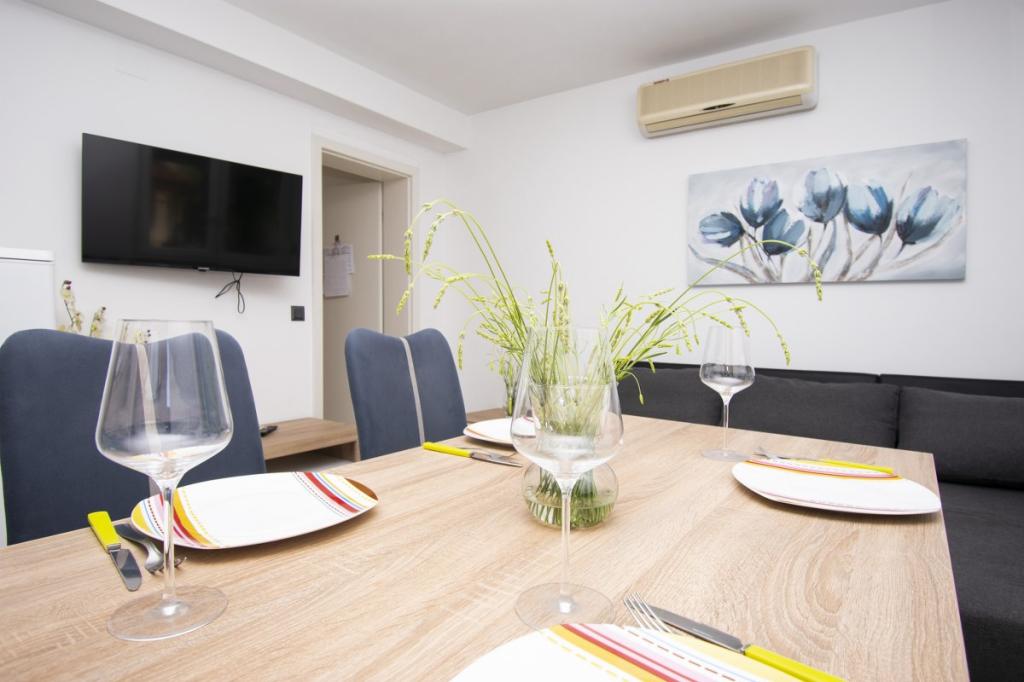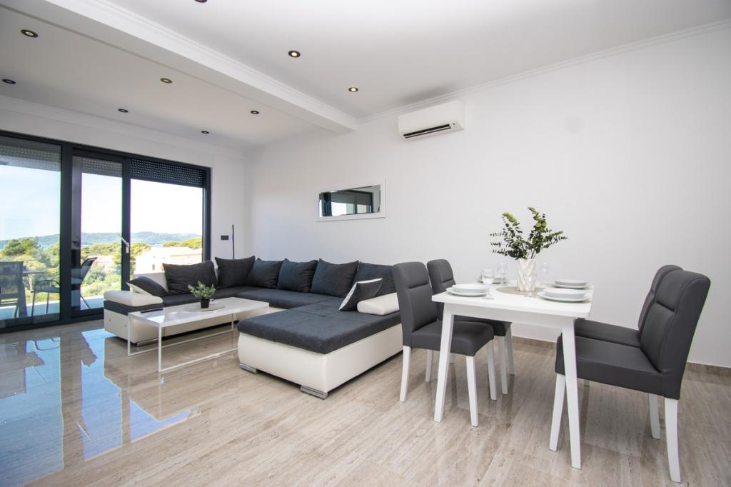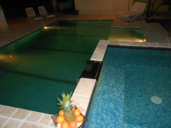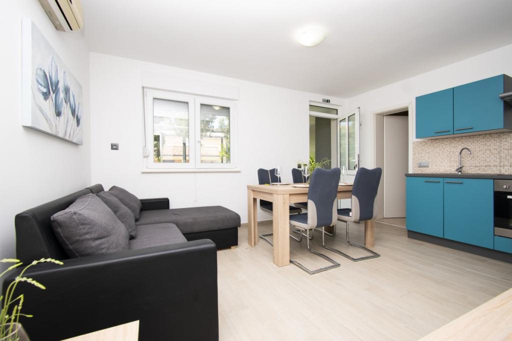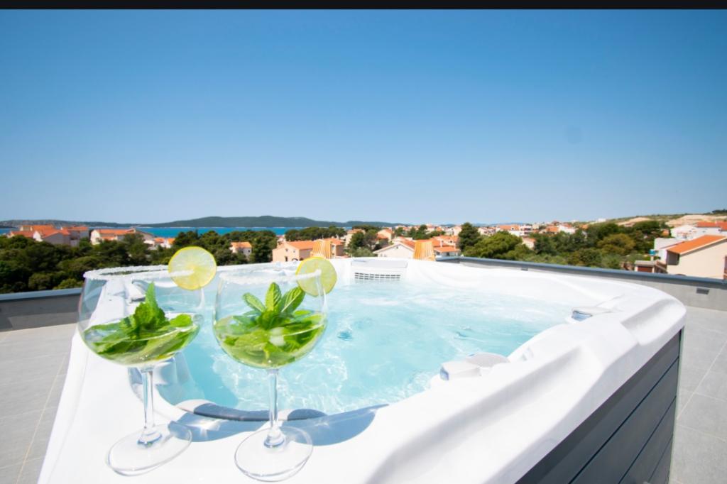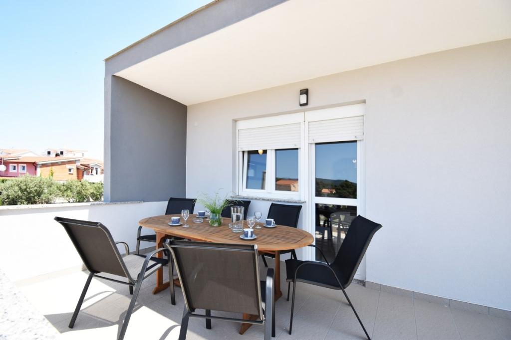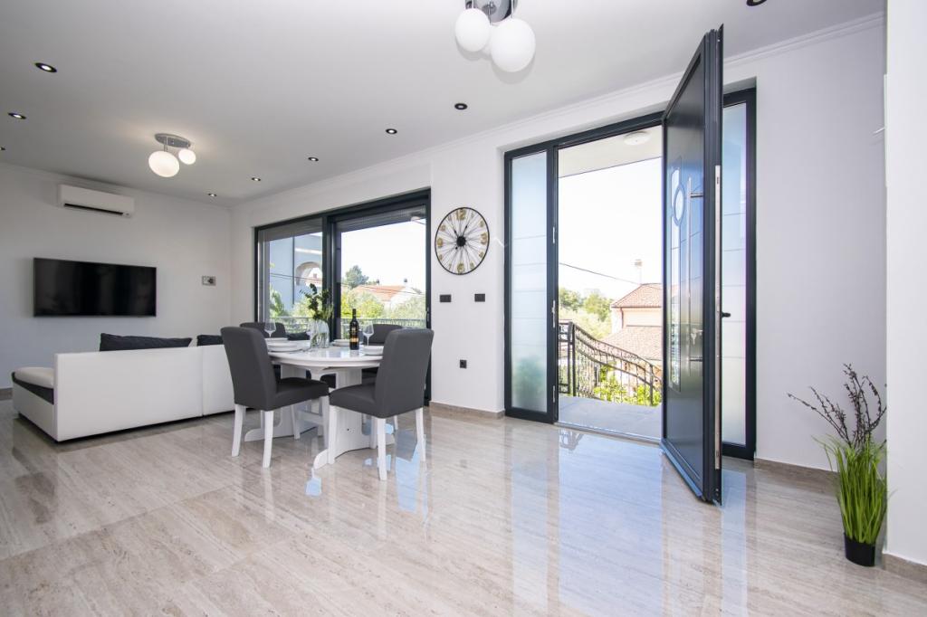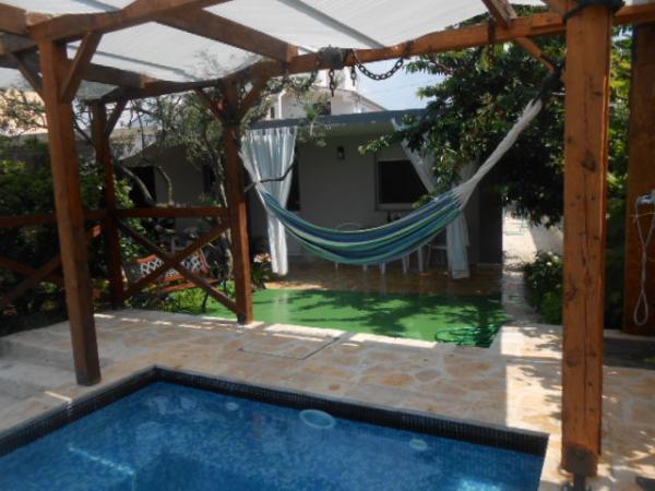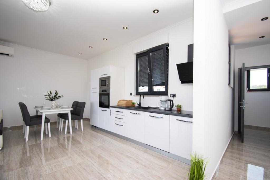 Hiša za 10 oseb z bazenom in jacuzzijem se nahaja v mirnem predelu Brodarice, obdana z veliko zelenja in cvetja. Prva dva apartmaja sta v pritličju, eno ima 45 m2, drugo pa 50 m2. Vsak apartma ima dvoposteljno sobo, kuhinjo, raztegljiv kavč, kopalnico in teraso z mizo in stoli. Tretji apartma meri 90 m2 in se nahaja v prvem nadstropju, ima dve veliki dvoposteljni sobi, veliko dnevno sobo, kuhinjo, kopalnico in 45 m2 veliko teraso z mizo in stoli. Primeren je za malo večjo družino in prijatelje. Apartma je klimatiziran. Četrti apartma je luksuzno urejen, cca 100m2, ima veliko dnevno sobo, popolnoma opremljeno kuhinjo, veliko sobo s televizijo in klimo, apartma ima tudi savno. na strehi je jacuzzi z veliko teraso. vsak apartma ima klimo in vsaka soba ima tudi televizijo. Bazen je skupen. Hiša je od morja oddaljena 5-6 minut hoje. Poleg hiše se nahajata še dva apartmaja, eden je 110m2 luksuzno opremljen, drugi pa 55m2.