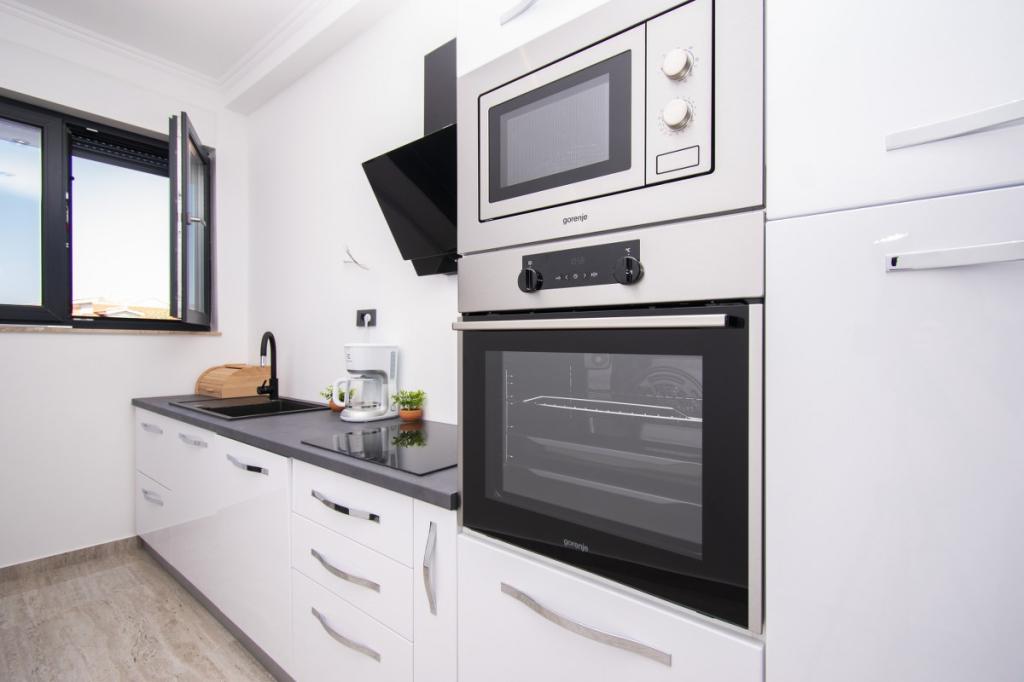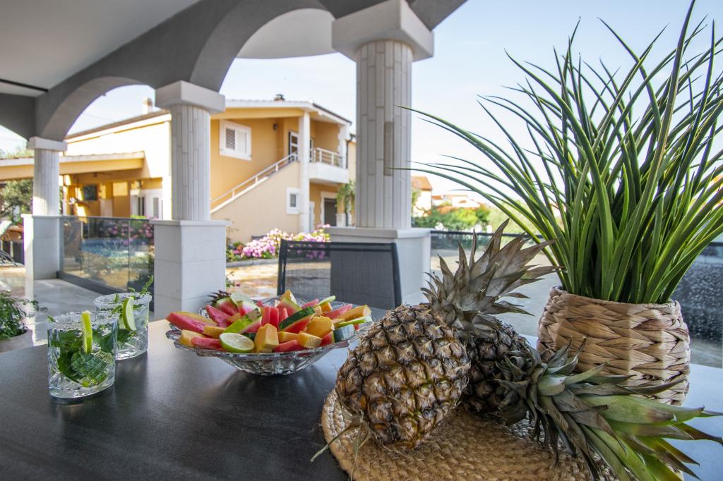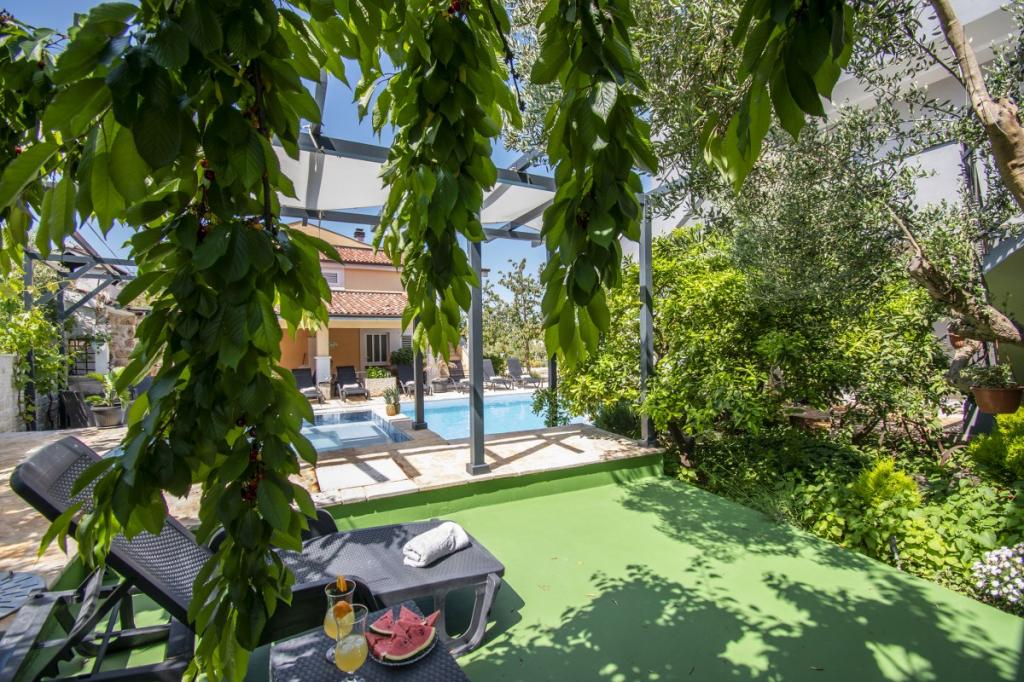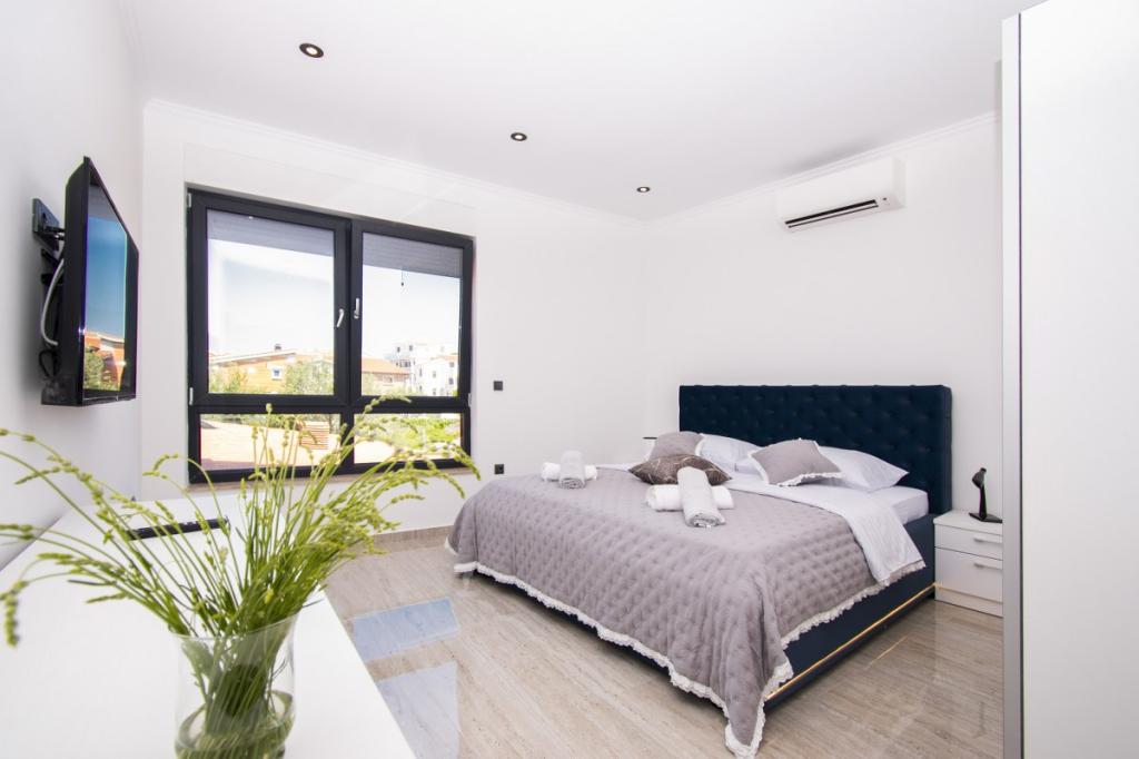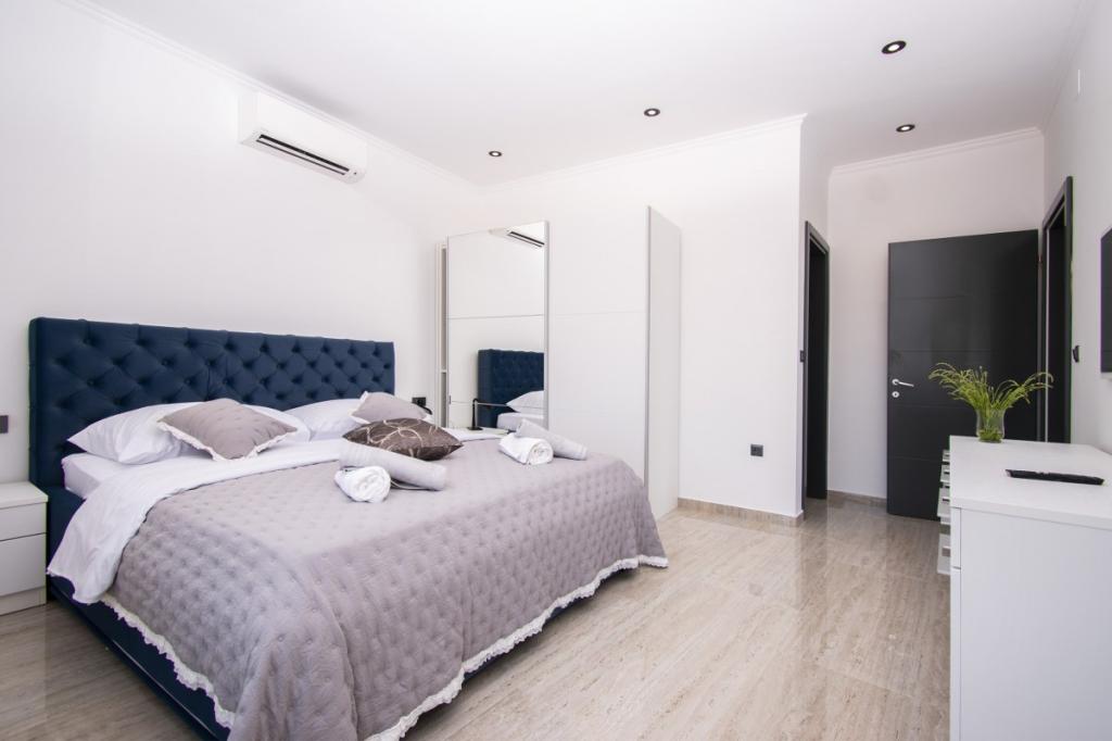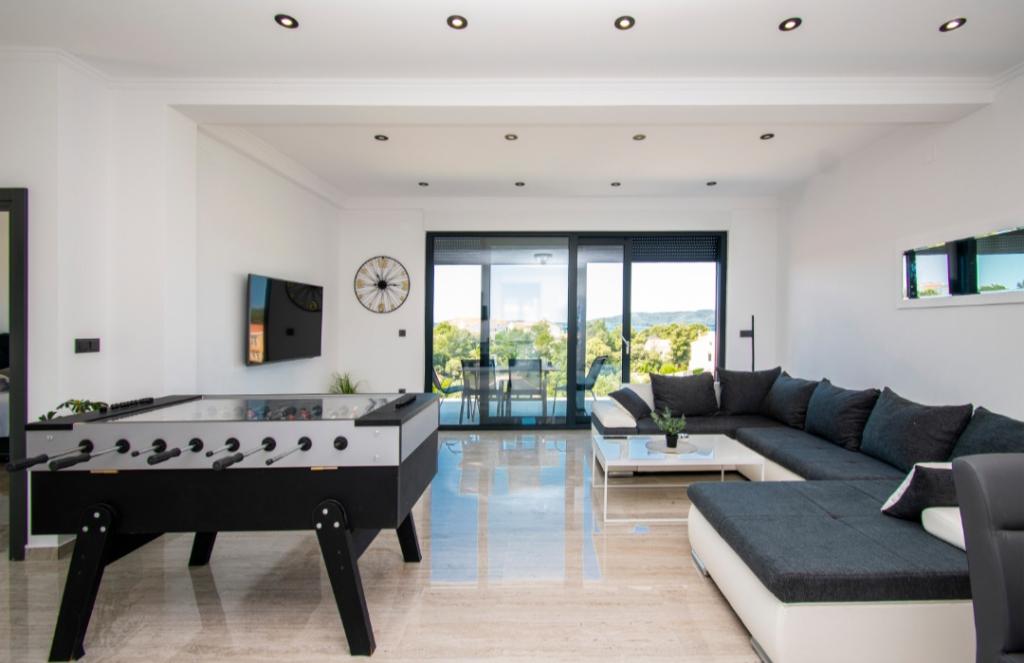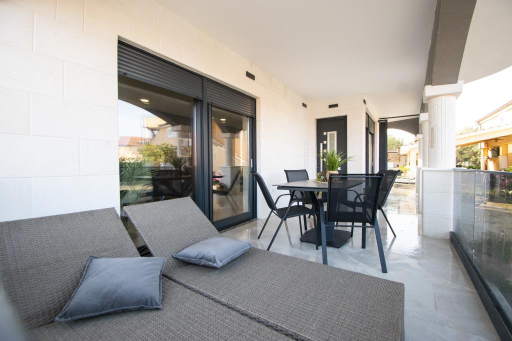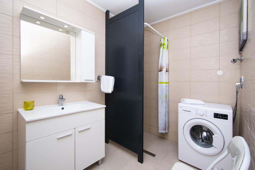 Hiša za 10 oseb z bazenom in jacuzzijem se nahaja v mirnem predelu Brodarice, obdana z veliko zelenja in cvetja. Prva dva apartmaja sta v pritličju, eno ima 45 m2, drugo pa 50 m2. Vsak apartma ima dvoposteljno sobo, kuhinjo, raztegljiv kavč, kopalnico in teraso z mizo in stoli. Tretji apartma meri 90 m2 in se nahaja v prvem nadstropju, ima dve veliki dvoposteljni sobi, veliko dnevno sobo, kuhinjo, kopalnico in 45 m2 veliko teraso z mizo in stoli. Primeren je za malo večjo družino in prijatelje. Apartma je klimatiziran. Četrti apartma je luksuzno urejen, cca 100m2, ima veliko dnevno sobo, popolnoma opremljeno kuhinjo, veliko sobo s televizijo in klimo, apartma ima tudi savno. na strehi je jacuzzi z veliko teraso. vsak apartma ima klimo in vsaka soba ima tudi televizijo. Bazen je skupen. Hiša je od morja oddaljena 5-6 minut hoje. Poleg hiše se nahajata še dva apartmaja, eden je 110m2 luksuzno opremljen, drugi pa 55m2.