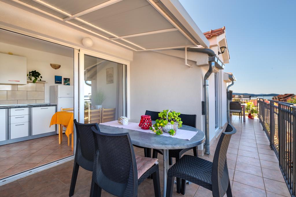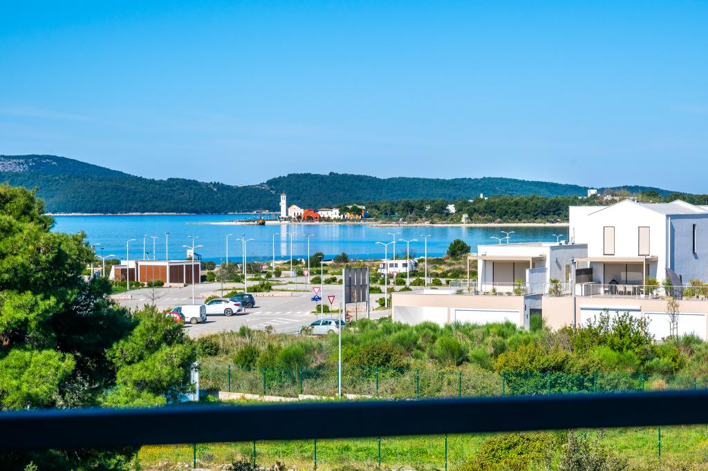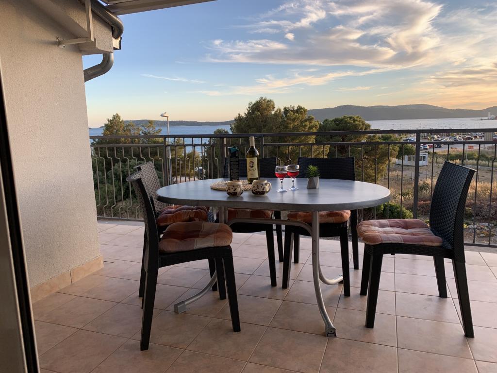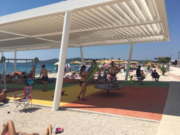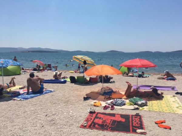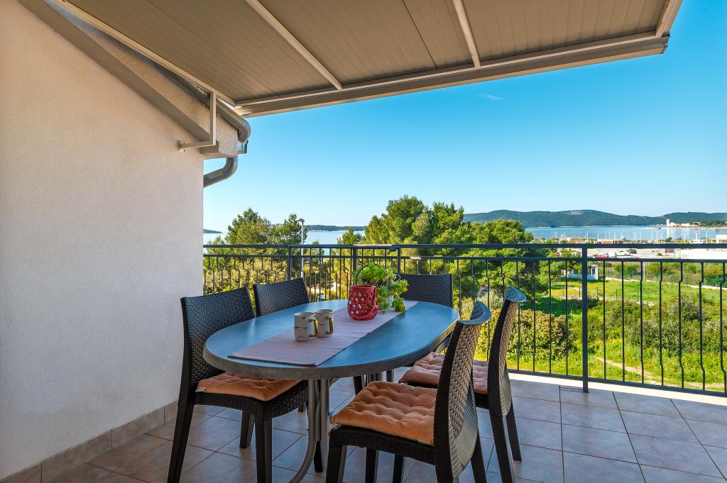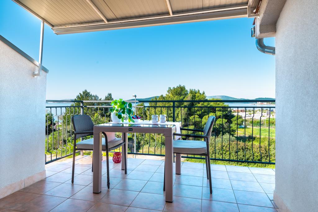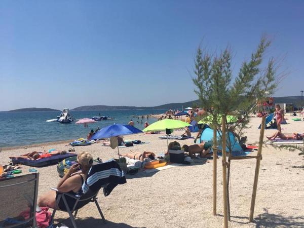 Apartma v lepem delu Brodarice. Pogled s terase na plažo. veliko parkirišče. Žar na dvorišču. poleg žara je tudi večerna miza v bližini vseh spremljajočih objektov. Solaris, Šibenik Narodni parki Krka in Kornati Oscilacijski centri, otroško igrišče